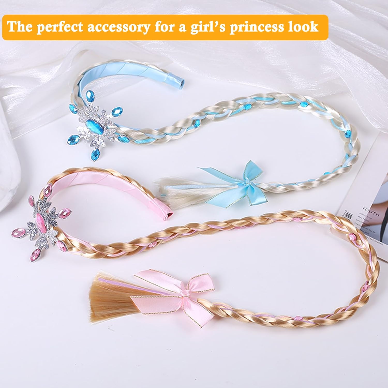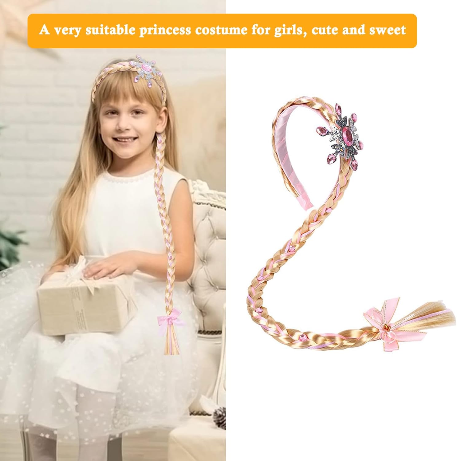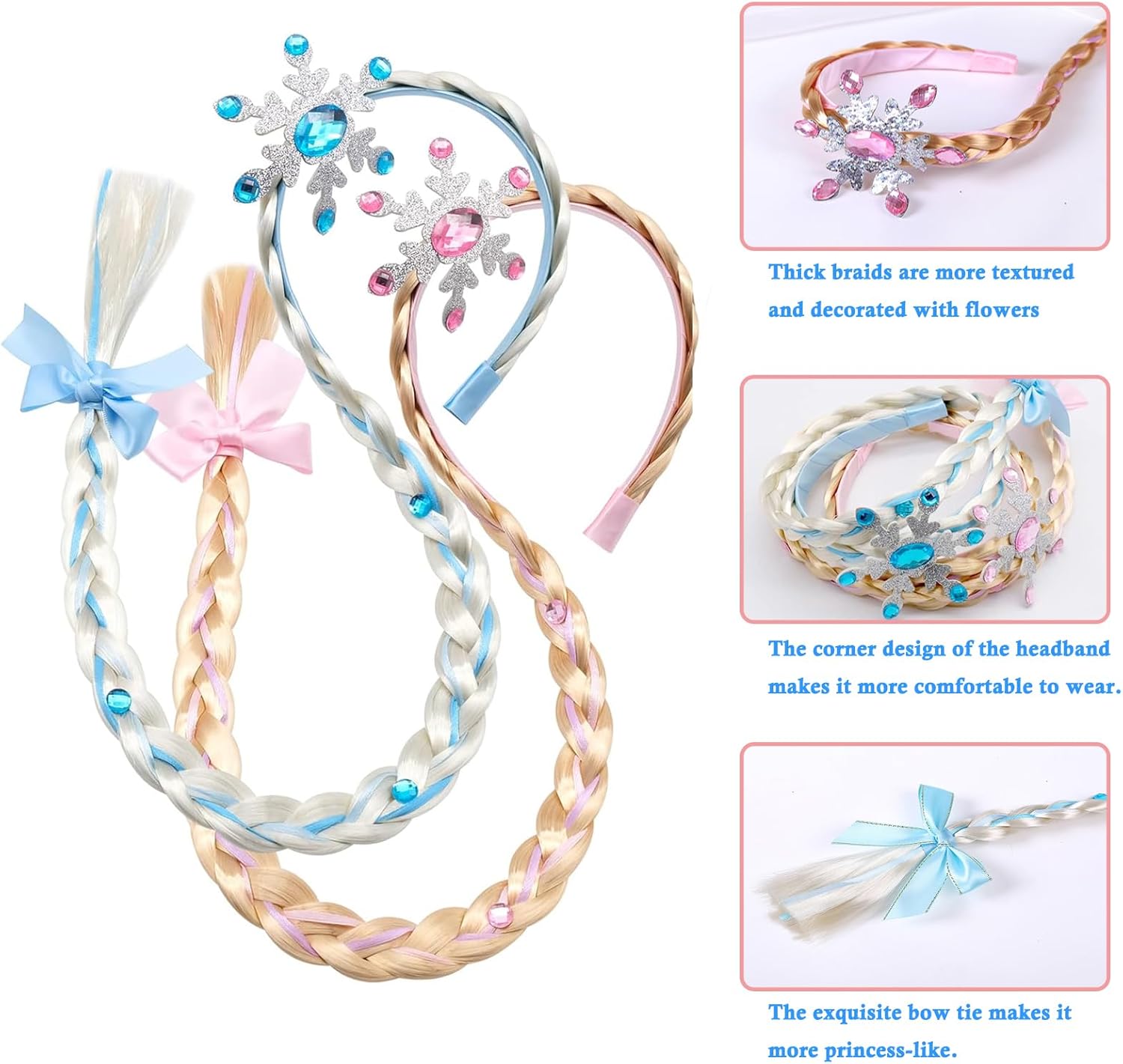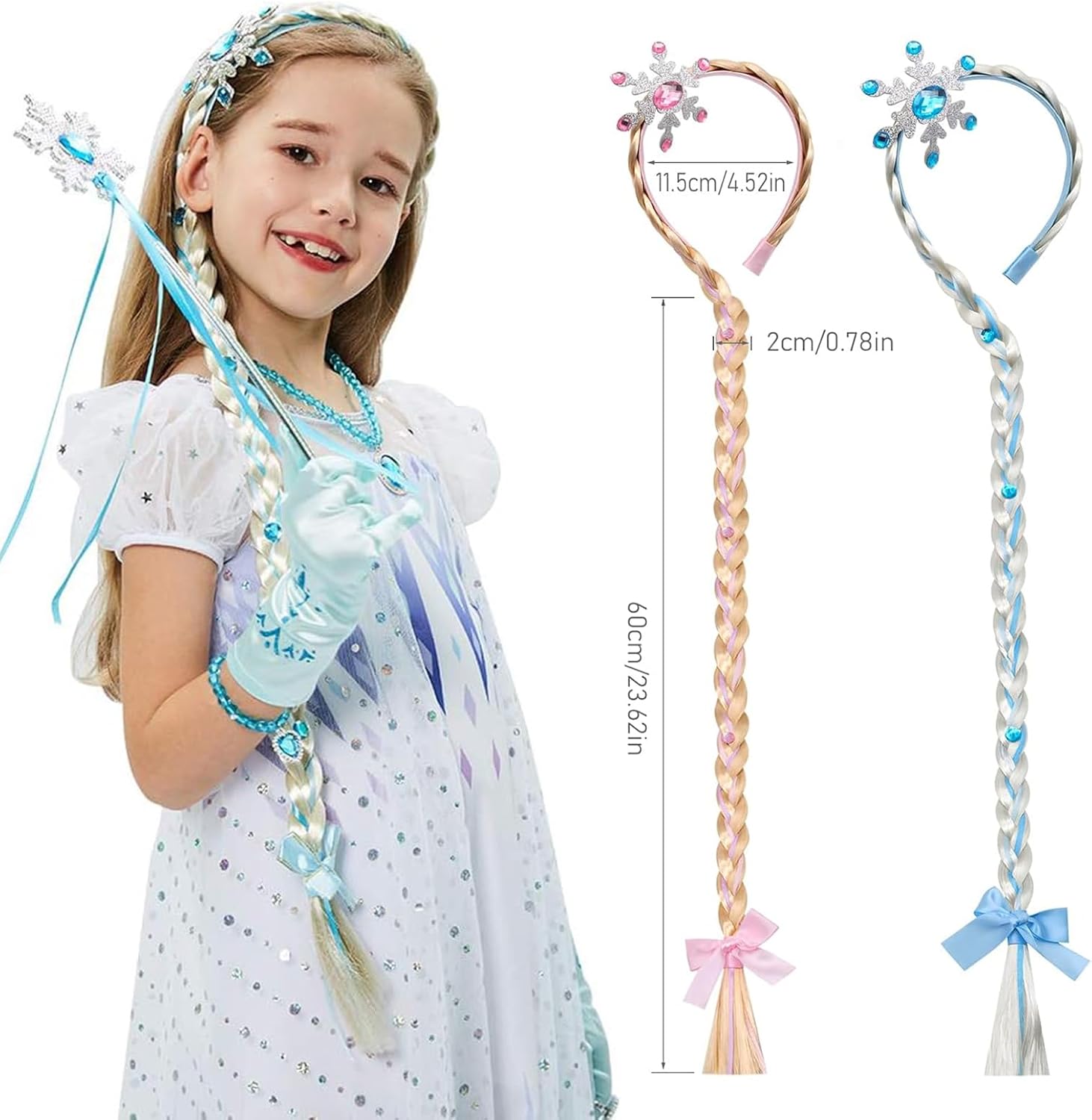 Materiale di Prima Qualità: La fascia per capelli con treccia da principessa è realizzata in fibre sintetiche ecologiche, che garantiscono sicurezza e assenza di odori. Queste parrucche ad archetto sono facili da indossare, non dovete preoccuparvi di danneggiare i capelli della vostra bambina. Principessa Delle Favole: Riceverete Parrucca da principessa per bambini 2 pezzi di parrucchino simpatico sono rosa e blu. La parrucca da principessa è composta da una parrucca platino, fiori e fiocchi di neve scintillanti. Taglia Della Parrucca: La lunghezza della parrucca è di circa 60 cm, il diametro del cerchietto è di circa 4,5 pollici, consigliato per bambini di 3-7 anni. Molto delicata e carina, è l'accessorio perfetto per le bambine per vestirsi da principessa. Ampie Applicazioni: Il nostro foulard intrecciato Parrucche lunghe intrecciate da principessa è perfetto per gli outfit da principessa delle ragazze, carino e dolce, perfetto per vestire cosplay, feste di compleanno, club, carnevali, festival musicali, parchi a tema, ecc. Regalo Perfetto: Nel mondo dell'animazione, ogni ragazza si sente una vera principessa. I gioielli per capelli da principessa sono il miglior regalo per le bambine che vogliono diventare principesse durante i festival o le feste. Farà sì che la vostra bambina si distingua dalla massa!