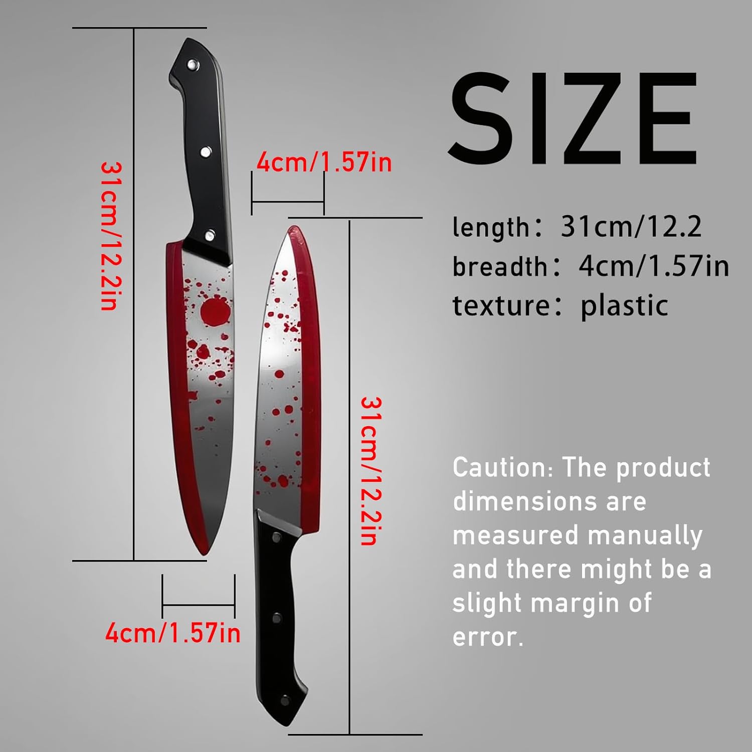 Effetti gore realistici di coltello giocattolo halloween. I nostri oggetti di scena coltello finto con sangue misurano 31 cm x 4 cm e presentano realistici effetti di sangue finto e colature, rendendoli indistinguibili sotto l'illuminazione. Esaltano istantaneamente l'effetto drammatico del tuo costume spettrale. Materiali sicuri e oggetti di scena versatili e comici. I nostri oggetti di scena coltello giocattolo halloween sono realizzati interamente in plastica di alta qualità, senza spigoli vivi, il che li rende sicuri sia per adulti che per bambini. Goditi le riunioni di famiglia senza il rischio di macchie di sangue, permettendoti di goderti feste spettrali. Questo coltelli halloween è leggero, versatile e facile da usare. Questo halloween accessori è estremamente leggero e facile da impugnare e maneggiare. È perfetto per feste di Halloween, feste a tema horror, spettacoli teatrali, costumi da pirata, zombie, clown, vampiri e altri costumi. È perfetto anche per cosplay o servizi fotografici. Un accessorio ideale per Halloween. Questo realistico coltello halloween (set di coltelli insanguinati) elimina il fastidio della pulizia e può essere riutilizzato alle feste. Non c'è bisogno di preoccuparsi di pulire il "sangue" appiccicoso. È un modo semplice ed efficiente per creare un'atmosfera festosa. Creatori di atmosfera festosa. I nostri coltello finto halloween sono più di semplici Arma Finta: sono la chiave per creare un'atmosfera spettrale alla tua festa. Crea momenti di urla e risate. Questo set accessori halloween (decorazioni per halloween) è il regalo perfetto per Halloween.