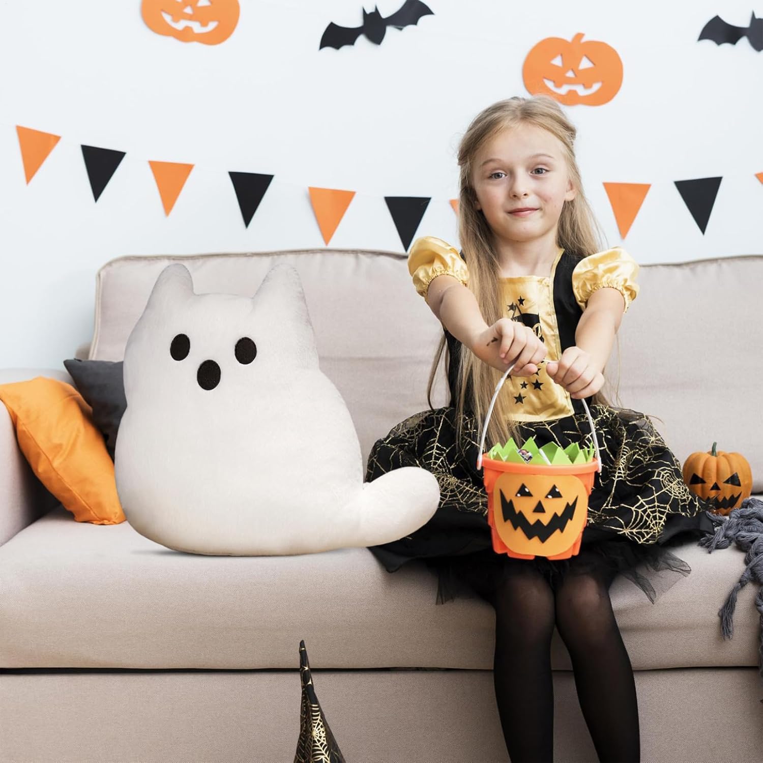 Dimensioni perfette per qualsiasi spazio: la dimensione comoda del cuscino adatta perfettamente a divani, letti e divani senza schiacciare il tuo spazio, rendendolo un'ottima aggiunta a qualsiasi tiro e collezione di Halloween Cute Morbida peluche bianca: realizzato con tessuto peluche bianco ultra-morbido, questo cuscino incredibile comfort e un'atmosfera accogliente, rendendolo ideale per coccole sul tuo letto, divano o divano durante le fredde notti autunnali Facile cure: realizzato con materiali, questo cuscino mantiene la sua forma e morbidezza nel tempo ed è facile da pulire, assicurando che rimanga fresco e invitante durante la stagione di Halloween Adorabile fascino di Halloween: questo cuscino per fantasmi presenta un grazioso design fantasma a forma di gatto che porta immediatamente lo spirito di Halloween a casa tua, perfetto per creare un'atmosfera divertente e inquietante in qualsiasi stanza Decorazione interna versatile: progettata come una decorazione di Halloween per uso interno, completa il tuo decorativo stagionale senza sforzo e illumina i salotti, le camere da letto o le aree salotto con un tema giocoso fantasma