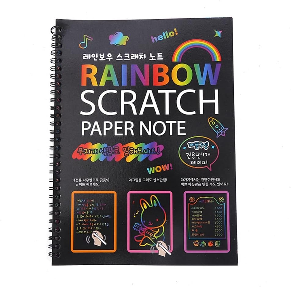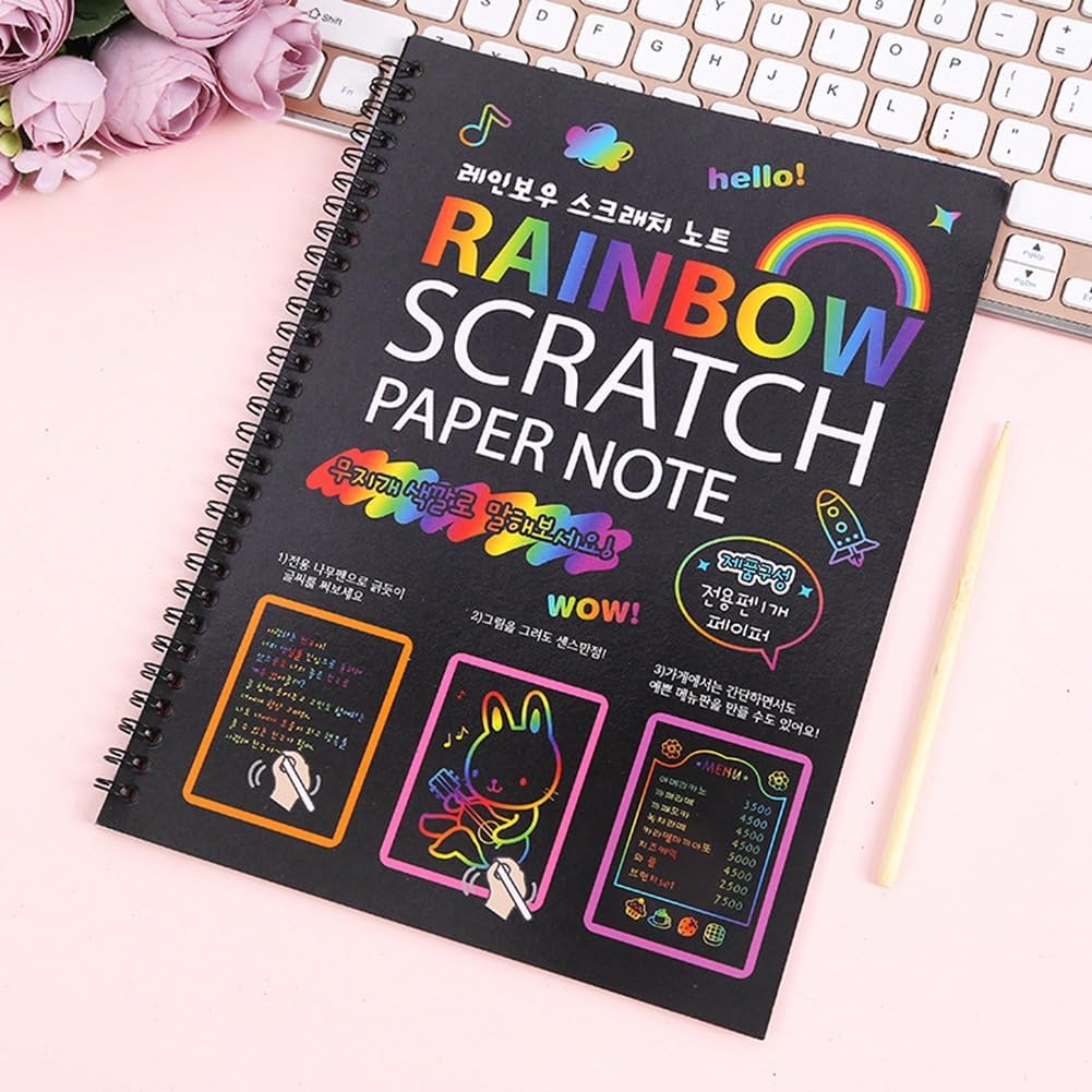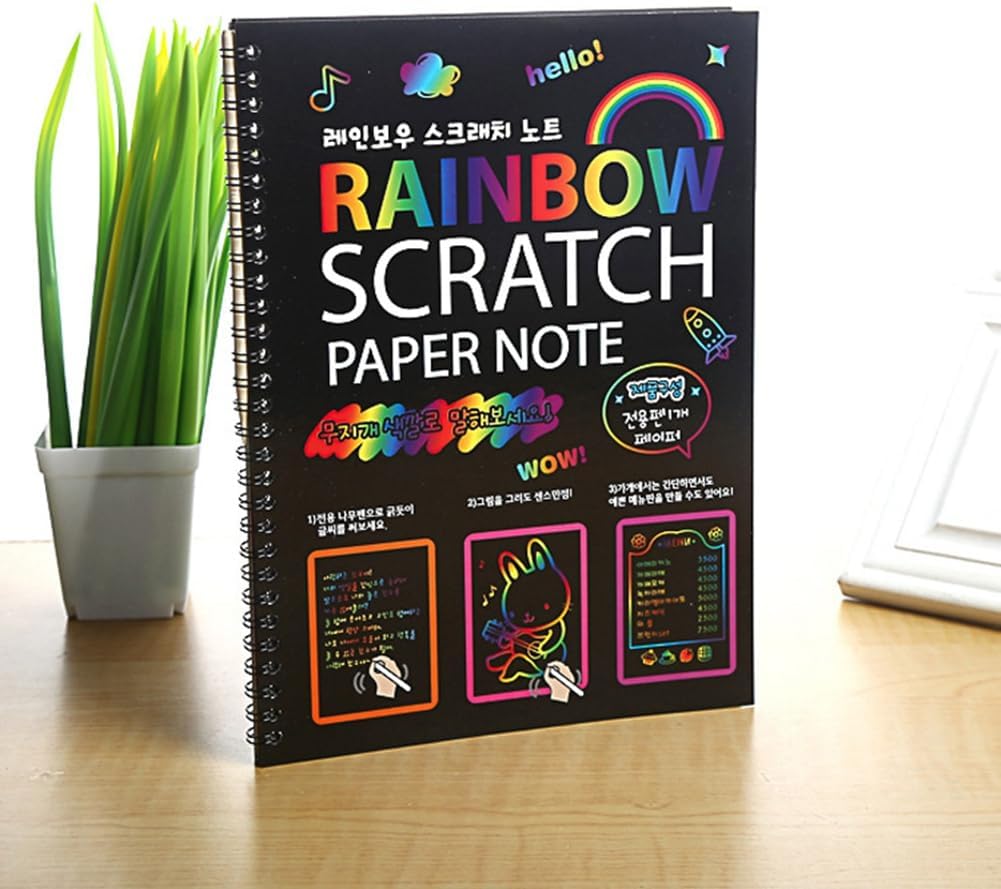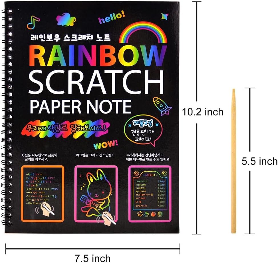 Combo di quaderni Scratch Rainbow Arts dai colori vivaci: include 12 pagine rilegate a spirale e 2 penne in legno. (confezione da 10 pagine x 2, dimensioni: 10,2 x 7,5 pollici), i nostri foglietti presentano colori vivaci che si nascondono il rivestimento opaco; I bambini utilizzano semplicemente lo stilo in legno incluso per rivelarli con un semplice graffio. È un ottimo modo per incoraggiare i tuoi figli a scrivere note divertenti e disegnare immagini l' per l'altro, per friend e familiari. Facile da usare: non è necessario dipingere, gratta direttamente la superficie della carta nera da grattare con lo stilo in legno per rivelare gli incredibili motivi colorati sottostanti. I bambini possono usarlo per incidere scarabocchi e creare fantastiche illustrazioni e disegni. Le carte artistiche da grattare possono aumentare le capacità di visualizzazione e la creatività dei bambini. Materiale sicuro e non tossico: la nostra carta magica per grattare è sicura ed ecologica, realizzata con carta di alta qualità e stilo in legno naturale. Nessun sapore strano, polvere di tossine. I bambini giocano in un non tossico che favorisce una crescita e i genitori non devono preoccuparli. Questo materiale artistico è un regalo perfetto per compleanni, feste, festa dei bambini, Capodanno, Giorno del Ringraziamento, Halloween, Pasqua e Natale.