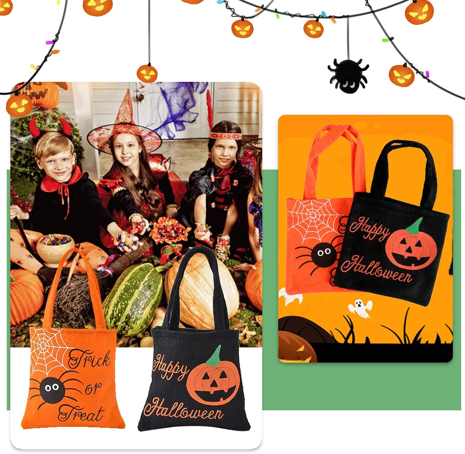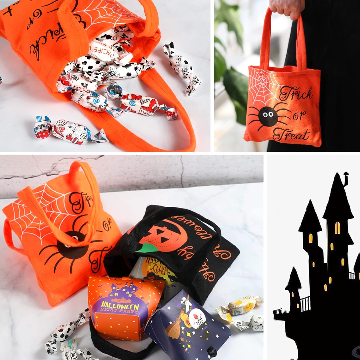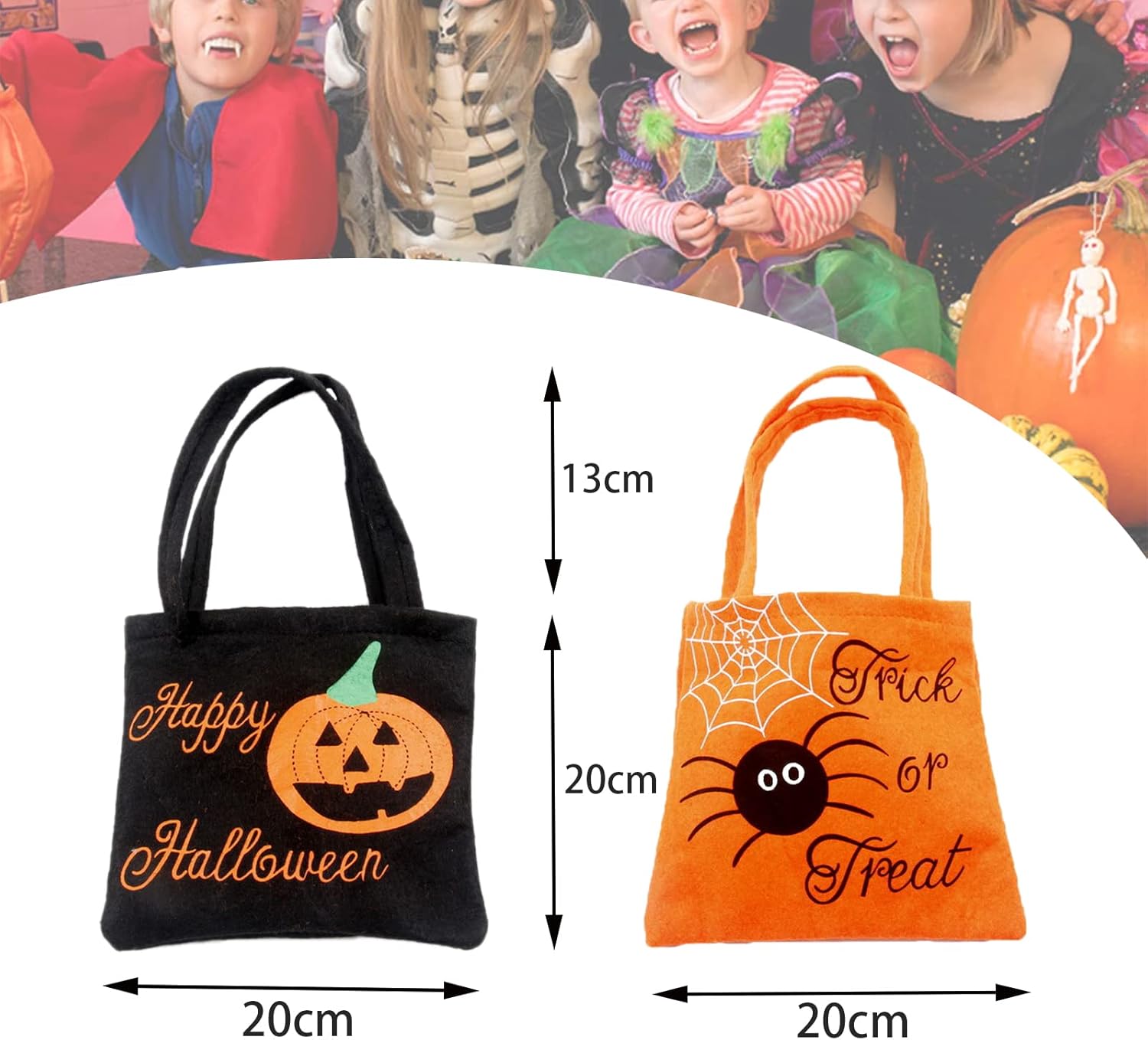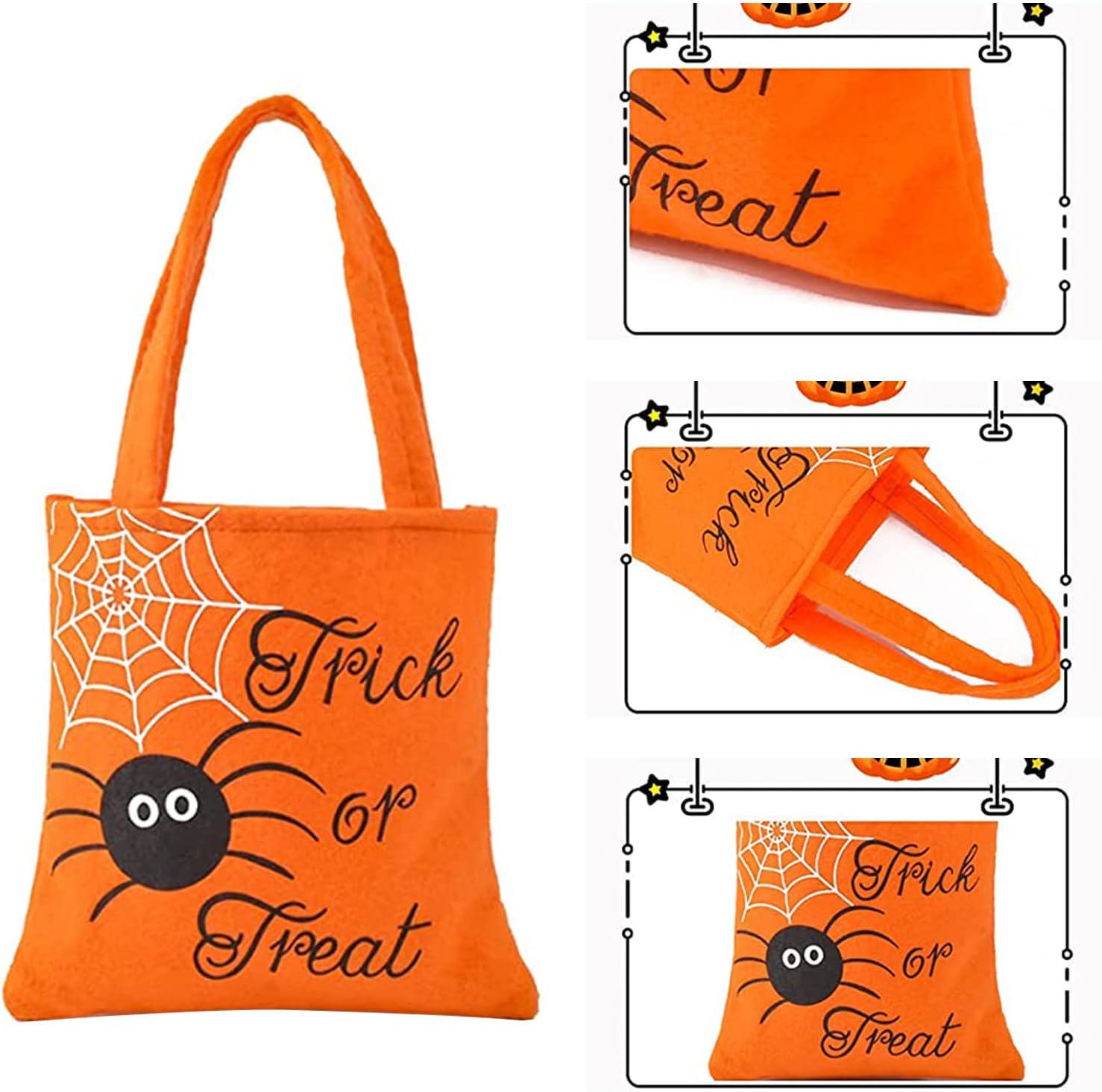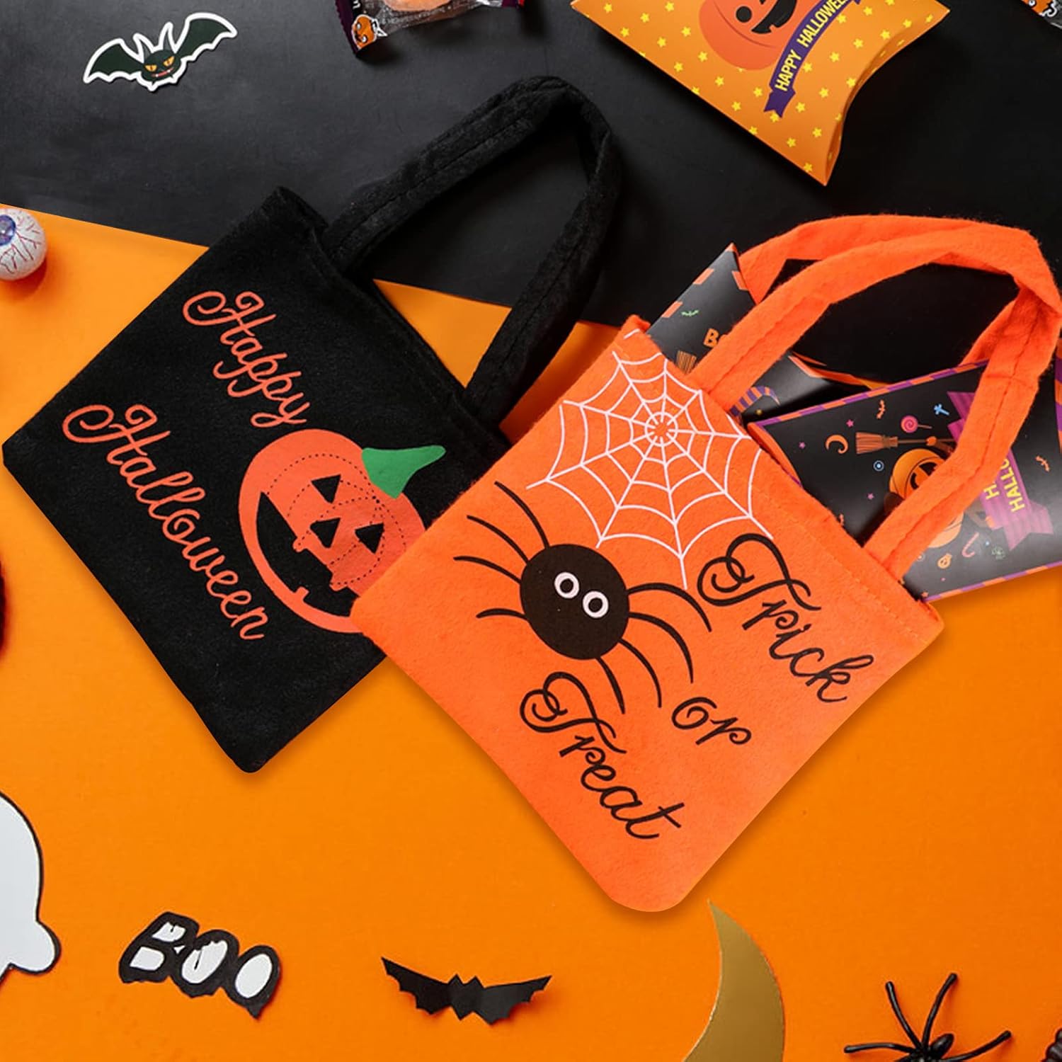 【Materiale Premium】 I sacchetti di caramelle di Halloween sono realizzati in tessuto non tessuto e feltro di alta qualità, molto resistenti, riutilizzabili, molto leggeri e riciclabili. 【Design raffinato】Riceverai 2 sacchetti di caramelle di Halloween di alta qualità (sacchetti di caramelle di Halloween, arancioni, neri, stampati con ragnatela, zucca.), con manici robusti, bel design, colorati, perfetti per le forniture per feste di Halloween e non per regalare sacchetti regalo dolcetto o scherzetto o sacchetti di caramelle. 【Capacità sufficiente】 Borsa per dolcetto o scherzetto di Halloween, 8 x 12 pollici, abbastanza grande da consentire ai bambini di contenere dolcetti, caramelle, libri, giocattoli, pranzo, regali o altri oggetti. 【Regali di Halloween】Sacchetti di caramelle di Halloween Questi sacchetti regalo pieni di personalità saranno sicuramente un successo tra dolcetti o scherzetti di tutte le età. Sorprendi tua nipote, nipote o nipote o i tuoi stessi figli, sono un'ottima idea per un regalo di Halloween, compleanno o Natale.,Ampie applicazioni: la borsa dolcetto o scherzetto è adatta come borsa regalo, borsa dolcetto o scherzetto, custodia per feste come feste di Halloween, feste di carnevale, feste di compleanno e giochi birichini, la borsa riutilizzabile è adatta anche per la spesa o lo shopping quotidiano.