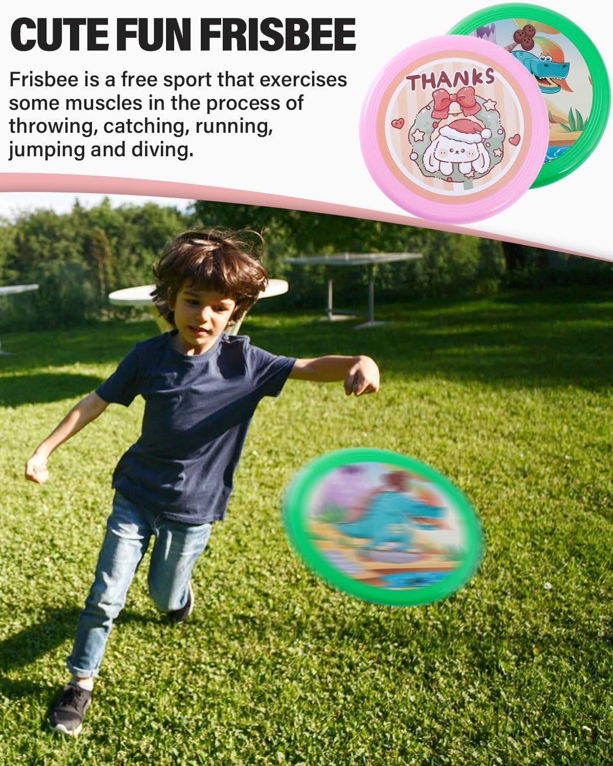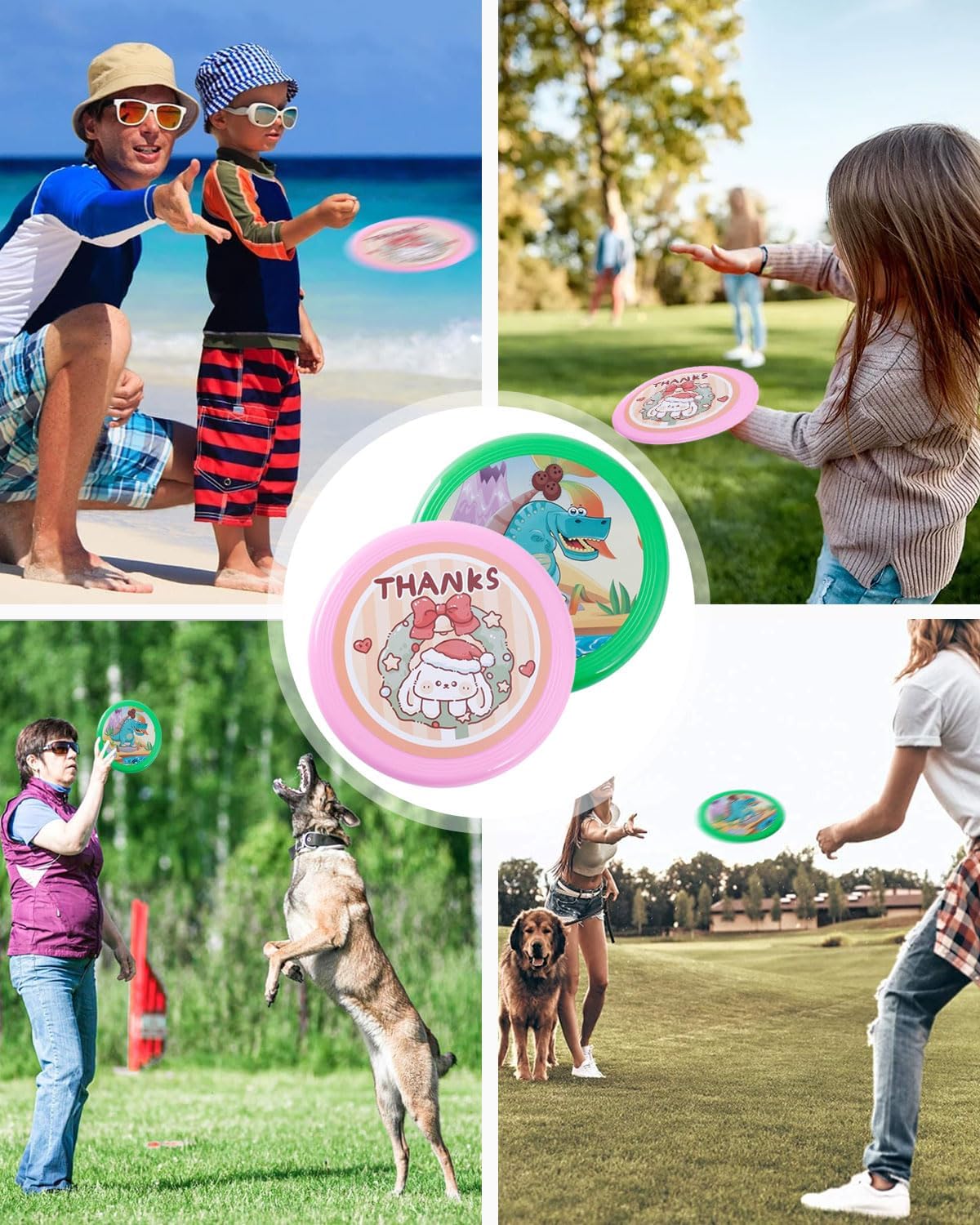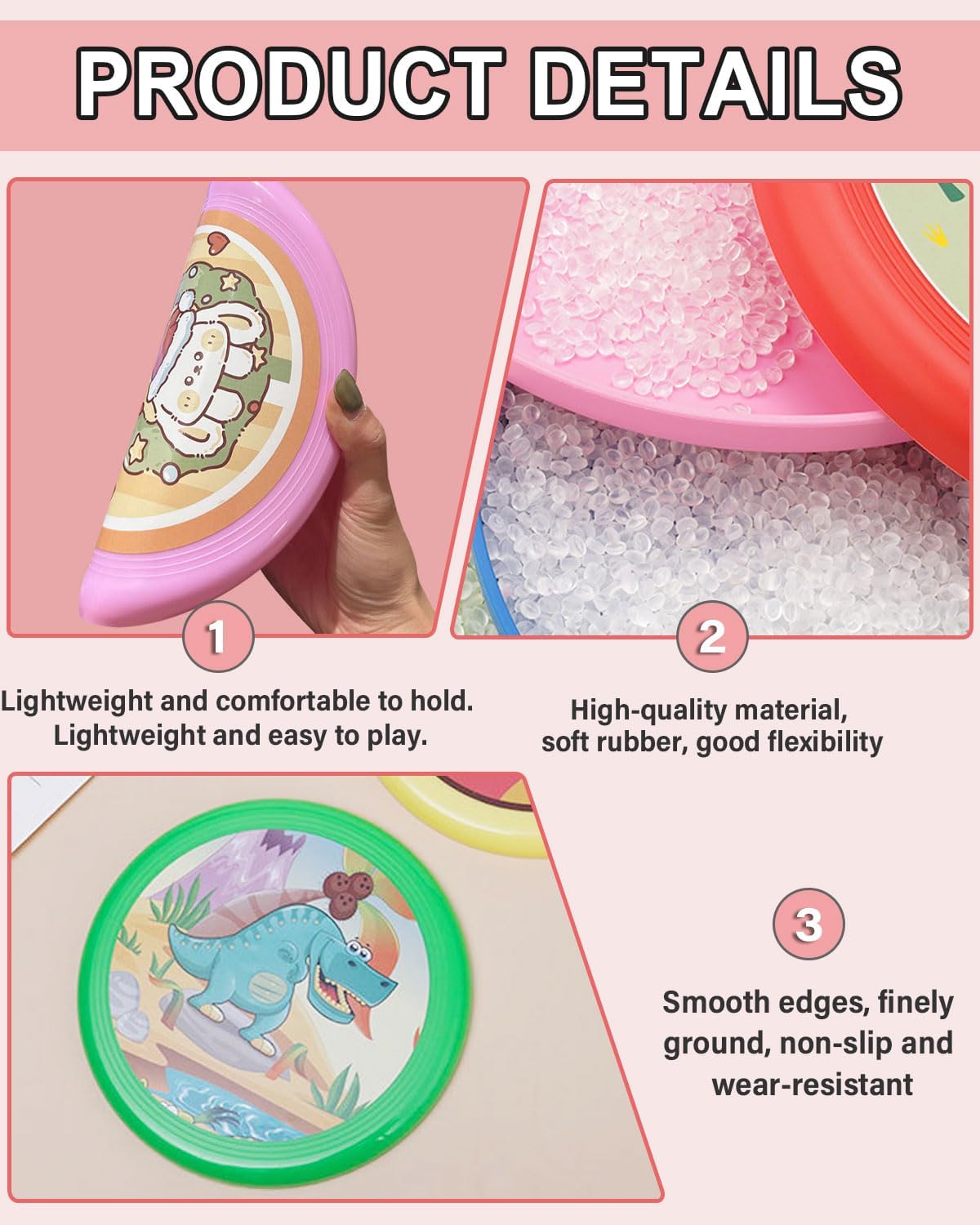 Progettato per i bambini: il disco volante colorato fatto a mano con graziosi motivi a cartoni animati rosa e verdi è appositamente progettato per i bambini, con lavorazione pregiata e senza sbavature, che non graffieranno le mani dei bambini Materiali ecocompatibili: realizzati in PU/poliuretano ecologico, atossico, pieghevole, resistente all'usura e morbido Dimensioni/peso: 20 cm di diametro, 2 cm di spessore/65 g. Giocattolo portatile per bambini, adatto per gli sport all'aria aperta, ideale per i giochi all'aperto tra genitori e figli. Nota: è normale che un prodotto nuovo abbia un leggero odore. Si prega di posizionare il frisbee in un luogo ventilato e l'odore scomparirà gradualmente. Inoltre, questo frisbee è adatto solo per bambini, non per cani o altri animali. Garanzia e servizio clienti: tutti i nostri prodotti sono sottoposti a rigorosi controlli di qualità. In caso di problemi di qualità o insoddisfazione, non esitate a contattarci. Vi forniremo la soluzione migliore.