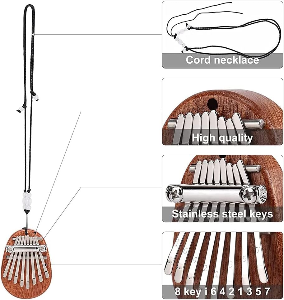 Suono: il suono dello strumento del pianoforte a pollice è chiaro e naturale. Basta usare il pollice per suonare il piano, quindi puoi fare musica, rendere piacevole la tua giornata e ridurre la pressione del lavoro o dello studio. [Materiale di alta qualità] Mini Kalimba 8 in legno massello squisito di alta qualità, la pregevole fattura ti offre musica meravigliosa. Corpo in legno massello naturale e acciaio inossidabile, una lunghezza perfettamente abbinata che offre suono e toni, rendendo unico il pianoforte a pollice. [Dimensioni portatili] Con una tracolla regolabile, è facile da trasportare e riporre, può anche essere appeso allo zaino, alla borsa della scuola, alla borsa a tracolla, alla borsa per le chiavi, all'interno dell'auto o al collo come una collana. Bellissimo ciondolo, corpo in legno massiccio e acciaio inossidabile, raffinato. [Adatto a bambini dai 3 anni in su] Il mini pianoforte a dita è progettato per essere facile da suonare per tutti, suonare e suonare musica. Lo strumento è un buon principiante adulto per la musica. [Regalo perfetto] Il mini pianoforte da pollice è un buon strumento musicale portatile, ornamento kalimba da mini pianoforte da pollice, squisito ciondolo per pianoforte da dito, buon regalo per anniversari come compleanno, festa della mamma, festa del papà, regali di Pasqua per adulti, bambini, amanti, famiglie, ecc.