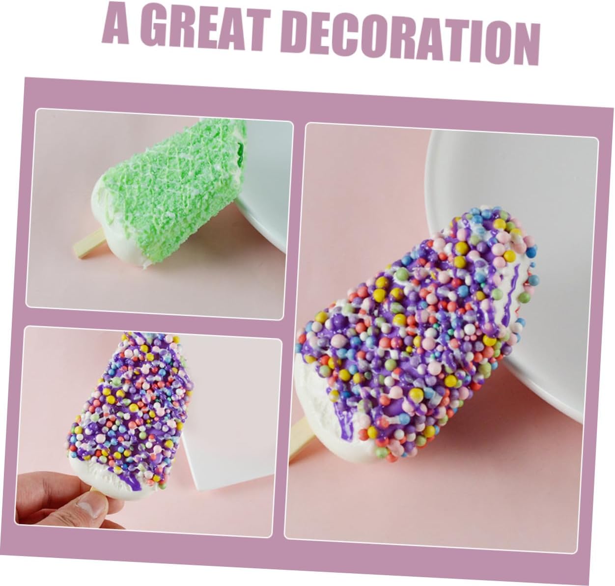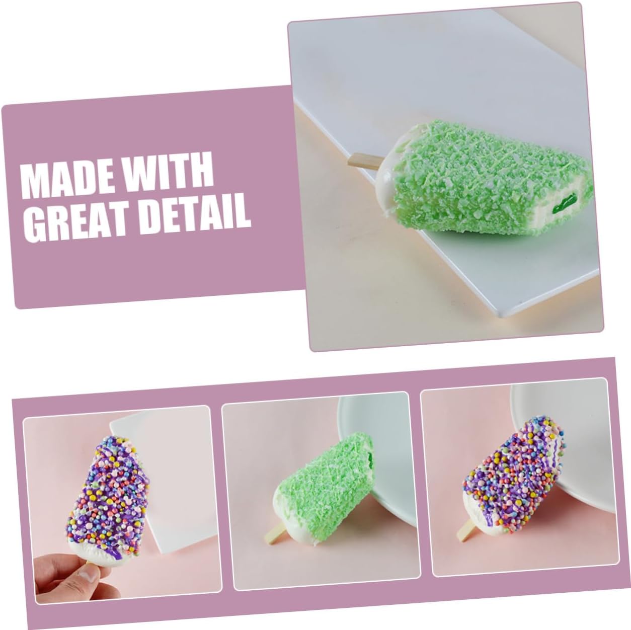 Gelato artificiale: realizzato con grande cura nei dettagli, dall'aspetto vivido, ideale come decorazione per feste e per un divertimento ancora maggiore, cibo finto realistico Cibo artificiale per esposizione: adatto per l'esposizione nel commercio alimentare, nei negozi, nelle panetterie, modelli cognitivi per dell'asilo, oggetti di scena per la fotografia, ecc., alimentare per esposizione Finti oggetti di scena per gelato: se il tema riguarda il cibo, in particolare i ghiaccioli, questo di ghiaccioli finti può essere utilizzato per l'insegnamento e l'esposizione di cibi finti Di esposizione di gelato: il di ghiaccioli finti è un buon oggetto di scena per le foto, può sostituire reale quando si scattano foto, di gelato artificiale Giocattolo di simulazione del gelato: il suo adorabile design a forma di gelato conquisterà il tuo amore, regalandoti una bella esperienza, gelato finto simulato