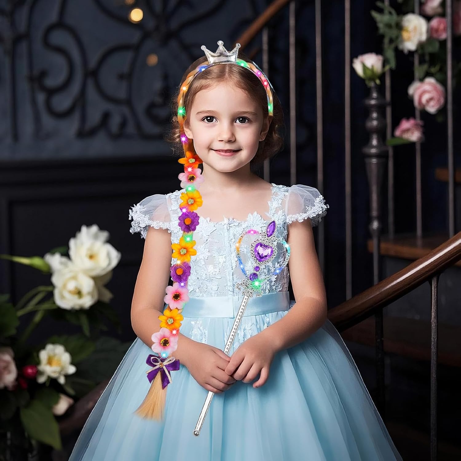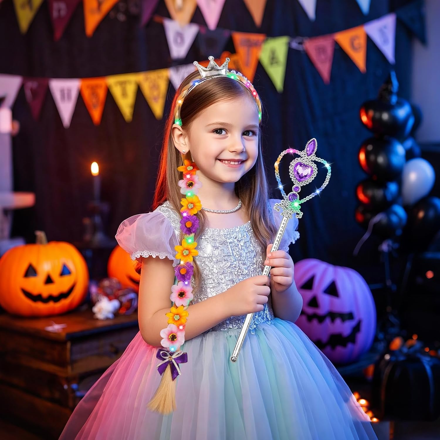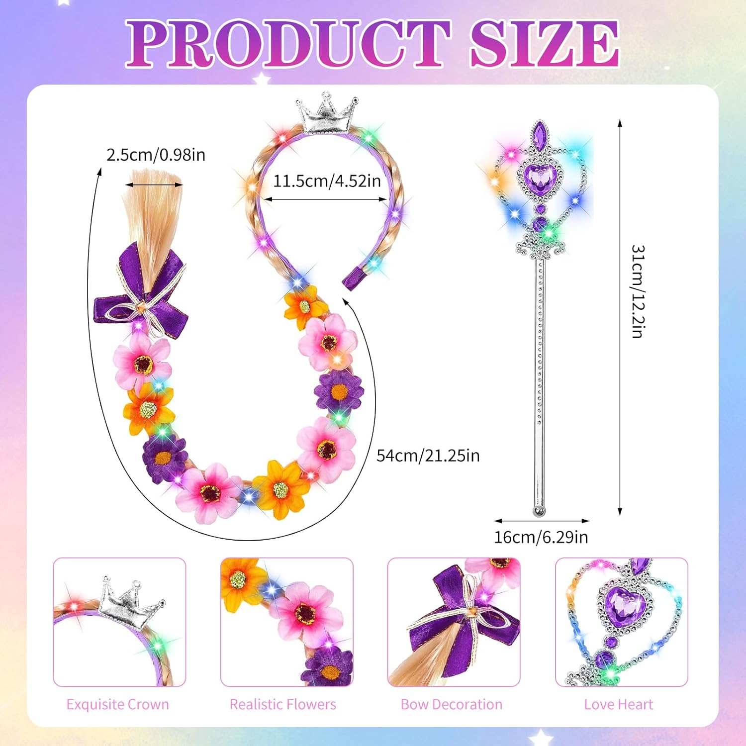 【Design Raffinato】Il cerchietto a treccia da principessa è realizzato con capelli biondi intrecciati e presenta una corona, un fiocco all'estremità e fiori colorati che adornano le trecce, creando un look delicato e adorabile. La bacchetta è sormontata da un cuore viola scintillante e ha un'impugnatura facile da impugnare per un facile utilizzo. 【3 Effetti di Luce】Sia il cerchietto a treccia che la bacchetta sono dotati di luci a LED integrate (batterie incluse) con tre modalità di illuminazione: flash, flash lento e luce fissa. Le bambine possono passare liberamente dall'una all'altra in base alle proprie preferenze. Le luci colorate creano un'atmosfera da sogno, permettendo alle bambine di immergersi nel ruolo di una principessa. 【Materiali di Alta Qualità】La parrucca con trecce da principessa è realizzata con fibre sintetiche ecologiche, sicure e inodori. Le trecce sono morbide, lisce e hanno una sensazione di alta qualità. È leggera e facile da indossare senza danneggiare i capelli delle bambine. La bacchetta è realizzata in materiale ABS di alta qualità e decorata con strass, ecologica, atossica e durevole. 【Universale】Questo set di accessori da principessa è perfetto per una varietà di occasioni, tra cui Halloween, Natale, cosplay, feste a tema, balli in maschera, carnevali, spettacoli scolastici e spettacoli teatrali. Non solo arricchisce il look da principessa delle bambine, ma aggiunge anche divertimento al loro tempo libero. 【Set di Accessori da Principessa】Questo set di accessori da principessa include 1* cerchietto a LED con treccia da principessa e 1* bacchetta magica a LED. Progettato specificamente per le bambine, questo set permette loro di trasformarsi istantaneamente nella principessa dei loro sogni e di realizzare facilmente i loro sogni. Gioco di travestimento per bambine dai 3 agli 8 anni.