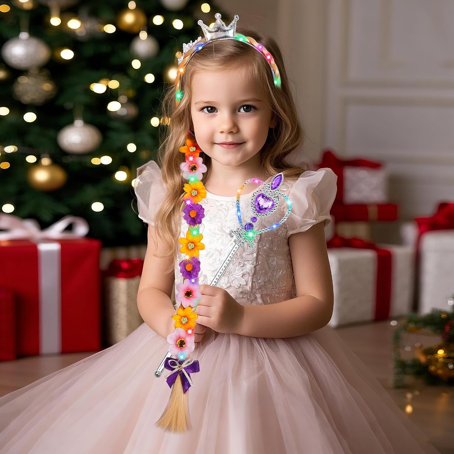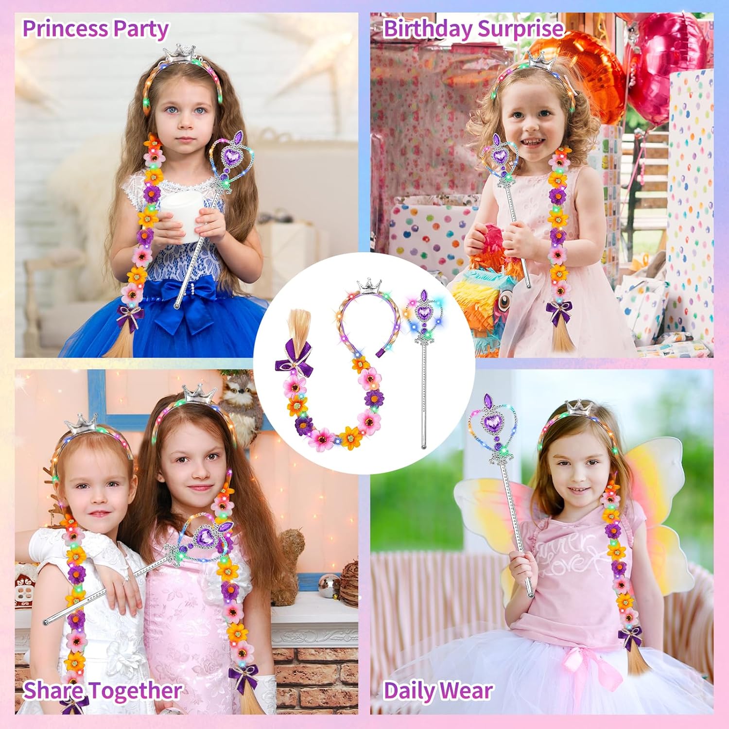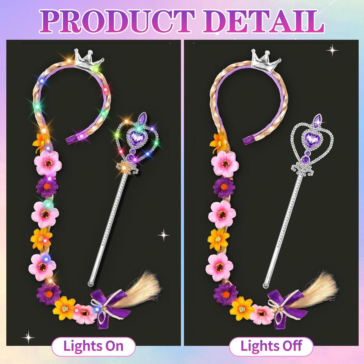 【Design Raffinato】Il cerchietto a treccia da principessa è realizzato con capelli biondi intrecciati e presenta una corona, un fiocco all'estremità e fiori colorati che adornano le trecce, creando un look delicato e adorabile. La bacchetta è sormontata da un cuore viola scintillante e ha un'impugnatura facile da impugnare per un facile utilizzo. 【3 Effetti di Luce】Sia il cerchietto a treccia che la bacchetta sono dotati di luci a LED integrate (batterie incluse) con tre modalità di illuminazione: flash, flash lento e luce fissa. Le bambine possono passare liberamente dall'una all'altra in base alle proprie preferenze. Le luci colorate creano un'atmosfera da sogno, permettendo alle bambine di immergersi nel ruolo di una principessa. 【Materiali di Alta Qualità】La parrucca con trecce da principessa è realizzata con fibre sintetiche ecologiche, sicure e inodori. Le trecce sono morbide, lisce e hanno una sensazione di alta qualità. È leggera e facile da indossare senza danneggiare i capelli delle bambine. La bacchetta è realizzata in materiale ABS di alta qualità e decorata con strass, ecologica, atossica e durevole. 【Universale】Questo set di accessori da principessa è perfetto per una varietà di occasioni, tra cui Halloween, Natale, cosplay, feste a tema, balli in maschera, carnevali, spettacoli scolastici e spettacoli teatrali. Non solo arricchisce il look da principessa delle bambine, ma aggiunge anche divertimento al loro tempo libero. 【Set di Accessori da Principessa】Questo set di accessori da principessa include 1* cerchietto a LED con treccia da principessa e 1* bacchetta magica a LED. Progettato specificamente per le bambine, questo set permette loro di trasformarsi istantaneamente nella principessa dei loro sogni e di realizzare facilmente i loro sogni. Gioco di travestimento per bambine dai 3 agli 8 anni.
