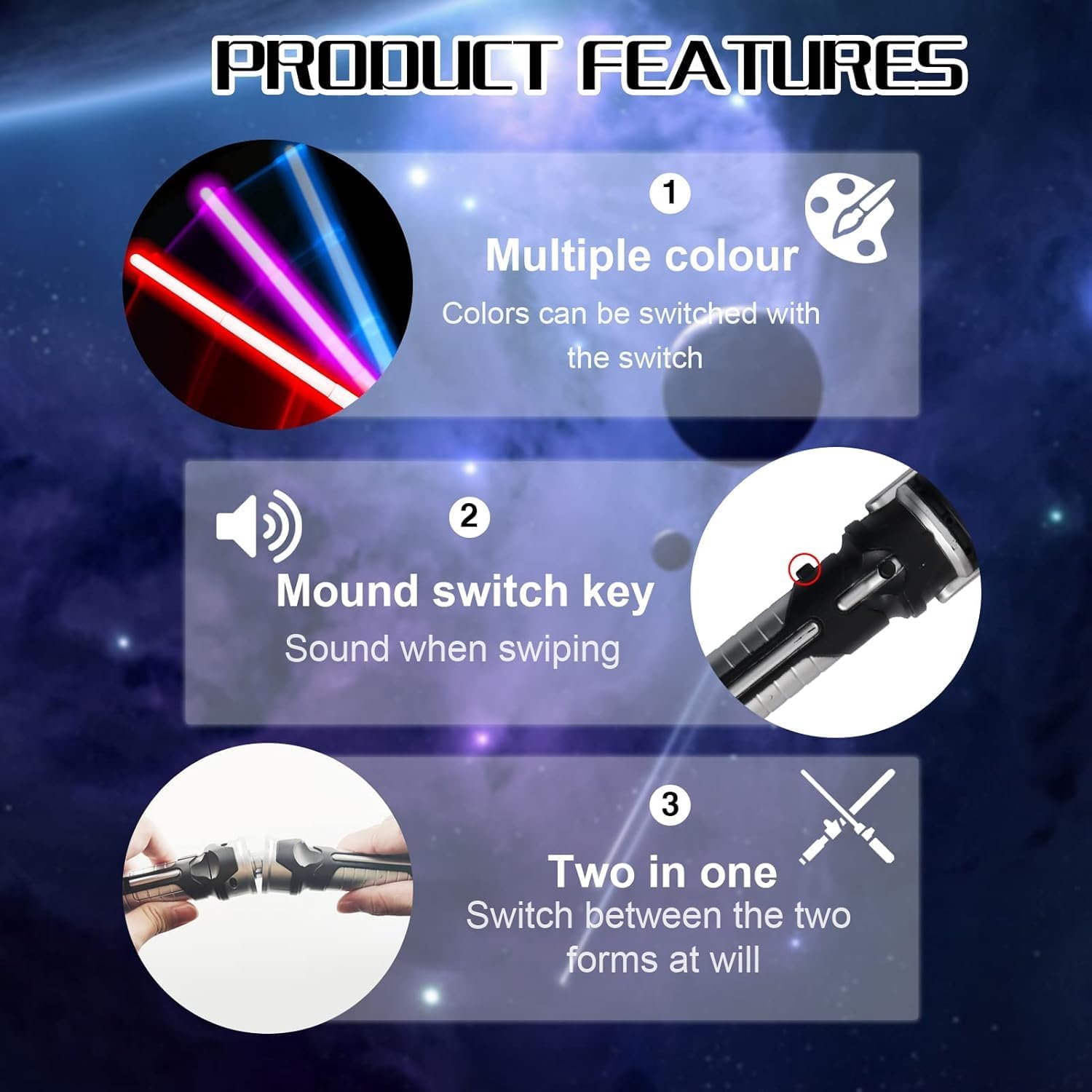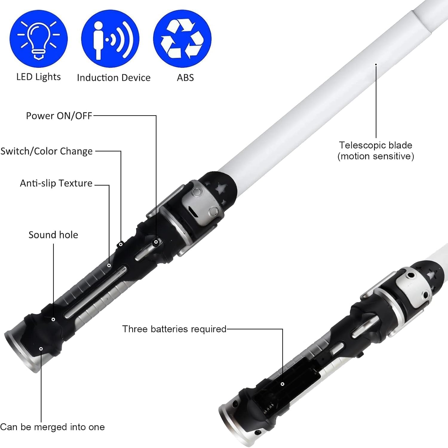 ⚔【Spada laser retrattile】: La spada laser è realizzata in materiale plastico di alta qualità, ecologico, trasparente, resistente e riutilizzabile. Non si danneggia facilmente ed è adatta a bambini dai 15 anni in su. ⚔【Spada laser a LED】: Riceverai due spade laser, una spada laser 2 in 1. Puoi cucire insieme le due spade. La spada laser RGB può emettere 7 colori diversi (con suono, disattivabile). È retrattile, con una lunghezza totale di 65 cm quando è aperta, il che la rende facile da riporre e offre un'esperienza di gioco potente. ⚔【Design unico】: La spada laser si illumina con luci LED luminose. Non sono incluse batterie (è necessario procurarsele). Può essere utilizzata con un interruttore a pulsante, rendendola più facile da usare al buio. ⚔【Regalo perfetto】: le luci LED per feste sono adatte a qualsiasi occasione, tra cui feste di Natale, feste di compleanno, Halloween, Natale, picnic all'aperto e altro ancora. Sono un regalo speciale per bambini e bambine. ⚔【Attenzione】: le batterie non sono incluse. Gli acquirenti devono installare le batterie autonomamente prima dell'uso.