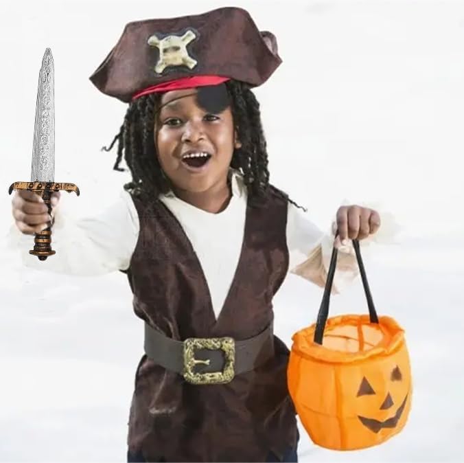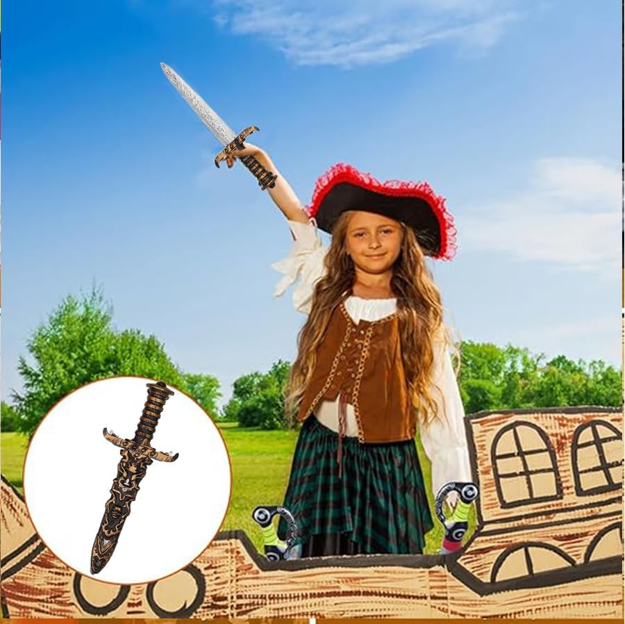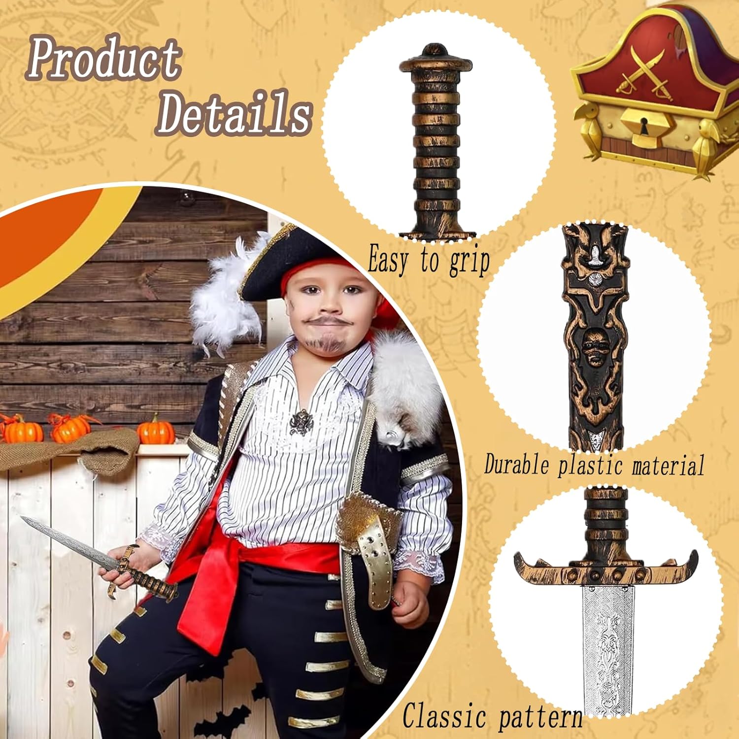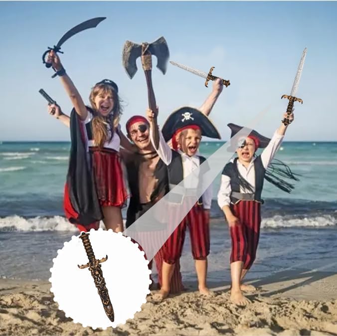 [Materiale e Processo] : Spade di plastica per halloween è realizzata in materiale plastico di alta qualità, dopo un processo di galvanizzazione fine, la superficie mostra una lucentezza e una consistenza metalliche. non solo mantiene la leggerezza e la resistenza alla caduta della plastica, ma conferisce anche corpo della spada un effetto visivo nobile ed elegante. [Design Unico] : Il halloween spade di plastica corpo della spada ha linee morbide e forma realistica, ripristinando perfettamente lo stile delle armi antiche. L'elsa è progettata ergonomicamente ed è comoda da tenere in mano, quindi non ti sentirai stanco anche se la indossi per molto tempo. Facile da trasportare: la nostra spada di plastica è leggera e della giusta dimensione, con un peso totale di 30 grammi e una lunghezza di 24,5 cm, garantendo che non sia né troppo pesante né troppo grande, facile da trasportare e non facile da danneggiare, adatta per tenere le piccole mani dei bambini e non darà peso ai bambini o agli utenti.spada pirata Può essere abbinato a qualsiasi outfit da festa o spettacolo pirata. Design unico: il giocattolo è realizzato in colore oro retrò, con aspetto squisito e unicità.spada pirata Gli intagli e le texture squisiti e la forma realistica del pugnale aumentano il realismo e il valore ornamentale del giocattolo, portano i bambini nel mondo avventuroso dei pirati e stimolano l'immaginazione e la creatività dei bambini, lascia che i bambini lo mettono giù. Regalo perfetto: questo giocattolo con pugnale ha un design unico. Può essere utilizzato come oggetto di scena nei giochi per bambini per aumentare il divertimento del gioco. Può anche essere utilizzato come film, oggetto di scena teatrale, decorazione per feste a tema, giochi di ruolo, spettacoli scolastici e supporto video. È un supporto ideale per Arabian Nights. Accessorio ideale per costumi abbronzati, orientali o da pirata. Una spada da pirata è un regalo speciale per tutti!