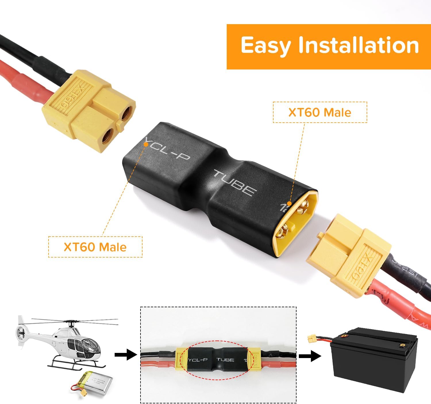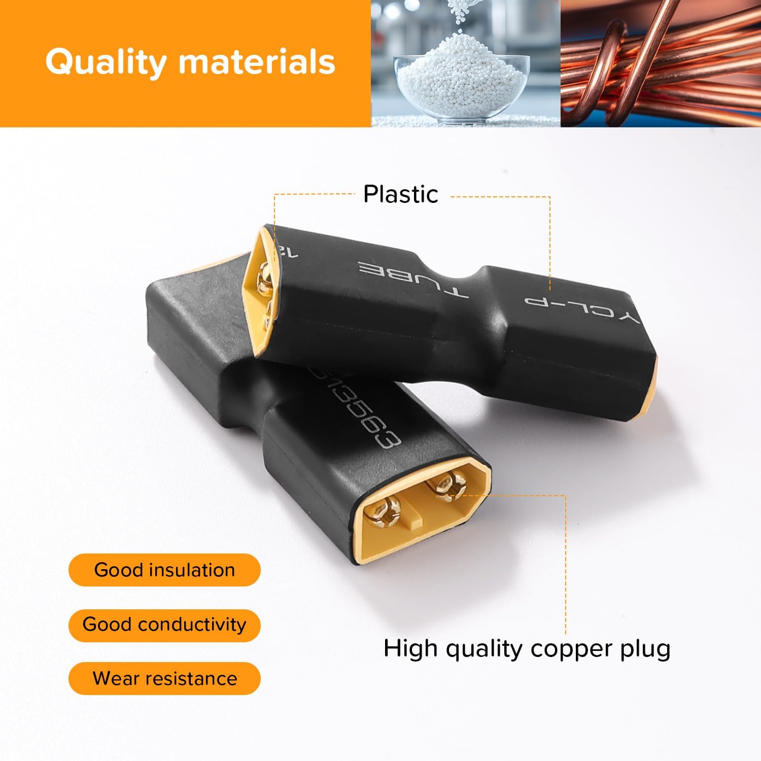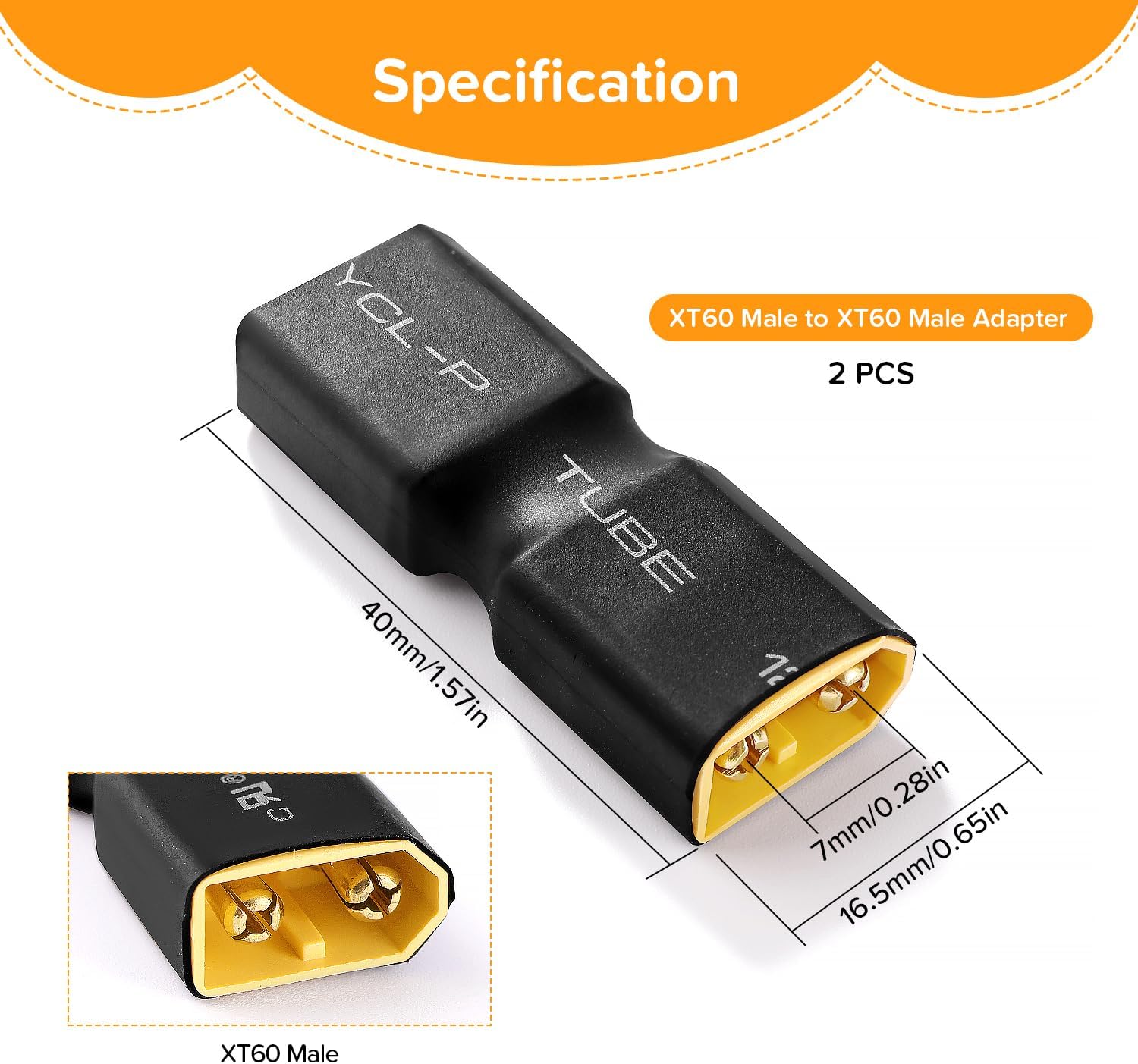 La confezione include: 2 adattatore da XT60 maschio a XT60 maschio. Materiale: Realizzato in rame di alta qualità, il guscio è in materiale plastico, che garantisce la stabilità e la durata del connettore in ambienti difficili. Buon isolamento, buona conduttività, resistenza all'usura, lunga durata. Installazione semplice: i pin e le prese sono saldamente collegati tra loro, rendendo le operazioni di collegamento e scollegamento facili e veloci, basta collegarli e utilizzarli, molto comodi. Nessun cavo: goditi la praticità degli adattatori senza cavi aggrovigliati. Questa soluzione semplifica il collegamento di diverse batterie e dispositivi, lasciandoti più tempo per il tuo hobby. Ampia compatibilità: ampiamente utilizzato in tutti i tipi di modelli di auto RC, aeromodelli, barche RC, droni, aerei RC, quadricotteri, elicotteri RC e così via.