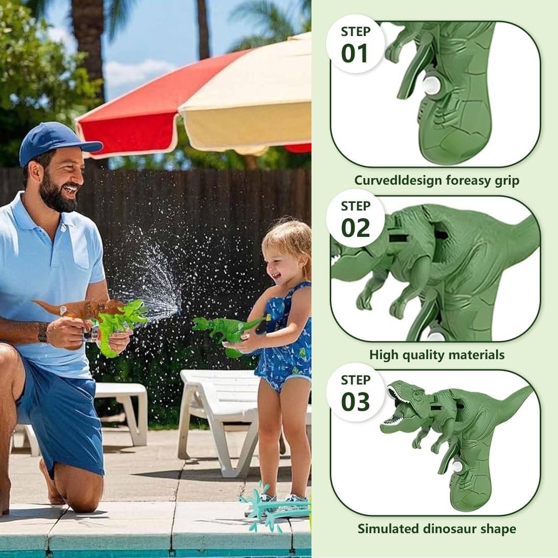 Set completo: Include 2 piccole pistole ad acqua in dinosauro design diversi, perfette per attività estive come feste in giardino, giochi in piscina e compleanni per bambini. Ideale come regalo o gadget per bambini, per rendere ogni momento di gioco ancora più divertente Dimensioni pratiche: Ogni pistola ad acqua misura 21 cm di lunghezza e 11cm di altezza, leggera e facile da maneggiare. Progettata per adattarsi perfettamente alle mani dei più piccoli, garantendo un utilizzo sicuro e un gioco spensierato Materiali sicuri: Realizzate con materiali adatti ai bambini e completamente sicuri, queste pistole ad acqua sono ideali per bambini dai 3 anni in su. Perfette per un divertimento estivo senza preoccupazioni e in totale sicurezza Idea regalo perfetta: Le pistole ad acqua sono un'ottima idea regalo per compleanni, souvenir o gadget. Accompagnano i bambini in un'estate indimenticabile piena di giochi e risate, rendendo ogni occasione speciale Divertimento senza fine: Ideali per il giardino o la piscina, queste pistole ad acqua offrono intrattenimento per bambini e adulti. Favoriscono l'interazione tra genitori e figli, creando momenti di gioco condiviso e ricordi preziosi