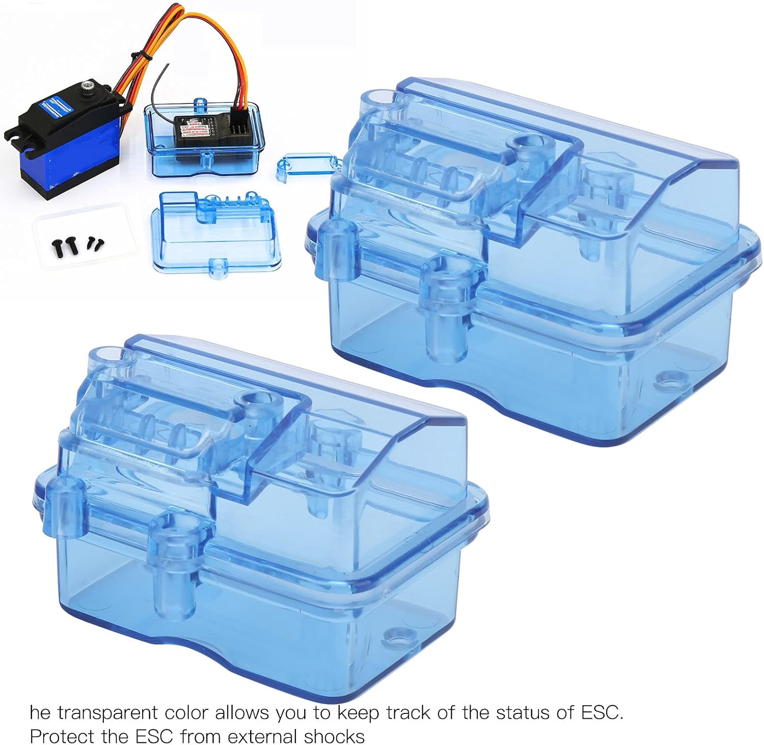 [Facile Installazione e Uso] Dotato di viti di montaggio e di fori per viti, questo proteggitore per ricevitore è incredibilmente facile da installare sulla tua auto o barca rc. Il design intuitivo garantisce un'installazione senza problemi, permettendoti di concentrarti sulle tue avventure rc senza preoccuparti di installazioni complicate. [Sostituzione e Aggiornamento Perfetti] Progettato come sostituzione perfetta per scatole ricevitrici vecchie o danneggiate, questo prodotto offre alta affidabilità e migliora la resistenza all'acqua dei vostri auto o barche RC. La sua qualità costruttiva superiore e la funzionalità lo rendono un aggiornamento indispensabile per ogni appassionato di RC. [Protegge il tuo ESC] Questa scatola ricevente protegge efficacemente il tuo ESC da urti esterni, acqua e polvere, prolungando significativamente la sua vita utile. La custodia previene danni da impatti e fattori ambientali, garantendo che i tuoi componenti RC rimangano in ottime condizioni per più tempo. [Design durevole e impermeabile] Realizzata con materiali plastici di alta qualità, questa scatola per ricevitore rc offre un'eccezionale protezione contro spruzzi e acqua. La sua costruzione robusta garantisce una lunga durata, rendendola ideale per ambienti difficili. Il design trasparente blu permette un facile monitoraggio dello stato dell'esc, mantenendolo al sicuro da acqua e polvere. [Trasparente e Comodo] Il colore blu trasparente della scatola offre una chiara visibilità dell'esc all'interno, rendendo facile controllarne lo stato. Questa caratteristica aggiunge comodità durante l'uso, consentendo una rapida risoluzione dei problemi e manutenzione senza aprire la scatola.