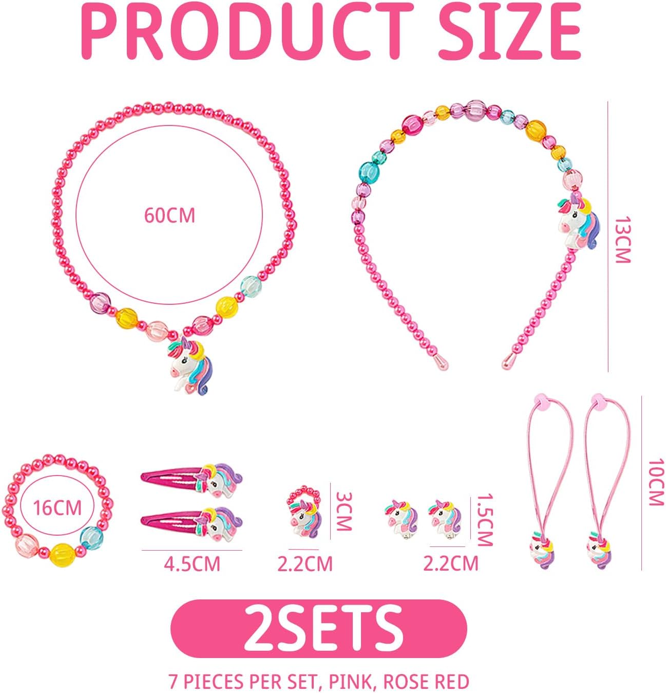 【Contenuto Del Prodotto】 Riceverai 2 Set Di Set Di Gioielli Per Bambini, Ogni Set Tra Cui Fasce Per Capelli, Collane, Bracciali, Anelli, Clip Auricolari, Clip Per Capelli E Corde Per Capelli. La Fascia È Di Una Dimensione, La Collana È Lunga 40 Cm, Il Braccialetto È Lungo 14 Cm, L'Anello È Di Una Dimensione, La Dimensione Della Clip Dell'Orecchio È Di 2, 2*1, 5 Cm, La Dimensione Della Clip Dei Capelli È Di 4, 5 Cm, La Dimensione Della Corda Dei Capelli È Di 8, 5 Cm. 【Materiale Del Prodotto】 Questo Prodotto È Realizzato In Plastica E Metallo Ed È Leggero E Resistente. Il Materiale Plastico È Sicuro E Rispettoso Dell'Ambiente, Non Facile Da Rompere Ed È Adatto All'Uso Quotidiano Dei Bambini. Il Materiale Metallico Aumenta La Fermezza E La Durata Dei Gioielli. 【Design Carino】 Questo Design Del Prodotto È Carino, Con Cartoni E Colori Vivaci, Che È Molto Attraente Per Le Bambine. Gioielli Di Varie Forme Consentono Ai Bambini Di Abbinare Liberamente, Mostrando Forme E Stili Diversi, Adatti A Varie Occasioni. 【Facile Da Indossare】 Questi Accessori Sono Semplici Da Progettare, Facili Da Indossare E Smontare E Possono Essere Facilmente Gestiti Dai Bambini. Che Si Tratti Di Viaggi O Feste Quotidiani, Questi Accessori Possono Aggiungere Punti Salienti Ai Bambini E Renderli Al Centro Dell'Attenzione. 【Ampiamente Utilizzato】 Questo Prodotto È Molto Adatto Come Oggetto Di Decorazione Per Le Feste Per Bambini E Può Anche Essere Usato Come Ornamento Per L'Abbigliamento Quotidiano. Che Si Tratti Di Una Festa Di Compleanno, Di Una Celebrazione Festosa O Di Una Riunione Di Famiglia, Questi Carini Gioielli Possono Aggiungere Divertimento E Gioia All'Evento.