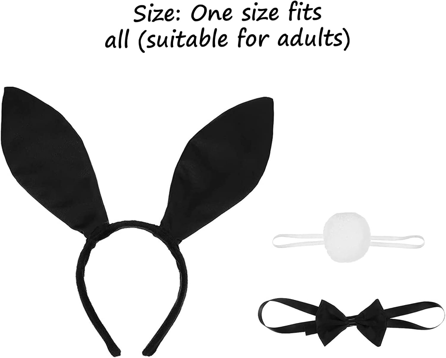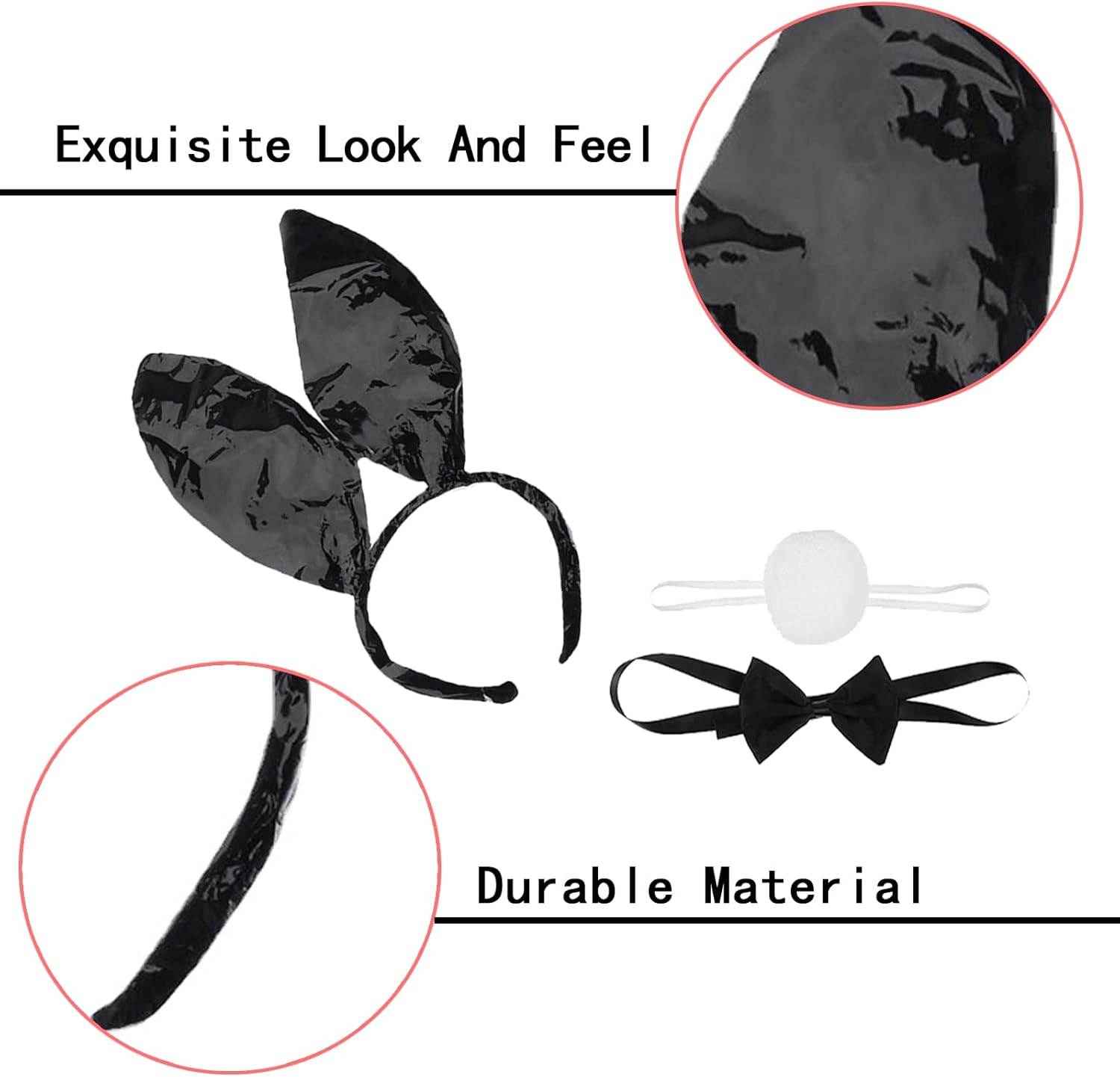 Il set è arrivato in fretta ed è completo, con un prezzo accessibile, ma la qualità lascia a desiderare. Le orecchie non sono soffici e il filo metallico è visibile sotto il tessuto. La coda è carina, mentre il papillon ha una chiusura di plastica che non è il massimo