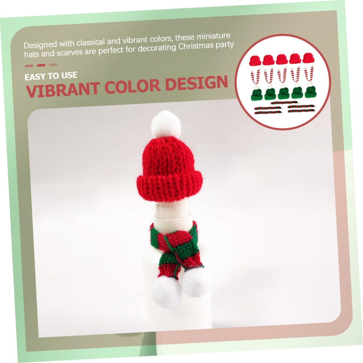 Per copricapi festivi: una aggiunta all'albero natale, ghirlande natalizie, composizioni floreali, pupazzi neve, bottiglie vino, tazze d'acqua, ecc., mini Decorazioni per feste: design a tema natalizio, pieno atmosfera invernale e festiva, sciarpa in miniatura e accattivante Cappelli in miniatura per lavori artigianali: perfettamente in linea con tema del natale, portano un'atmosfera natalizia più intensa, mini cappello per lavori artigianali Mini sciarpa per lavori artigianali: puoi usarla per progetti artigianali da te, decorazioni per bottiglie vino, decorazioni per tazze d'acqua, decorazioni per natale e altro ancora, mini cappelli e sciarpe per lavori artigianali Cappelli in miniatura per decorazioni: progettati con colori classici e vivaci, questi cappelli e sciarpe in miniatura sono per decorare la natale, mini cappelli e sciarpe