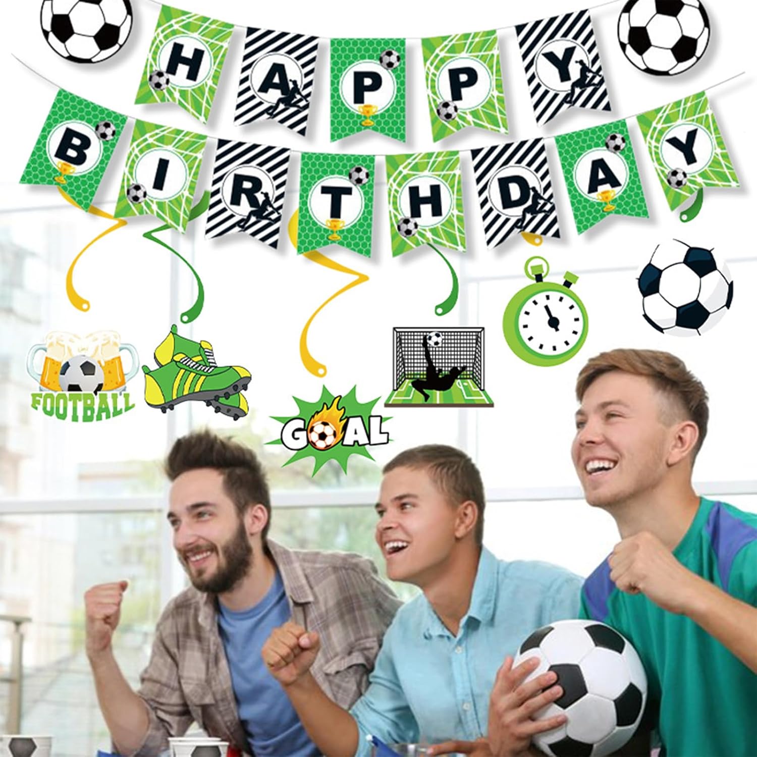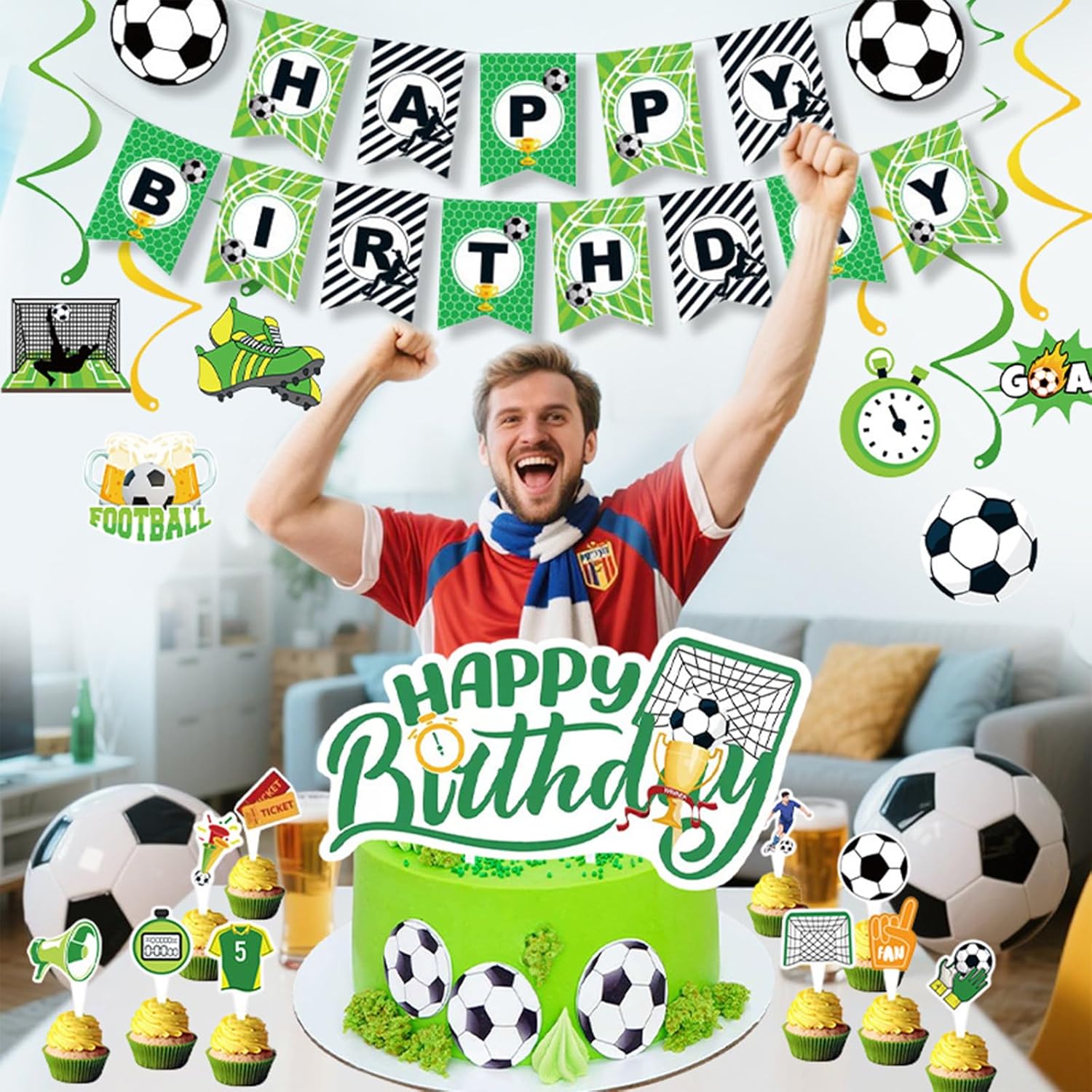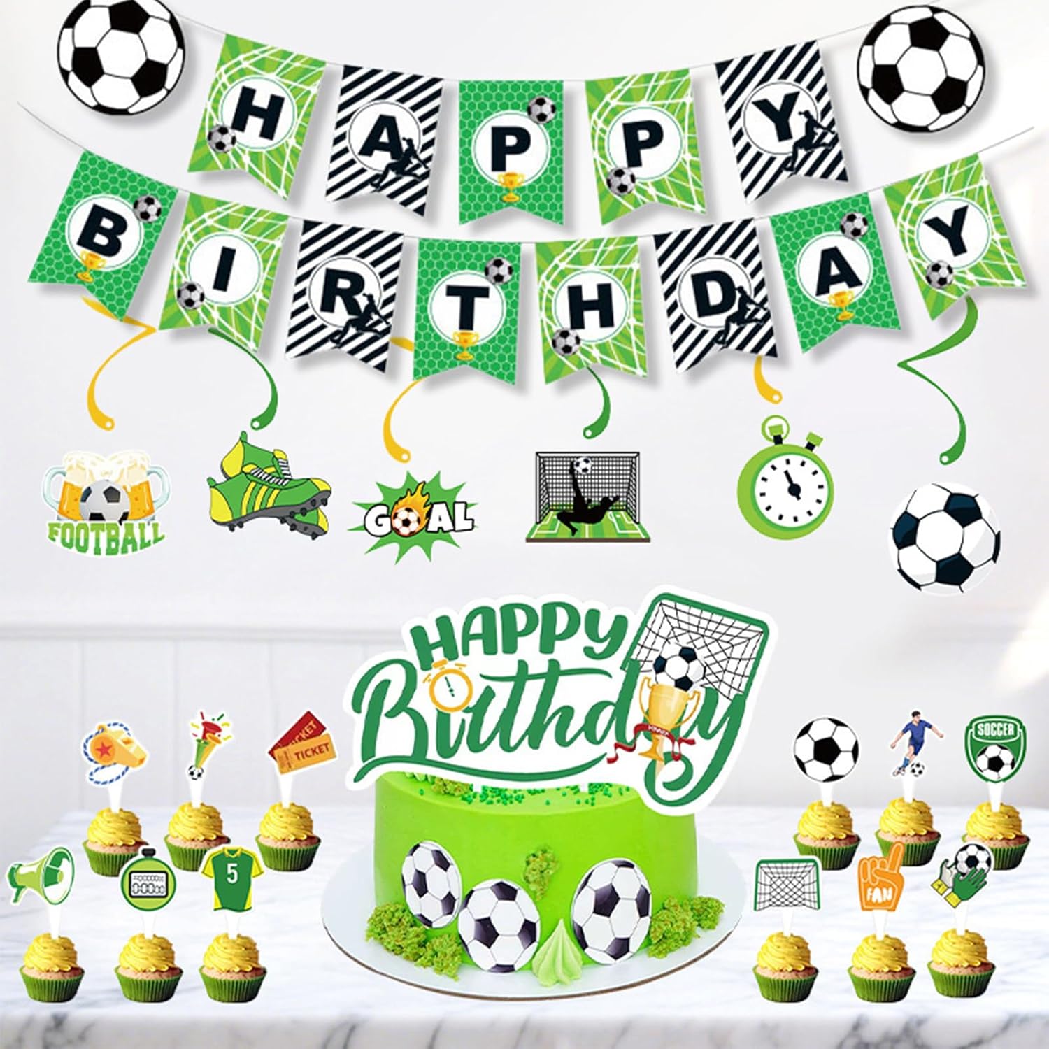 【Contenuto Della Confezione】Riceverete un set di 20 pezzi a tema calcio: 1 striscione di carta “Happy Birthday”, 6 decorazioni a spirale da appendere, 12 decorazioni di carta per cupcake e 1 grande decorazione per torte. Organizzate una festa di compleanno indimenticabile per il vostro bambino e la vostra famiglia. 【Materiale di Alta Qualità】Le decorazioni per la festa di compleanno a tema calcio sono realizzate in cartone di alta qualità, hanno colori vivaci, sono sicure e atossiche. Sono tagliate con una tecnologia di taglio di alta qualità, hanno una stampa chiara, presentano dettagli raffinati e non graffiano le mani. Sono resistenti e riutilizzabili e mantengono la loro forma perfetta. 【Design Unico】Le decorazioni a tema calcio sono la scelta ideale per le feste. Con il verde e il giallo come colori principali, combinati con palloni da calcio, scarpe da calcio ed elementi colorati della porta da calcio, creano un'intensa atmosfera sportiva. Portate una vivace atmosfera calcistica alla vostra festa e rendete l'evento divertente e festoso. Particolarmente adatto agli appassionati di calcio. 【Facile da Usare】Il set di decorazioni per feste è leggero, resistente e facile da applicare e sistemare. Basta fissare le carte alla parete con uno spago e una piastra chiodata nell'ordine corretto, mentre le parti a spirale possono essere assemblate con la colla inclusa nella confezione. Le decorazioni per torte rendono i vostri dessert e la vostra tavola ancora più allegri e divertenti. 【Una Festa di Compleanno Indimenticabile】Il nostro set per feste può essere utilizzato per decorazioni di compleanno, feste di compleanno e decorazioni di compleanno per bambini. Con il verde e il giallo come colori principali e elementi calcistici integrati, è perfetto per decorazioni di feste a tema calcistico. Che si tratti di una festa di compleanno per adulti o bambini, darà un tocco di colore all'evento.