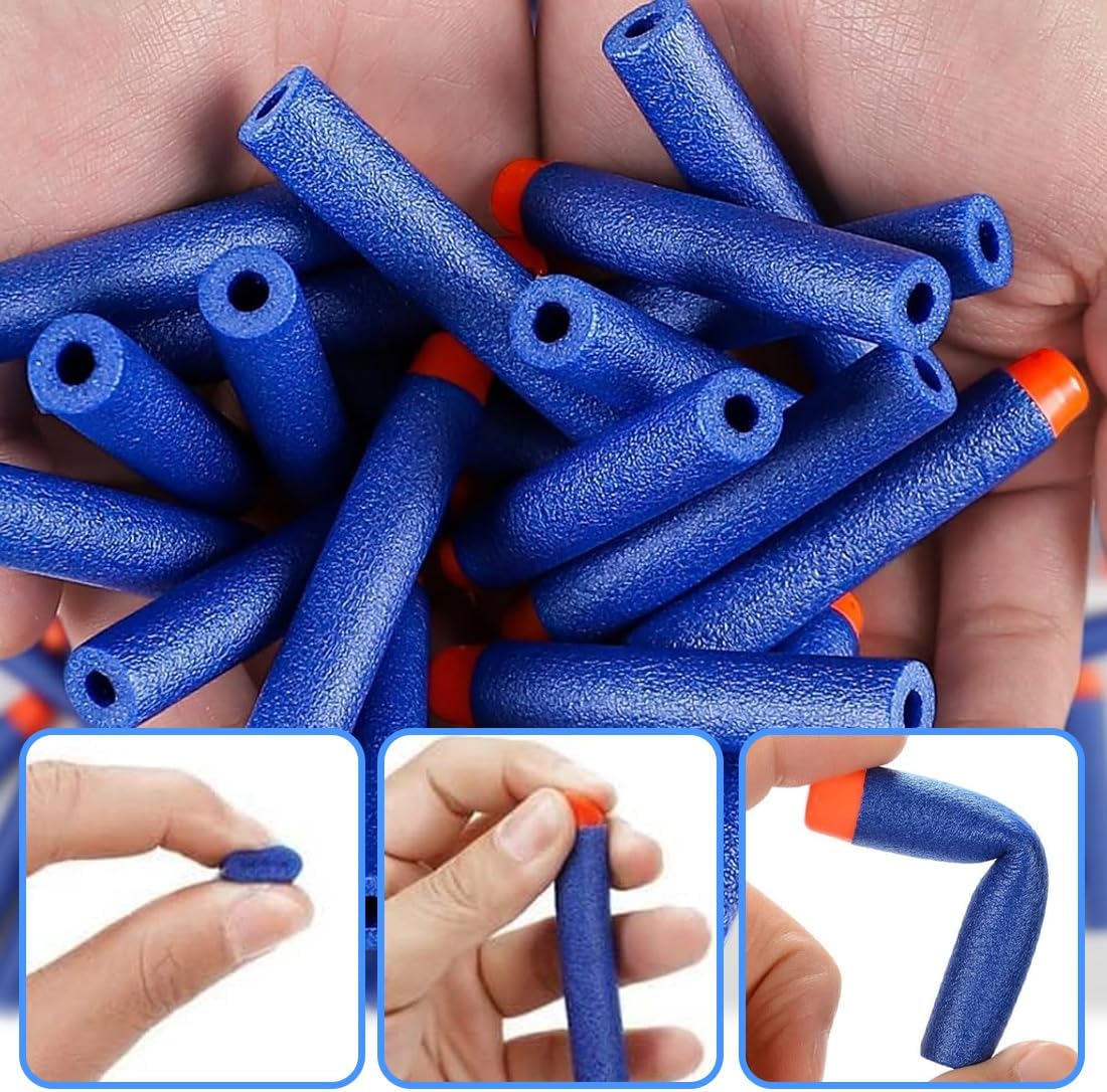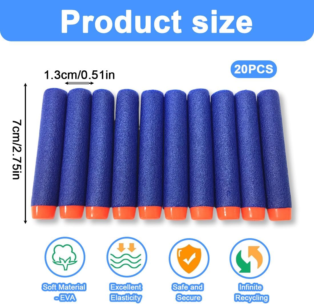 Dimensioni universali: Ogni dardo misura 7 cm × 1,3 cm ed è caratterizzato da un design classico blu. Realizzati in materiale EVA resistente con una struttura interna cava, garantiscono prestazioni ottimali durante il gioco Compatibilità ampia: Compatibili con la maggior parte delle pistole Nerf Elite, questi dardi sono ideali per missioni emozionanti e battaglie ricche di azione, offrendo un'esperienza di gioco senza interruzioni Munizioni sufficienti: Il set include un numero adeguato di dardi per prepararti a lunghe sessioni di gioco, garantendo divertimento continuo durante le battaglie e le missioni con amici e familiari Contenuto pratico: Fornito con 20 dardi in schiuma progettati per un facile trasporto e una conservazione sicura. Perfetti per migliorare l'esperienza di gioco e mantenere tutto in ordine dopo l'uso Consigli di sicurezza: Le punte dei dardi in schiuma sono in plastica e leggermente rigide. Evitare il contatto diretto con altre persone e non mirare al viso per prevenire eventuali lesioni durante il gioco