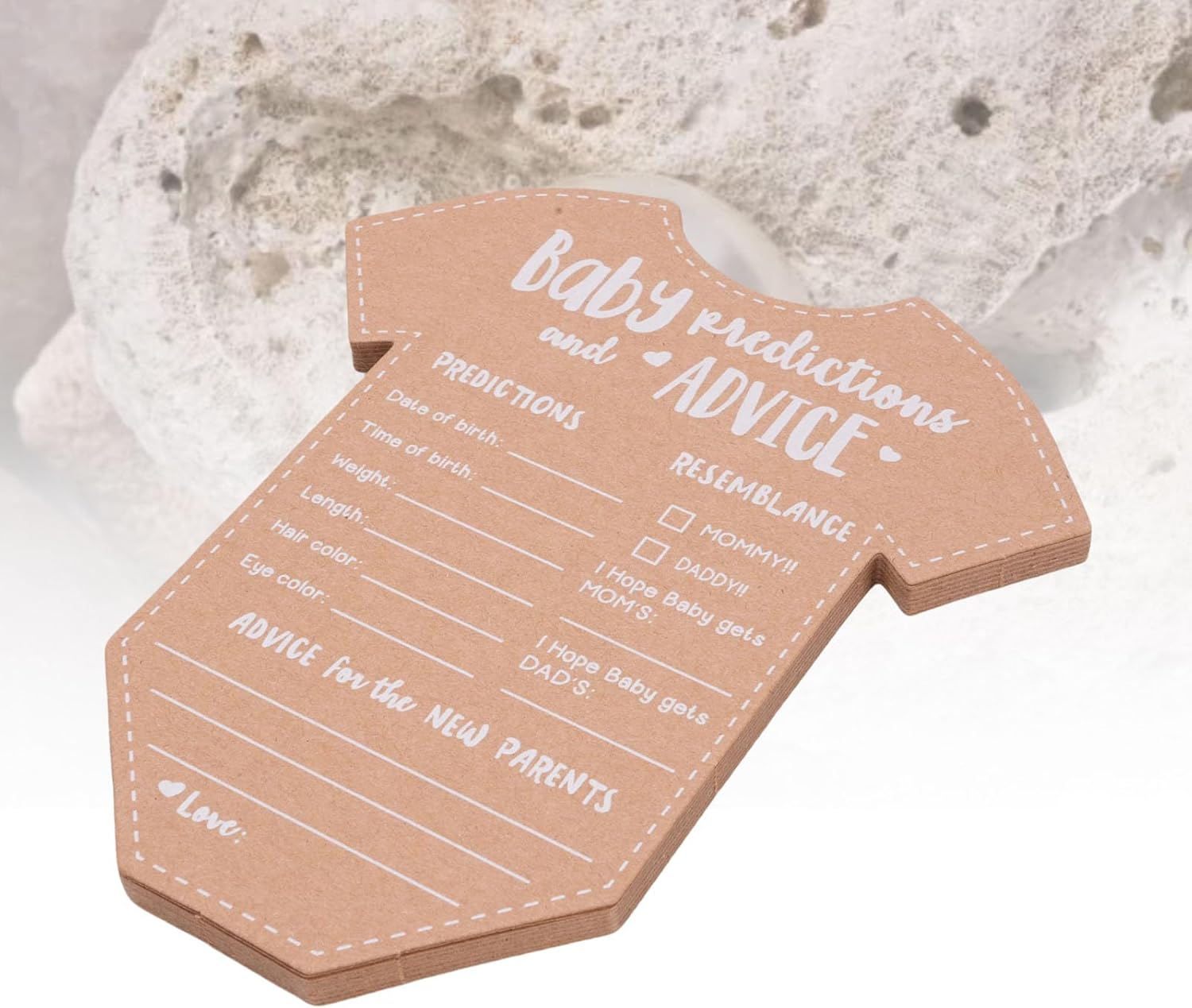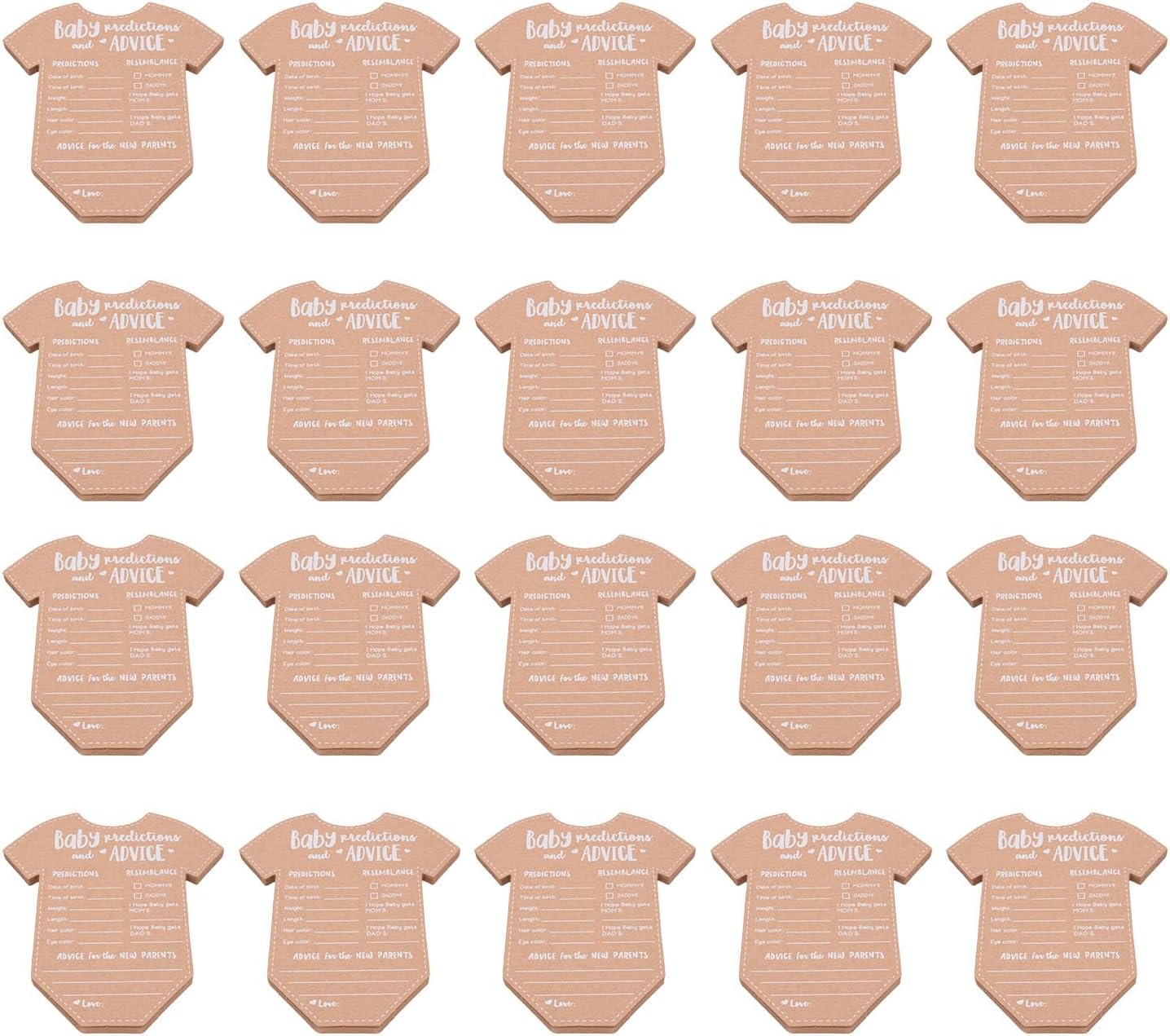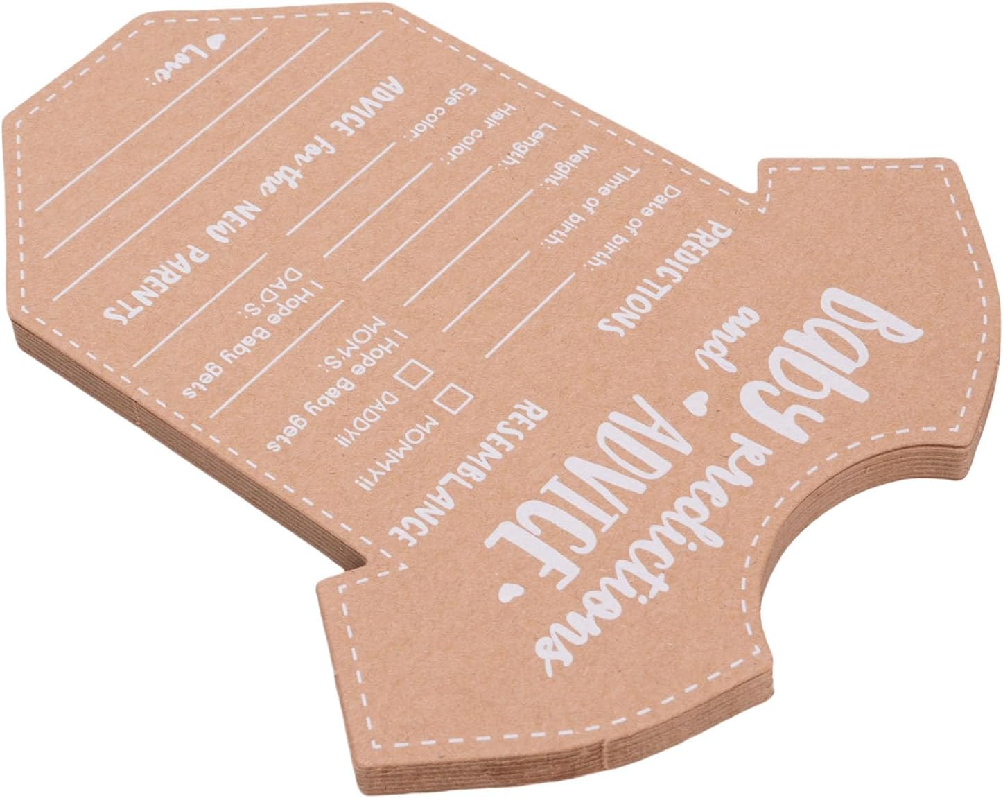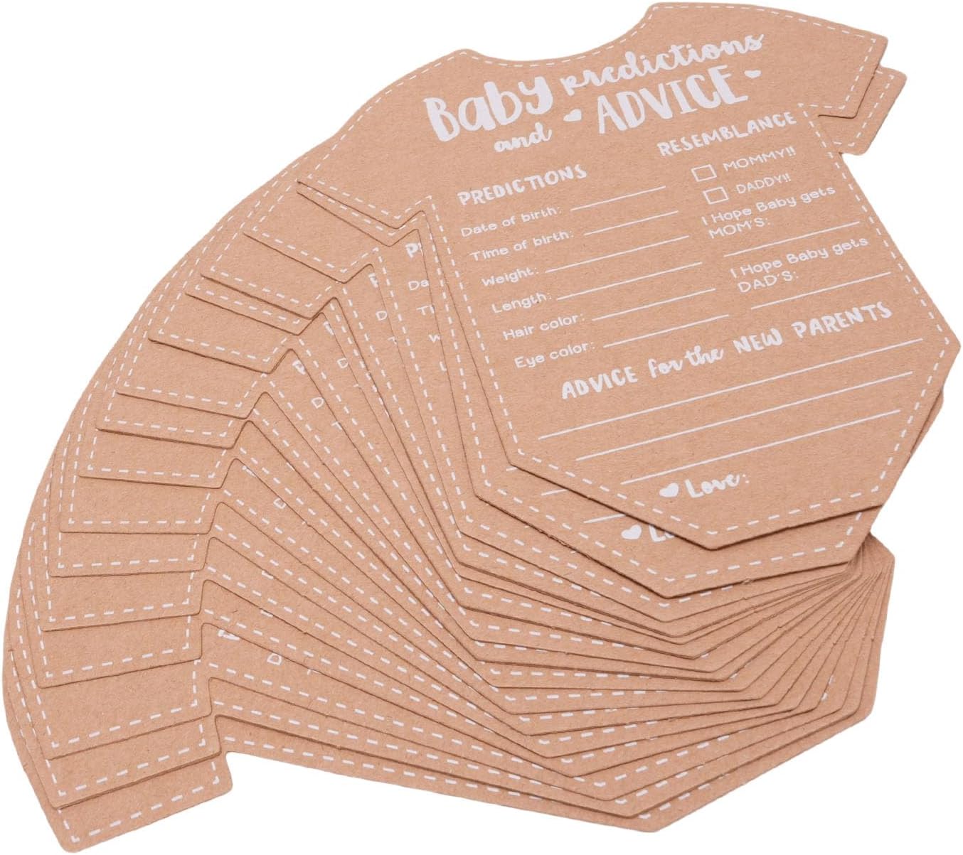 Memorabili ricordi: queste carte per le decorazioni per baby shower sono adatte per preservare i ricordi. Dopo la nascita del bambino, i nuovi genitori possono rivisitare questi messaggi e previsioni sinceri, creando un viaggio sentimentale su cui guardare indietro, pieno di amore e risate man mano che la famiglia cresce. Materiale di carta Kraft eccellente: realizzato con carta kraft spessa e non sanguinante, queste schede di previsione del bambino assicurano una scrittura slick senza sanguinare a inchiostro. Questa qualità consente ai nuovi genitori di annotare facilmente i loro desideri e previsioni per il loro piccolo, creando un ricordo duraturo che possono fare tesoro per gli anni a venire. Uso versatile: con un retro vuoto disponibile per ulteriori suggerimenti o singoli messaggi, queste carte dei giochi per baby shower soddisfano i requisiti di tutti. Permette un'esperienza coinvolgente nelle docce per bambini, in cui gli ospiti possono condividere liberamente le loro intuizioni, consigli e benedizioni, rendendo l'evento interattivo e memorabile. Ampia applicazione: che si tratti di una baby shower, di una festa di rivelazione di genere o di una celebrazione di compleanno, queste carte di consulenza per il matrimonio sono una buona aggiunta a qualsiasi evento. Non servono come arredamento affascinante, ma anche come oggetti di gioco coinvolgenti, migliorando l'atmosfera gioiosa, fornendo agli ospiti un modo per contribuire al del bambino in modo significativo. Design affascinante: le schede di consulenza per baby shower sono progettate a forma di tutina adorabili, fornendo ampio spazio per scrivere informazioni essenziali e messaggi sinceri. Questo design giocoso non rende le carte visivamente accattivanti, ma aggiunge anche un elemento divertente alla doccia o alla celebrazione, incoraggiando gli ospiti a partecipare.