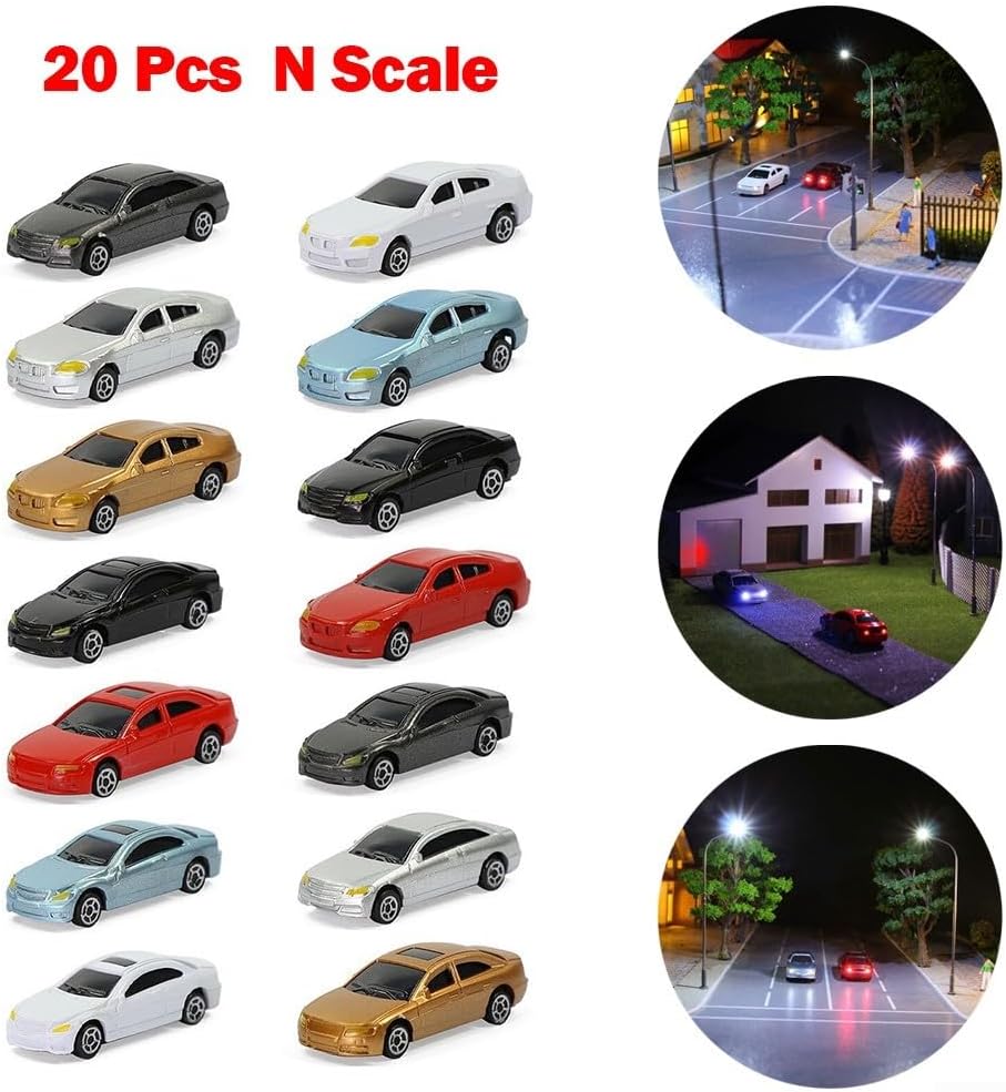 Modellino di auto illuminato: questo set include 20 modellini di auto perfetti per aggiungere uno scenario realistico al layout del tuo modellino. Tecnologia LED: i modellini di auto sono realizzati con luci a LED, fornendo un'illuminazione luminosa e di lunga durata. Facile da usare: le auto sono progettate per essere utilizzate direttamente con una fonte di alimentazione da 12 V o 16 V, grazie alla resistenza integrata. Corrente di funzionamento corretta: per garantire prestazioni ottimali, si prega di applicare la corrente di funzionamento consigliata di 20 mA ai modelli di auto. Dettagli realistici: i modellini di auto sono realizzati in plastica e sono progettati in una scala di riferimento di 1:150, rendendoli adatti per layout in scala N.