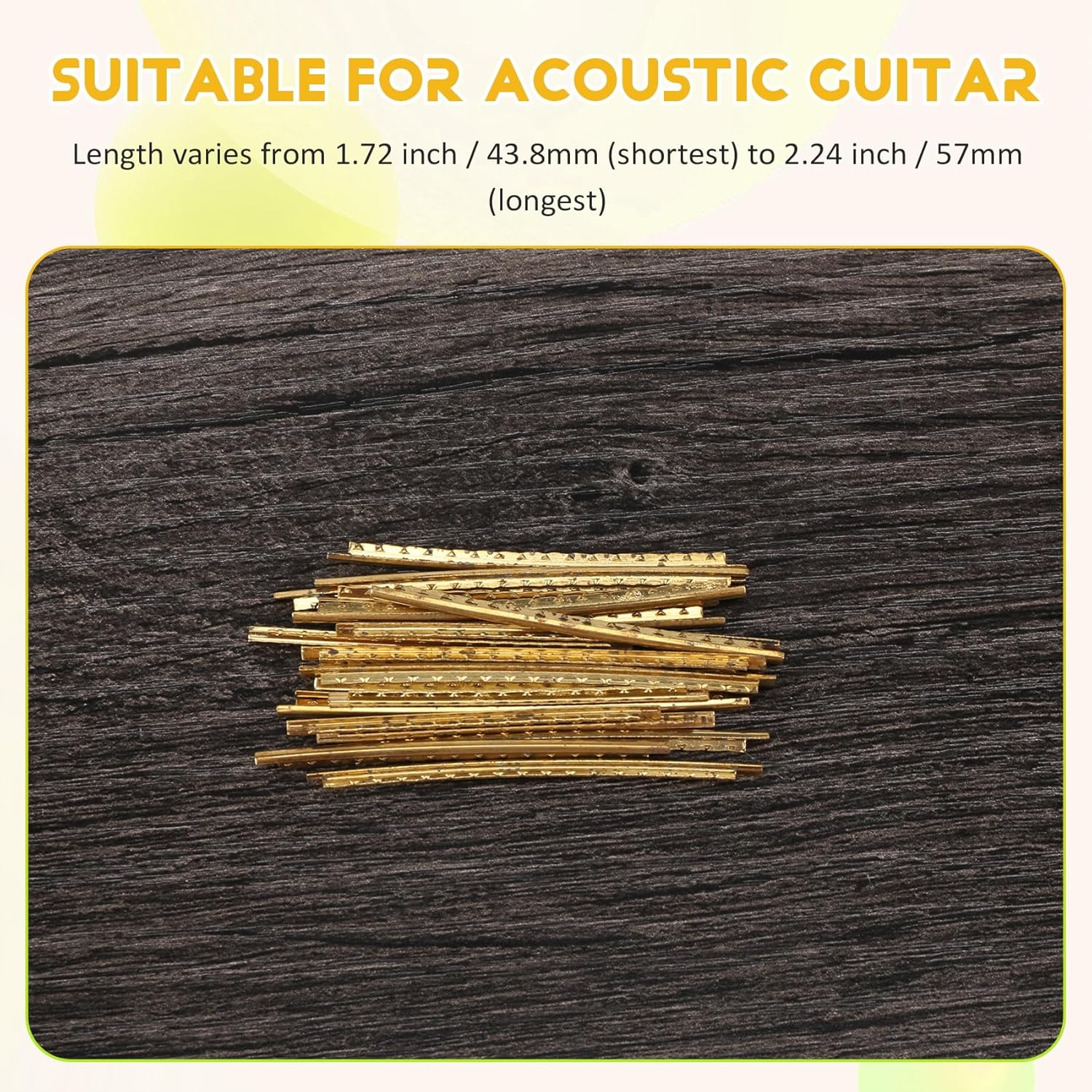 adatto per chitarra acustica 100 % di zecca e alta qualità la lunghezza varia da 1,72 pollici / 43,8 mm (il più corto) a 2,24 pollici / 57 mm (il più lungo) ogni larghezza della del tasto è di ca. 0,078 pollici / 2 mm