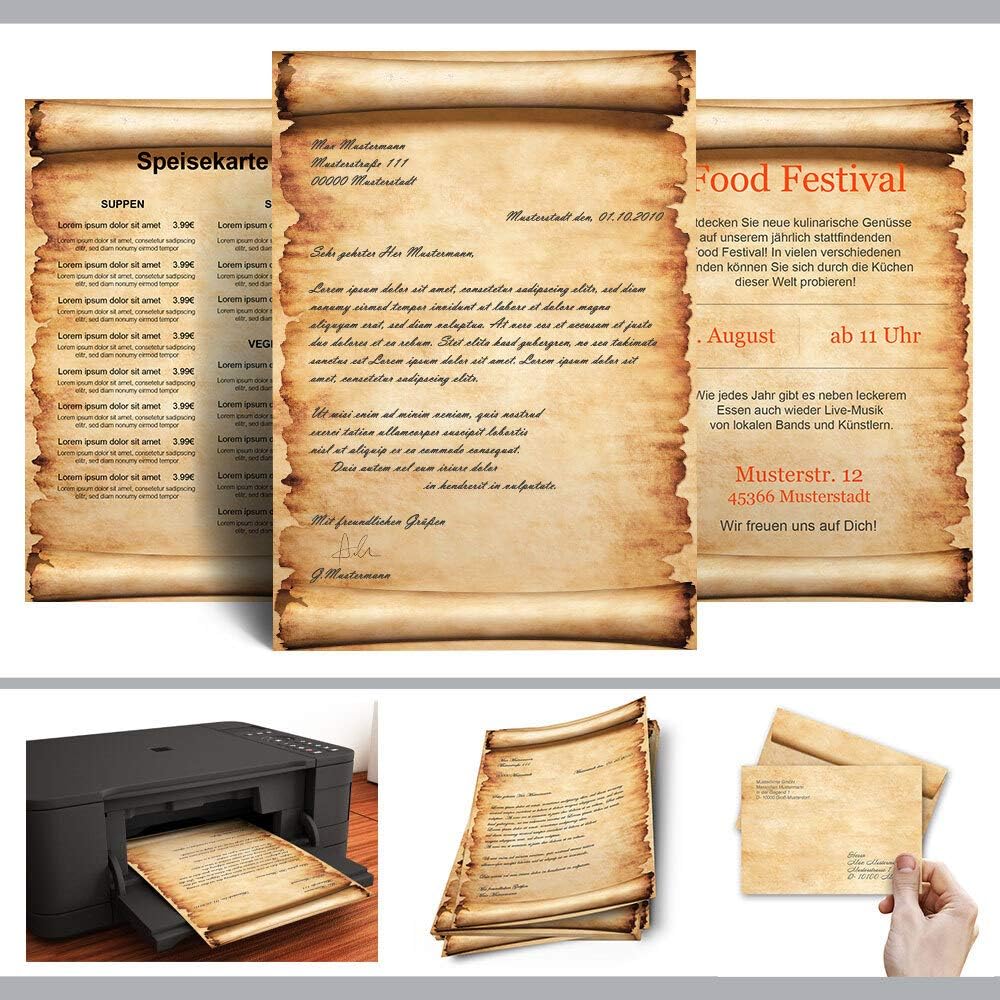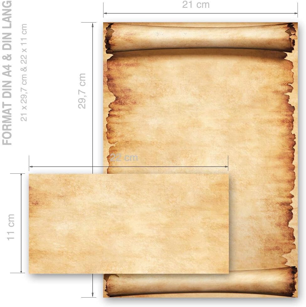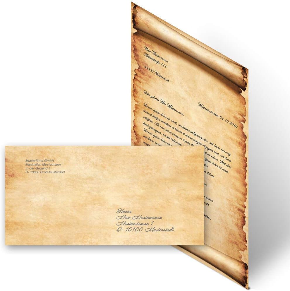 Motivo-set di cancelleria Antico & Storia, PERGAMENA | Ordine in linea! | Paper-Media | 10 pezzi Carta da lettera ez 10 buste (senza finestra) La carta viene è stampata su un lato - Retro è bianco - Carta da lettera in formato DIN A4 - (210x297 mm), 90g/m² Buste formato - DIN LANG (110x220 mm) senza finestra, Autoadesive, con strisce adesive - Abbinabili alla carta da lettera con lo stesso nome, con stampa di motivi decorativi Adatta per la stampa con stampante a getto d'inchiostro o laser e per fotocopiatrici. Utilizzabile anche per la scrittura a mano. Scopri i nostri set di cancelleria con motivi unici da diverse categorie | Cancelleria e buste adatte in un set pratico Motivo-set di cancelleria Antico & Storia, Pergamena