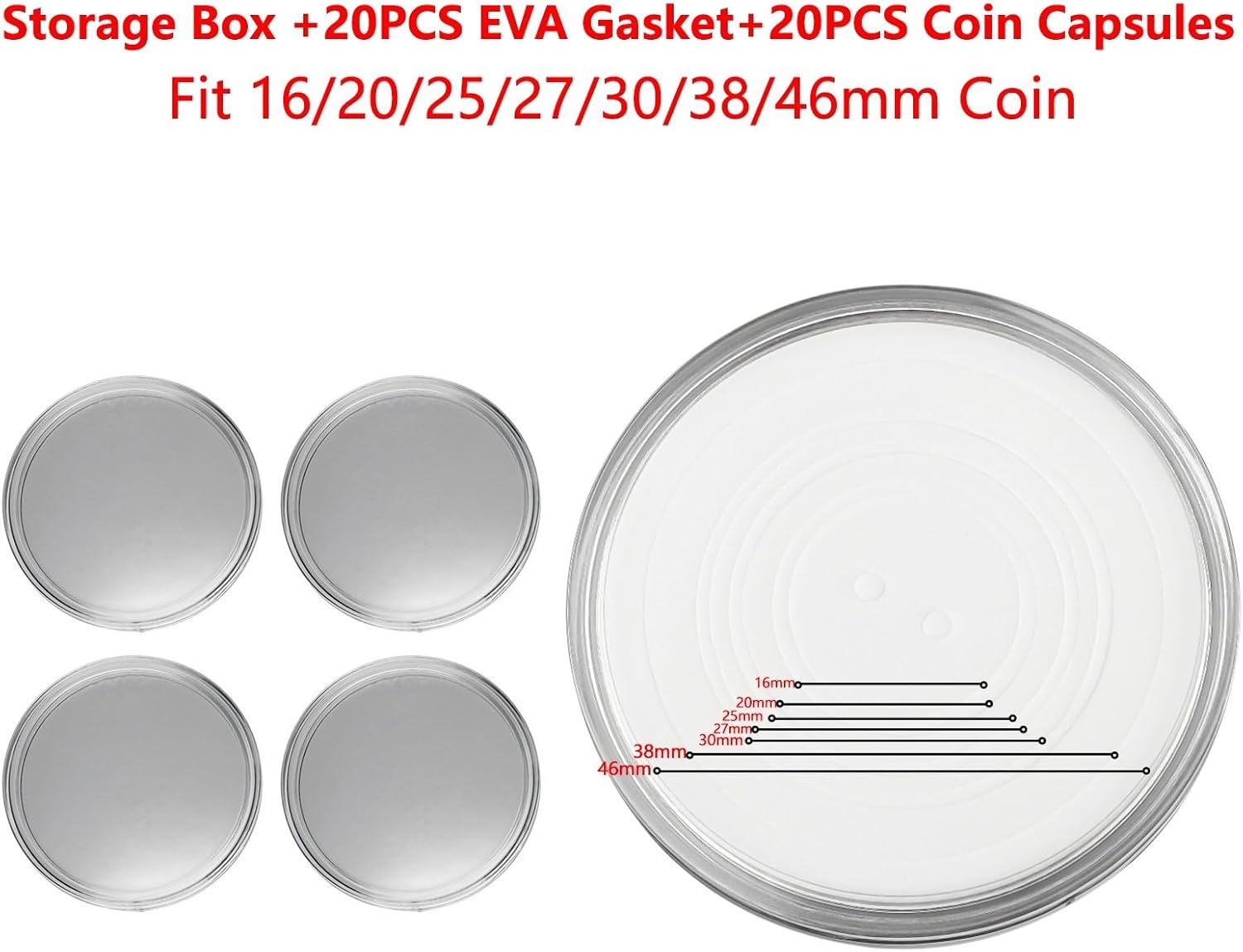Capsule rotonde trasparenti: realizzate in materiale PS riutilizzabile e leggero, questi portamonete forniscono protezione contro i danni. Il guscio trasparente e piatto consente una visione chiara sia della parte anteriore che posteriore della moneta. Sicure e facili da usare: queste capsule per monete sono progettate con un meccanismo di blocco sicuro e facile da aprire. Sono dotati di 8 misure di cuscinetti in EVA morbidi per adattarsi a quasi tutti i tipi di monete in Cina. Rifinito con cura: il rivestimento ultra spesso, super duro e altamente trasparente garantisce la longevità di queste capsule per monete. Il loro design allineato al cerchio e i bordi ben rifiniti migliorano il loro fascino visivo. Portatile e conveniente: queste capsule per monete sono facili da usare e trasportare. Sono dotati di una scatola che misura circa 148 mm x 57 mm x 56 mm, che lo rende comodo per riporre e trasportare la tua collezione di monete. Compatibilità versatile: queste capsule per monete possono essere utilizzate per tutti i tipi di monete, tra cui monete in rame, argento, commemorative e d'oro. Il set include 20 capsule per monete, 20 guarnizioni in EVA e 1 scatola portaoggetti (monete non incluse).
