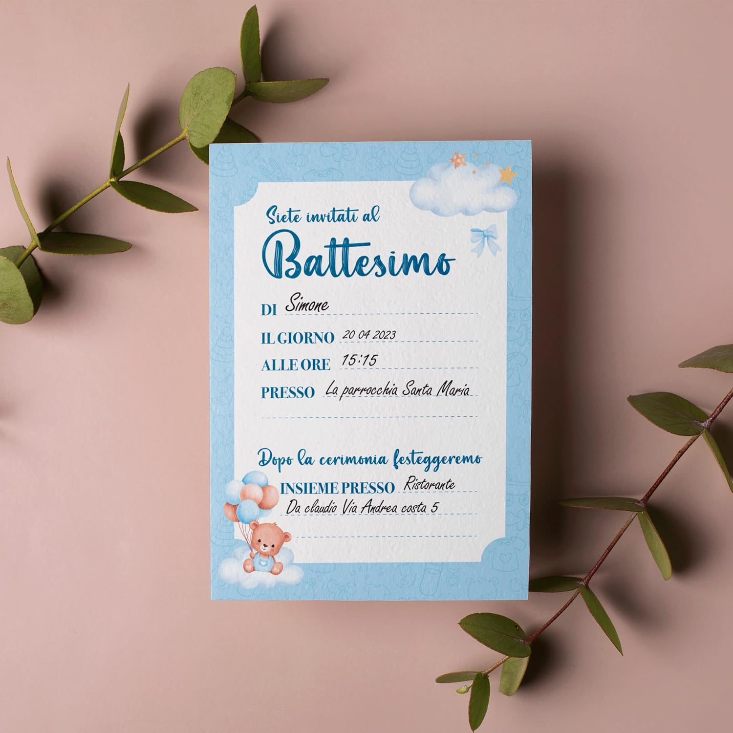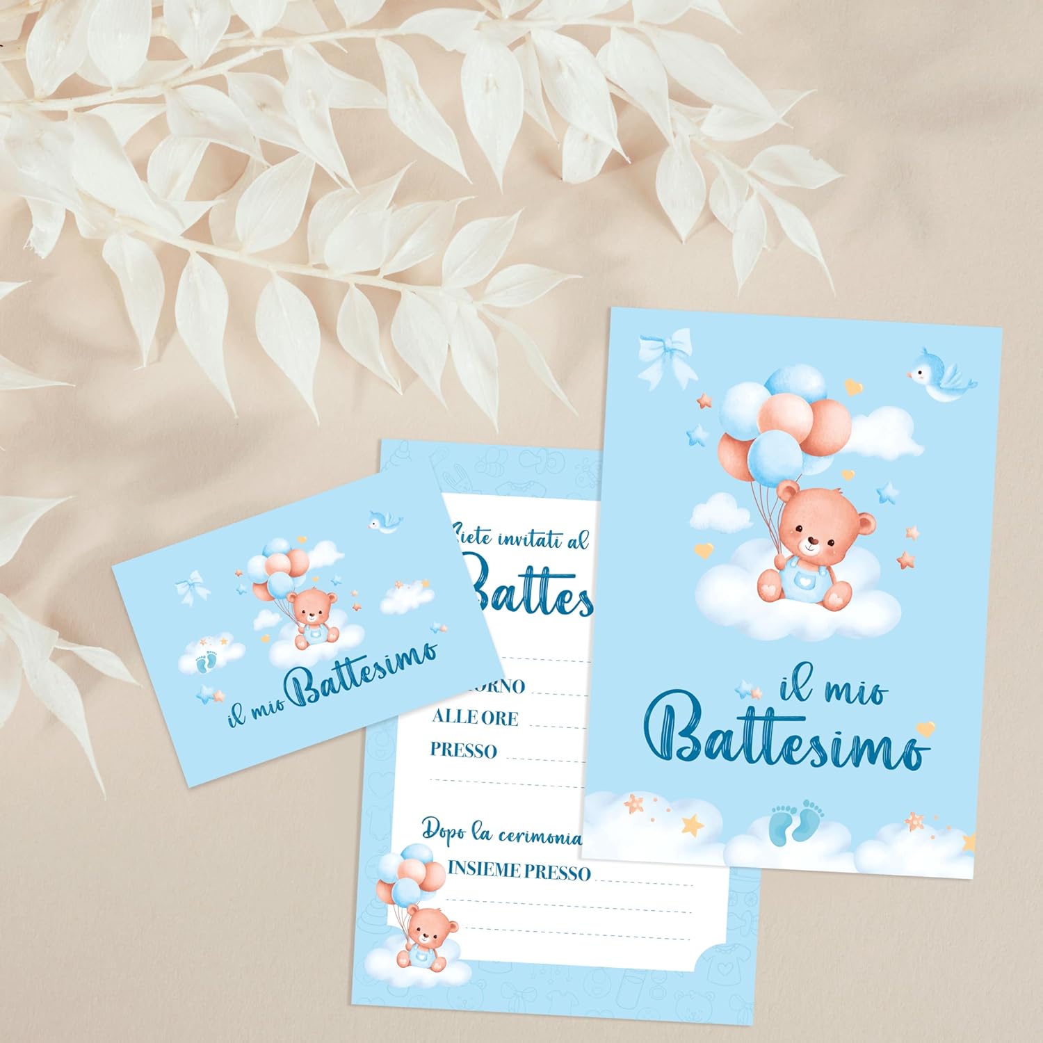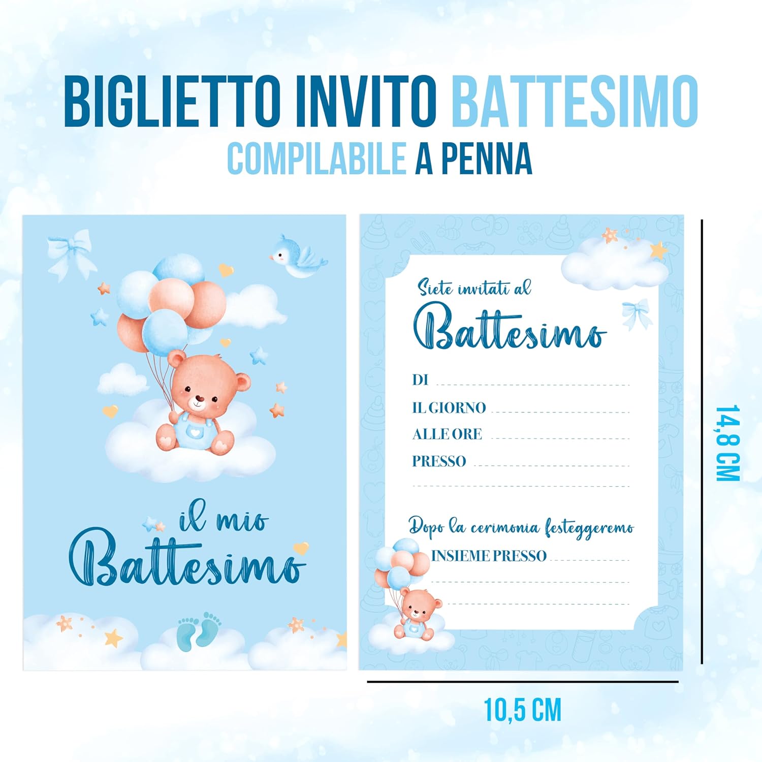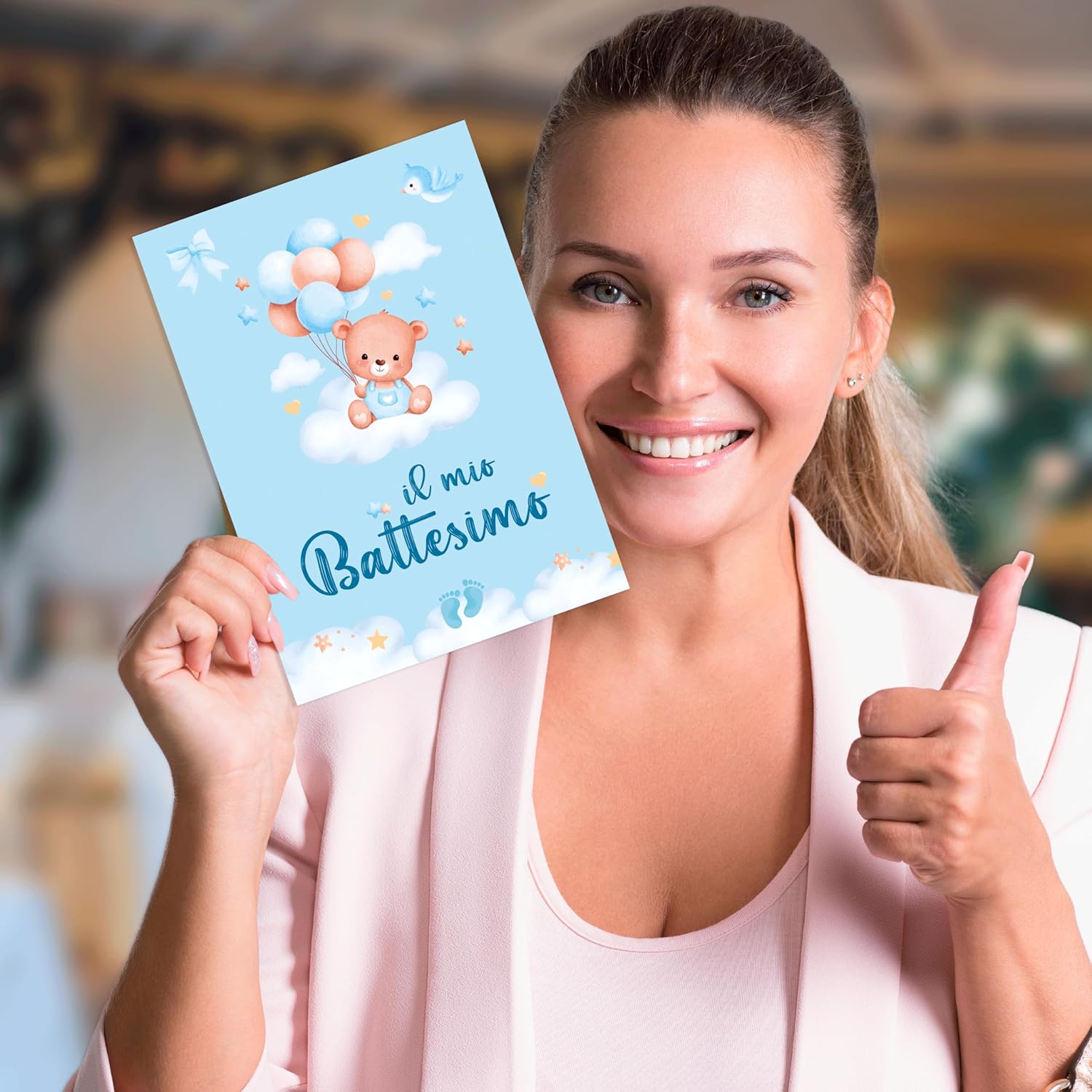 Inviti Battesimo Bimbo con Buste Eleganti 🩵 – 20 Biglietti Inviti e 20 Buste Battesimo Bimbo da compilare per la cerimonia del tuo principe. Grazie al fantastico design a tema renderai l’idea di una cerimonia indimenticabile. Mai più a corto di Inviti Battesimo Bimbo 👶 - 20 Partecipazioni Inviti Battesimo Bambino – L’elegante design a tema Orsacchiotto è il più ricercato per l’occasione. Ideale per i maschietti lascerà gli invitati senza parole, effetto wow assicurato! Biglietti Invito Battesimo Bimbo 🐻 - Un Battesimo Indimenticabile! È arrivato il fatidico momento di invitare i tuoi parenti… Grazie agli inviti a tema Orsacchiotto Azzurro potrai finalmente consegnare l’invito di battesimo più originali di sempre! Set Battesimo ✔️ - Nessun escluso dalla cerimonia di vostro figlio – 20 Inviti con 20 Buste Battesimo Bimbo sufficienti per invitare tutti i parenti. L’elegante biglietto formato A6 con grammatura 300 Gr è adatto per essere compilato sia a penna che a matita, il nostro kit Battesimo completo è orgogliosamente Made in Italy. Kit Battesimo Bambino🎉 – I nostri inviti da battesimo sono perfetti per l’occasione, aggiungeranno quel tocco in più di allegria per una cerimonia tutta da ricordare!