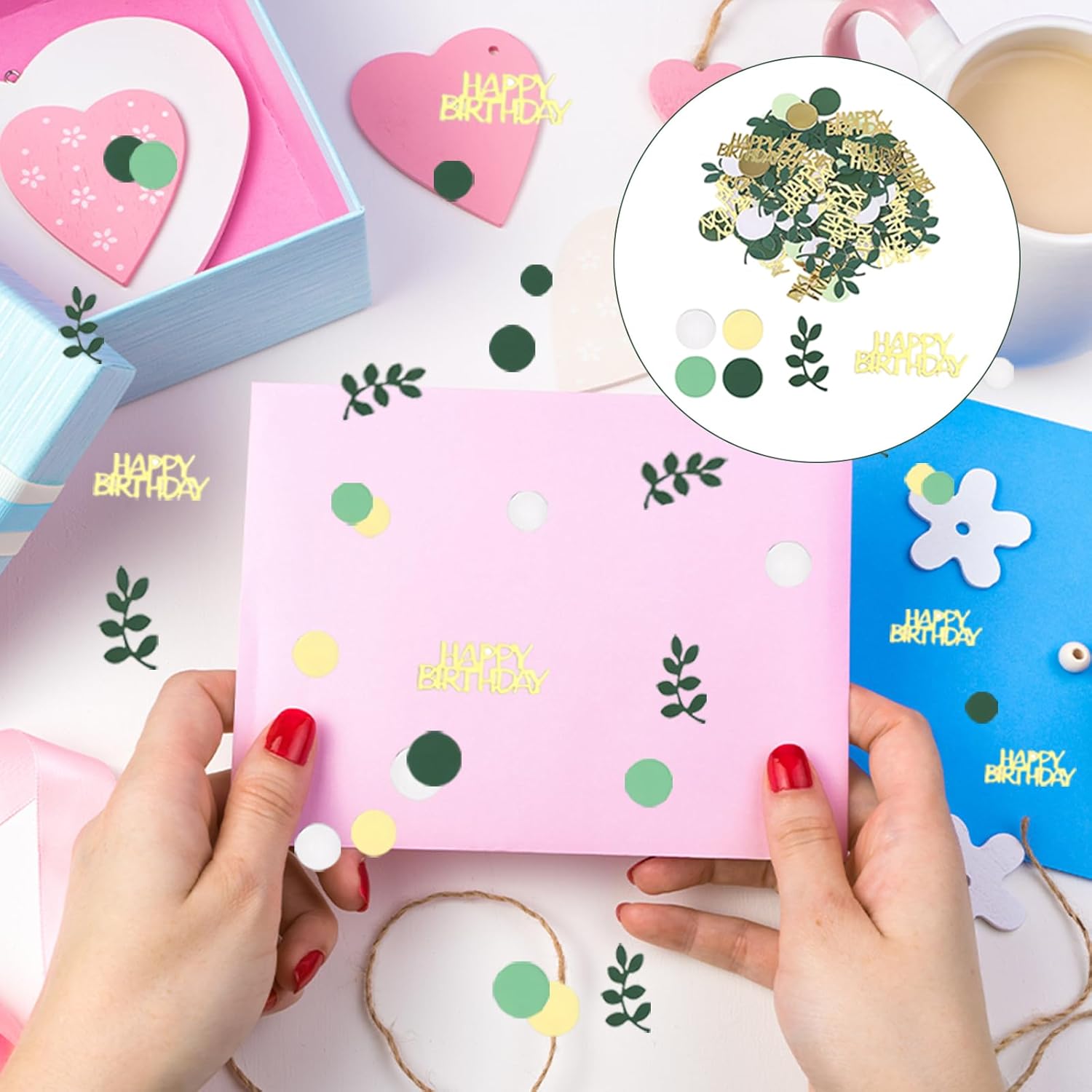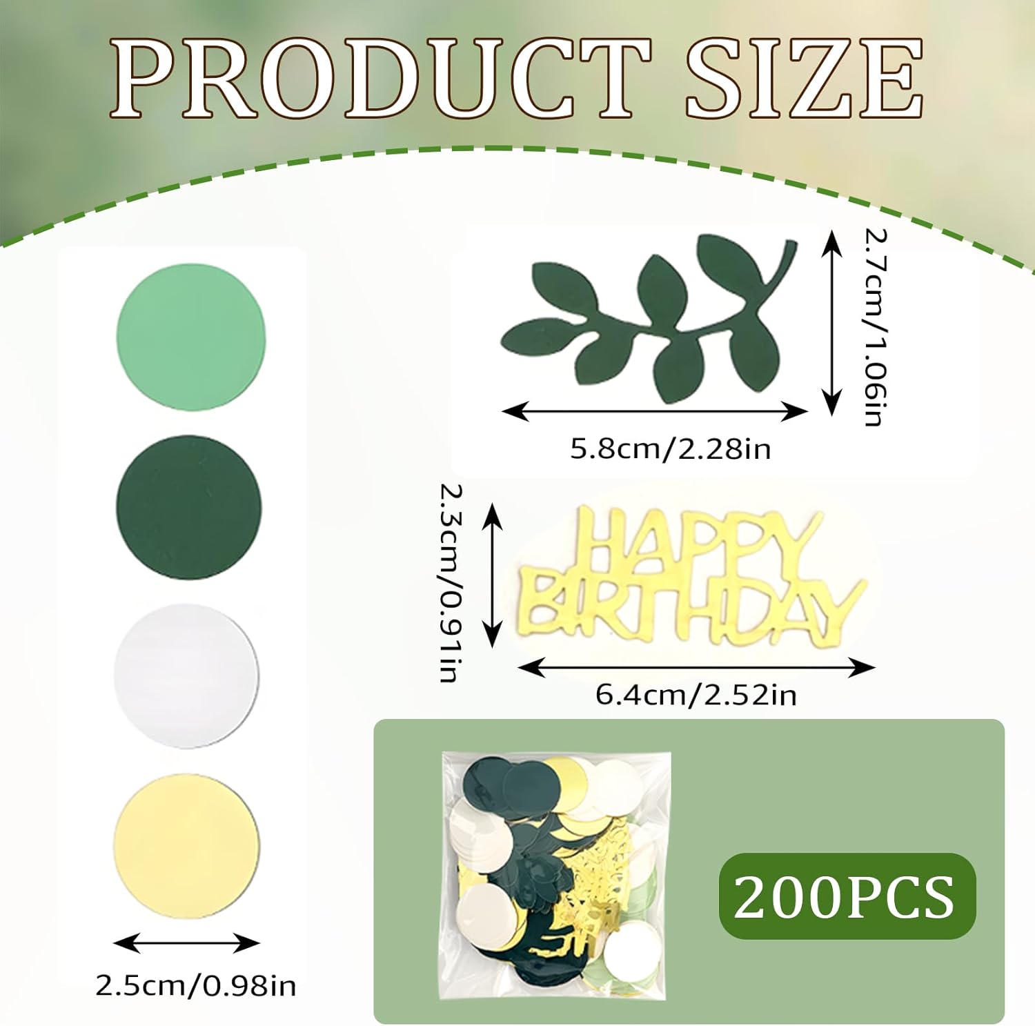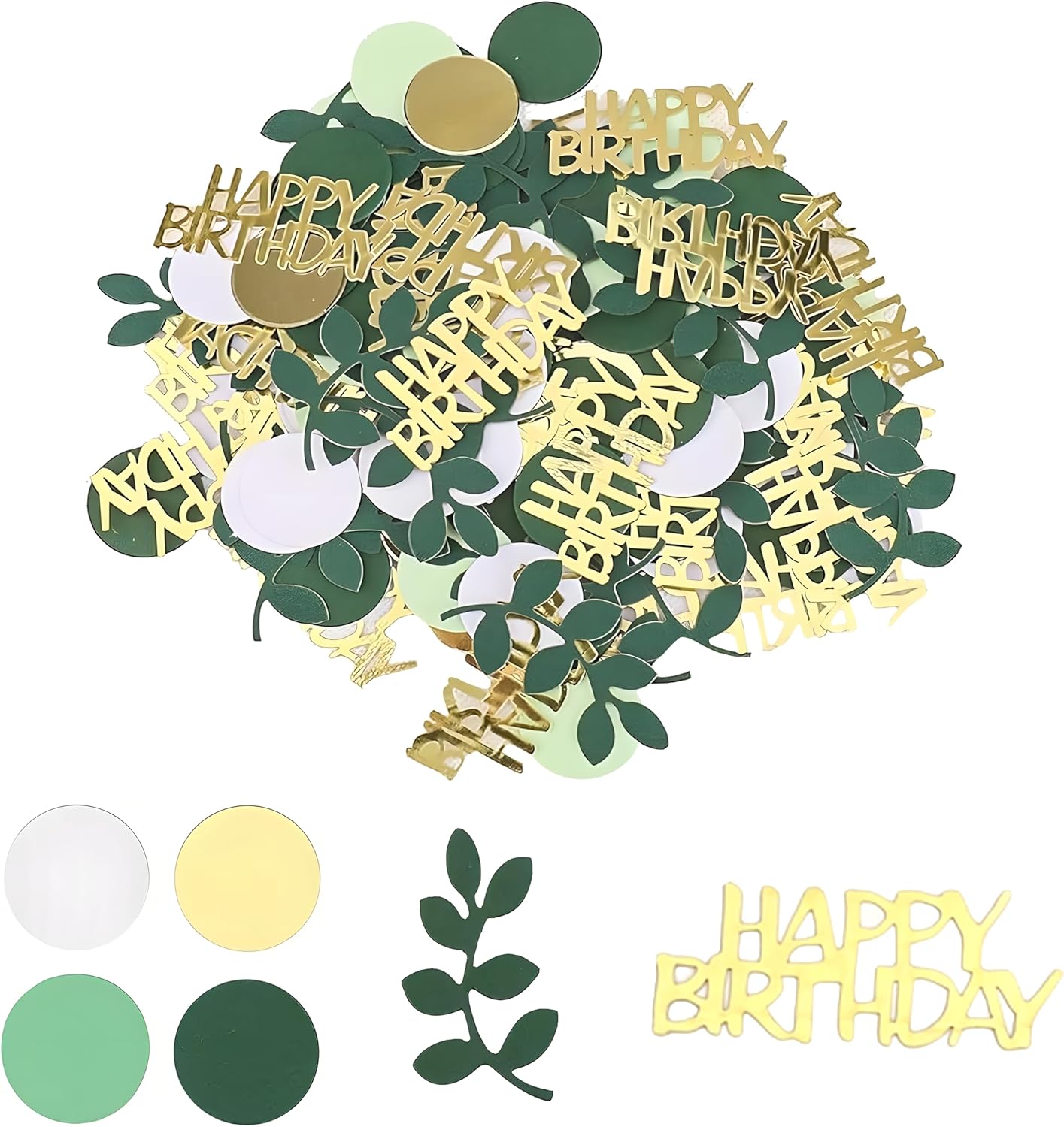 Decorazione festosa ed elegante: questo set di 200 coriandoli di compleanno contiene una varietà di disegni, tra cui coriandoli "HAPPY BIRTHDAY", foglie tropicali verde eucalipto e cerchi metallici dorati. Perfetti per adornare la tua tavola di compleanno o qualsiasi celebrazione speciale, questi coriandoli aggiungono un tocco gioioso e raffinato. Colori e fantasie armoniose: la combinazione dei colori verde salvia e oro crea un'atmosfera calda e moderna. Questi coriandoli di compleanno sono perfetti per una vasta gamma di occasioni, dalle feste dei bambini ai compleanni degli adulti, o anche baby shower e celebrazioni più intime. Materiali durevoli e sicuri: realizzati in cartoncino, questi coriandoli non si deformano facilmente. Leggeri al tatto, sono perfetti per essere sparsi sui tavoli, senza rischio di deteriorarsi. Inoltre sono facili da maneggiare e aggiungono un tocco elegante a qualsiasi festa. Versatili e creativi: oltre all'utilizzo sulle tavole dei compleanni, questi coriandoli possono essere utilizzati anche per decorare biglietti di auguri, confezioni regalo o come elementi fai da te. Puoi anche aggiungerli in sacchetti regalo o buste a sorpresa per personalizzare i tuoi regali. Sicurezza e precauzioni: Questi coriandoli sono piccoli, quindi è consigliabile tenerli fuori dalla portata dei bambini piccoli per evitare qualsiasi rischio di ingestione. Usali sotto la supervisione di un adulto per garantire un utilizzo senza rischi durante la festa