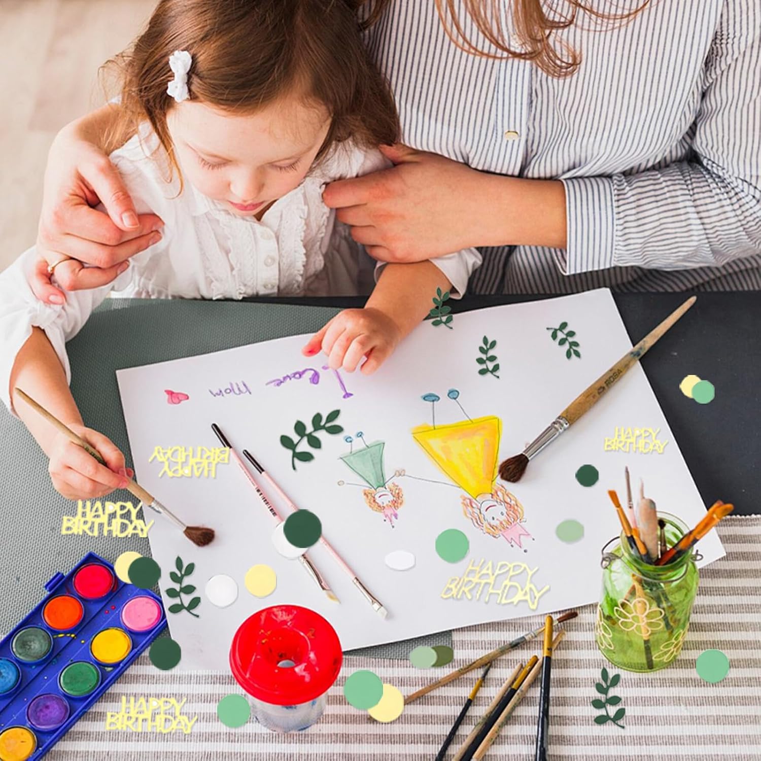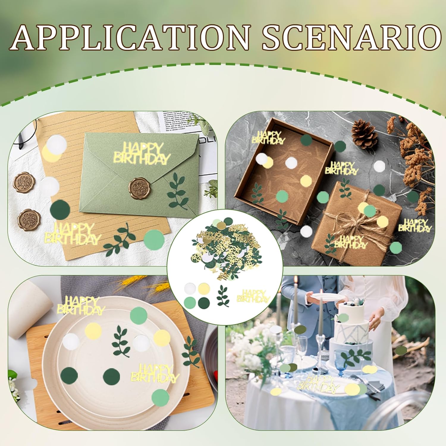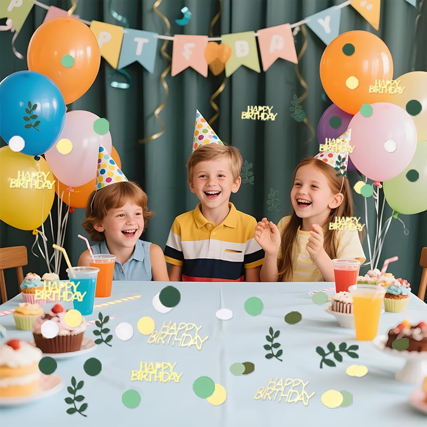 Decorazione festosa ed elegante: questo set di 200 coriandoli di compleanno contiene una varietà di disegni, tra cui coriandoli "HAPPY BIRTHDAY", foglie tropicali verde eucalipto e cerchi metallici dorati. Perfetti per adornare la tua tavola di compleanno o qualsiasi celebrazione speciale, questi coriandoli aggiungono un tocco gioioso e raffinato. Colori e fantasie armoniose: la combinazione dei colori verde salvia e oro crea un'atmosfera calda e moderna. Questi coriandoli di compleanno sono perfetti per una vasta gamma di occasioni, dalle feste dei bambini ai compleanni degli adulti, o anche baby shower e celebrazioni più intime. Materiali durevoli e sicuri: realizzati in cartoncino, questi coriandoli non si deformano facilmente. Leggeri al tatto, sono perfetti per essere sparsi sui tavoli, senza rischio di deteriorarsi. Inoltre sono facili da maneggiare e aggiungono un tocco elegante a qualsiasi festa. Versatili e creativi: oltre all'utilizzo sulle tavole dei compleanni, questi coriandoli possono essere utilizzati anche per decorare biglietti di auguri, confezioni regalo o come elementi fai da te. Puoi anche aggiungerli in sacchetti regalo o buste a sorpresa per personalizzare i tuoi regali. Sicurezza e precauzioni: Questi coriandoli sono piccoli, quindi è consigliabile tenerli fuori dalla portata dei bambini piccoli per evitare qualsiasi rischio di ingestione. Usali sotto la supervisione di un adulto per garantire un utilizzo senza rischi durante la festa