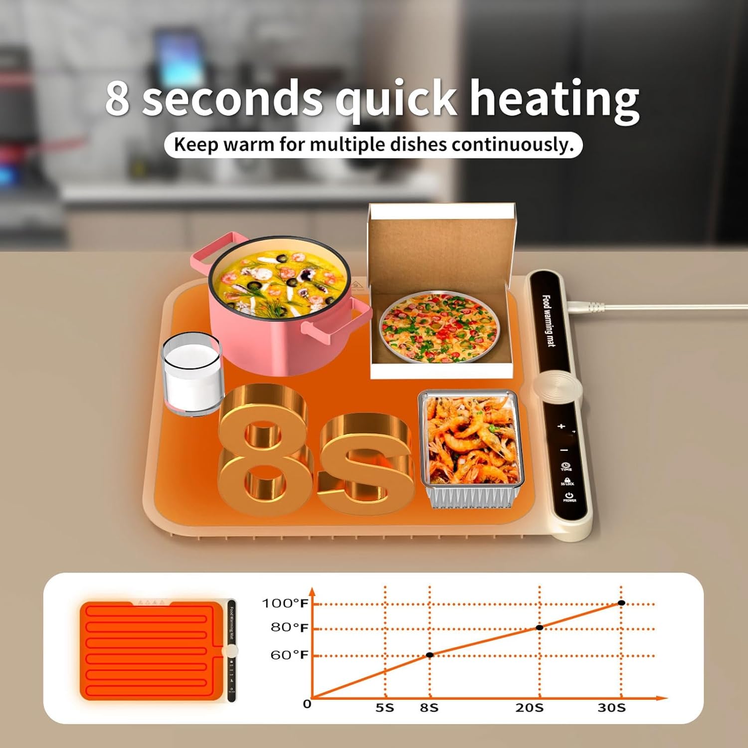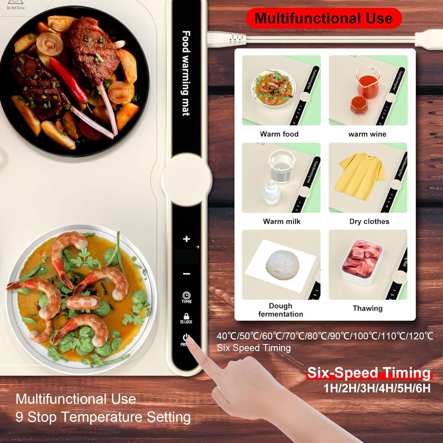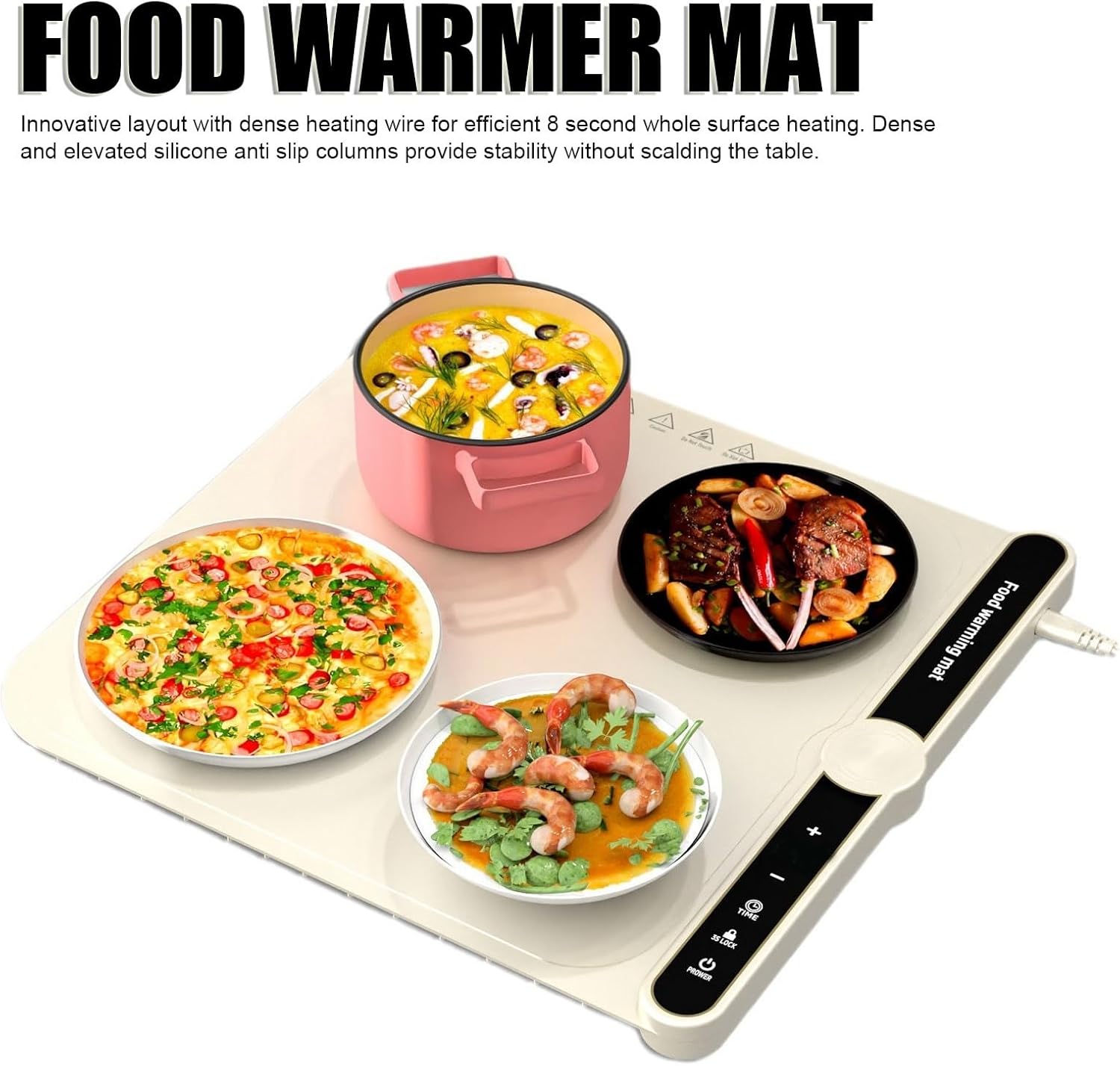 [Design sottile e flessibile] Realizzato in materiale siliconico resistente all'usura e alle alte temperature, facile pulire e può essere arrotolato per riporlo in modo compatto. ideale per viaggi e picnic. [Controllo preciso della temperatura] Dispone di 6 impostazioni di temporizzazione e 9 opzioni di temperatura per soddisfare le varie esigenze culinarie. pannello di controllo intelligente e intuitivo facile regolazione, con funzione di blocco bambini per la sicurezza. [Compatto e portatile] L'ampio pannello 40x38 cm con tecnologia di riscaldamento a micro garantisce un riscaldamento efficiente. il pannello flessibile in silicone si riscalda rapidamente ed è adatto a un'ampia gamma di pentole a fondo piatto. [Tecnologia di riscaldamento efficiente] Il layout innovativo con filo riscaldante garantisce un riscaldamento rapido e completo di 8 secondi per l'intero . Le colonne antiscivolo in silicone forniscono stabilità senza danneggiare il tavolo. [Utilizzo versatile] Adatto per riscaldare 1-4 piatti contemporaneamente, compatibile con vari materiali di pentole. per scaldare piatti, tè, latte, scongelare, mantenere in caldo, asciugare e cuocere l'impasto.