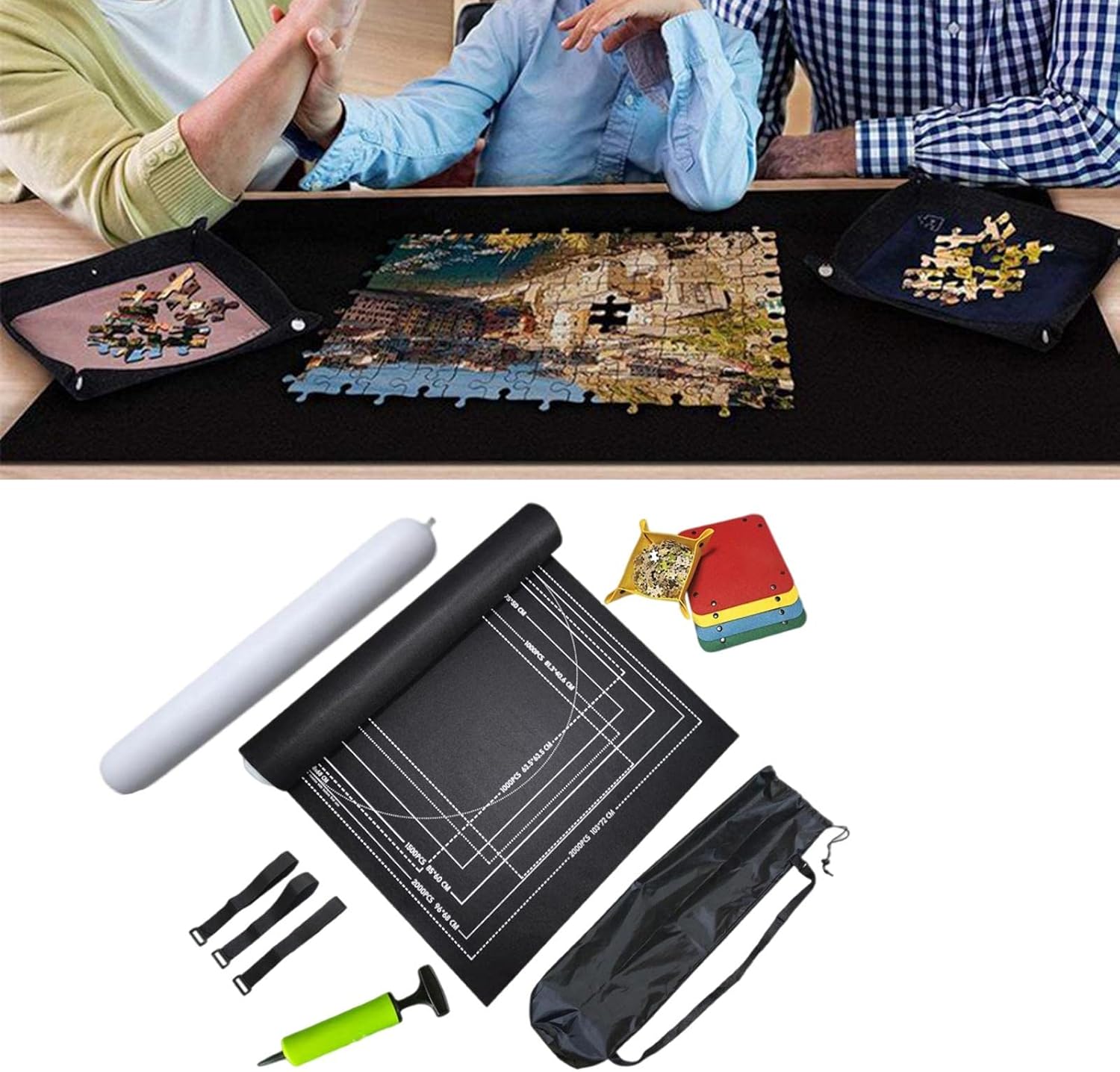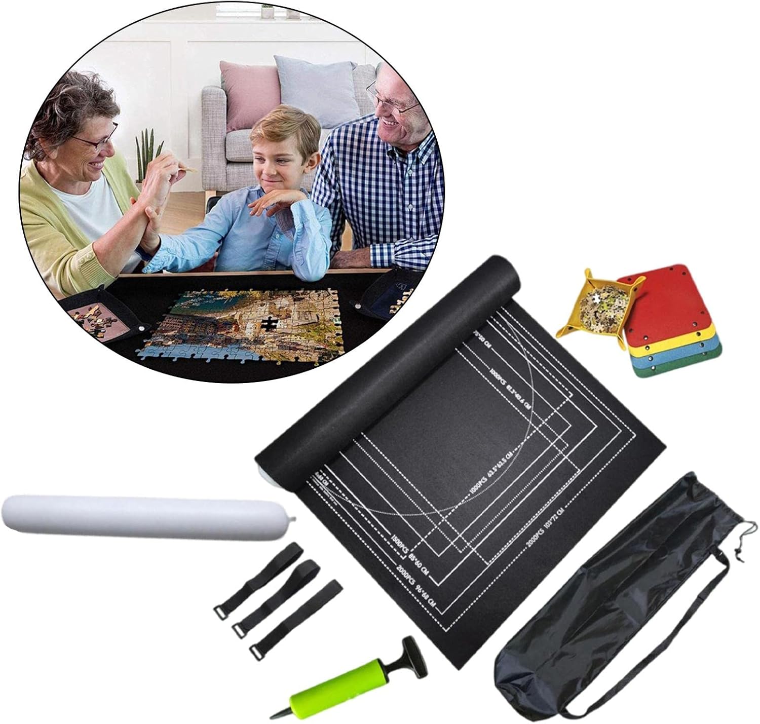 Materiale in feltro di alta qualità, ecologico e durevole. Ottimo per strumenti di gioco di puzzle. Si arrotola facilmente e risparmia spazio. Questo kit include tutto il necessario per rendere i tuoi puzzle portatili o conservarli. Viene fornito con 1 tappetino in feltro antiscivolo, 1 borsa per la conservazione, 3 fasce, 1 bastone gonfiabile, 1 pompa e 4 vassoi di smistamento. Le grandi dimensioni possono contenere puzzle da 2000 pezzi.