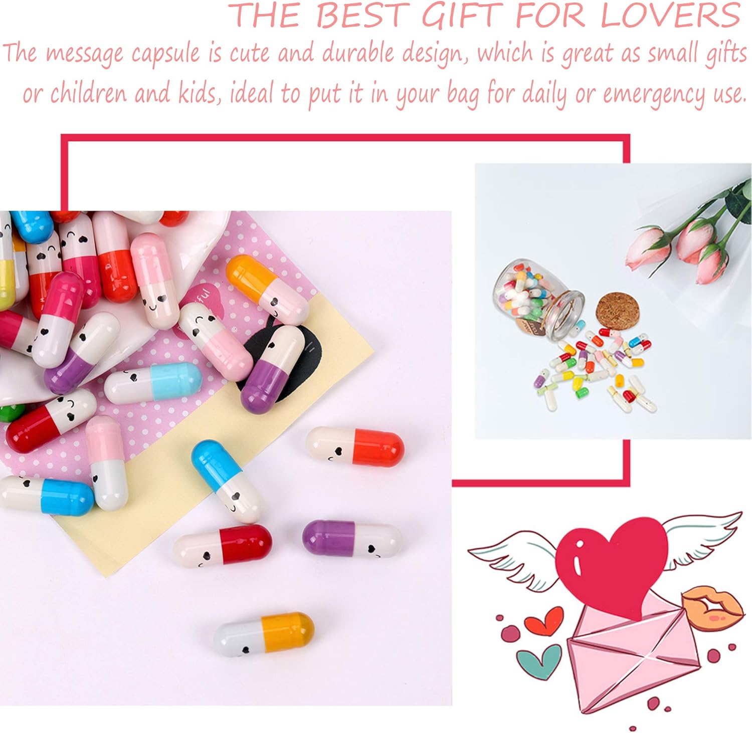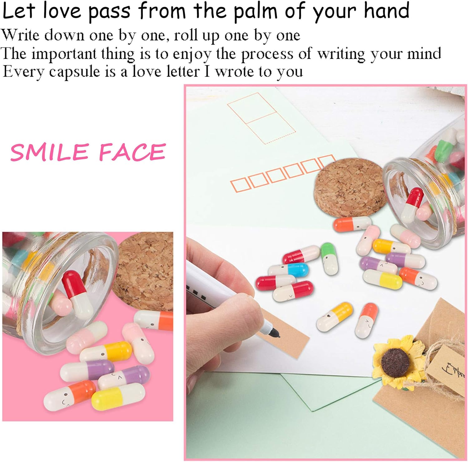 [Materiale ecologico] La capsula della lettera è fatta di gelatina e carta di alta qualità, che è naturale e rispettosa dell'ambiente e facile da degradare.Può aiutare a evitare l'imbarazzo, la timidezza e l'ansia quando si vuole trasmettere l'amore, la gratitudine o piccoli segreti [Facile da usare] Ogni set contiene 200 capsule colorate di 2,7*0,7 cm e strisce di carta colorata di 1,8*4,7 cm, facili da aprire, scrivere e chiudere, per registrare facilmente il vostro stato d'animo, i vostri desideri e le vostre benedizioni. [Trasmissione emozionale] Se volete scrivere quello che volete dire sulla carta e trasmettere in capsula messaggi il vostro amore, i vostri pensieri e la vostra attenzione per amici, familiari e amanti. [Design carino] La bottiglia per messaggi utilizza una varietà di colori che si abbinano a dolci sorrisi, all'amore e ad altri motivi, nonché a strisce di carta colorata per illuminare il vostro umore e trasmettere calore e felicità. [Regali creativi] La capsula dell'amicizia è un regalo unico e significativo che può essere utilizzato per vari regali speciali, una sorpresa personalizzata per amici, genitori, famiglia, amanti.