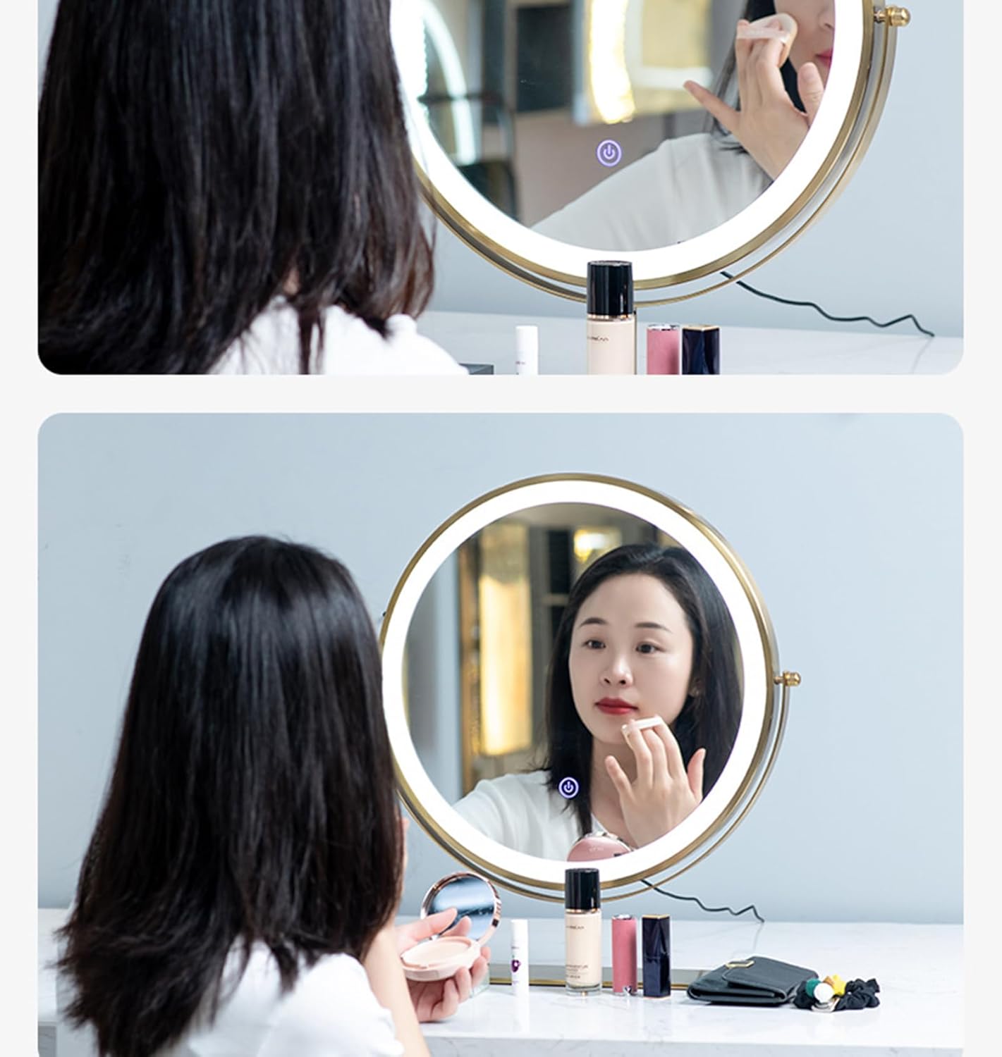 [Illuminazione versatile e luminosità regolabile]: lo specchio cosmetico a LED offre tre opzioni di illuminazione: luce fredda, naturale e calda, per soddisfare diverse occasioni e creare l'atmosfera desiderata. Facile da usare: lo specchio per il trucco a LED è facile da usare. Regola la temperatura del colore o accendi/spegni la luce con una breve pressione e regola la luminosità premendo a lungo il pulsante. Ha anche una funzione di memoria per ricordare le tue impostazioni di illuminazione preferite. [Supporto stabile e rotazione a 360°]: la base in metallo dello specchio per il trucco fornisce un supporto stabile, mentre i cuscinetti antiscivolo impediscono le oscillazioni. Lo specchio rotondo può essere facilmente ruotato di 360° per un angolo di visione perfetto, garantendo un'esperienza di trucco comoda e versatile. [Design elegante]: lo specchio cosmetico rotondo offre una visione completa del viso e distribuisce uniformemente la luce. Il suo bordo liscio aggiunge un tocco elegante e raffinato, rendendolo l'aggiunta perfetta al tuo tavolo da trucco. [Ottima scelta regalo]: questo specchio illuminato è un regalo ideale per gli appassionati di trucco e cura della pelle, così come per coloro che vogliono semplicemente migliorare il proprio aspetto. Perfetto per compleanni, San Valentino, festa della mamma, Natale e altre occasioni speciali.