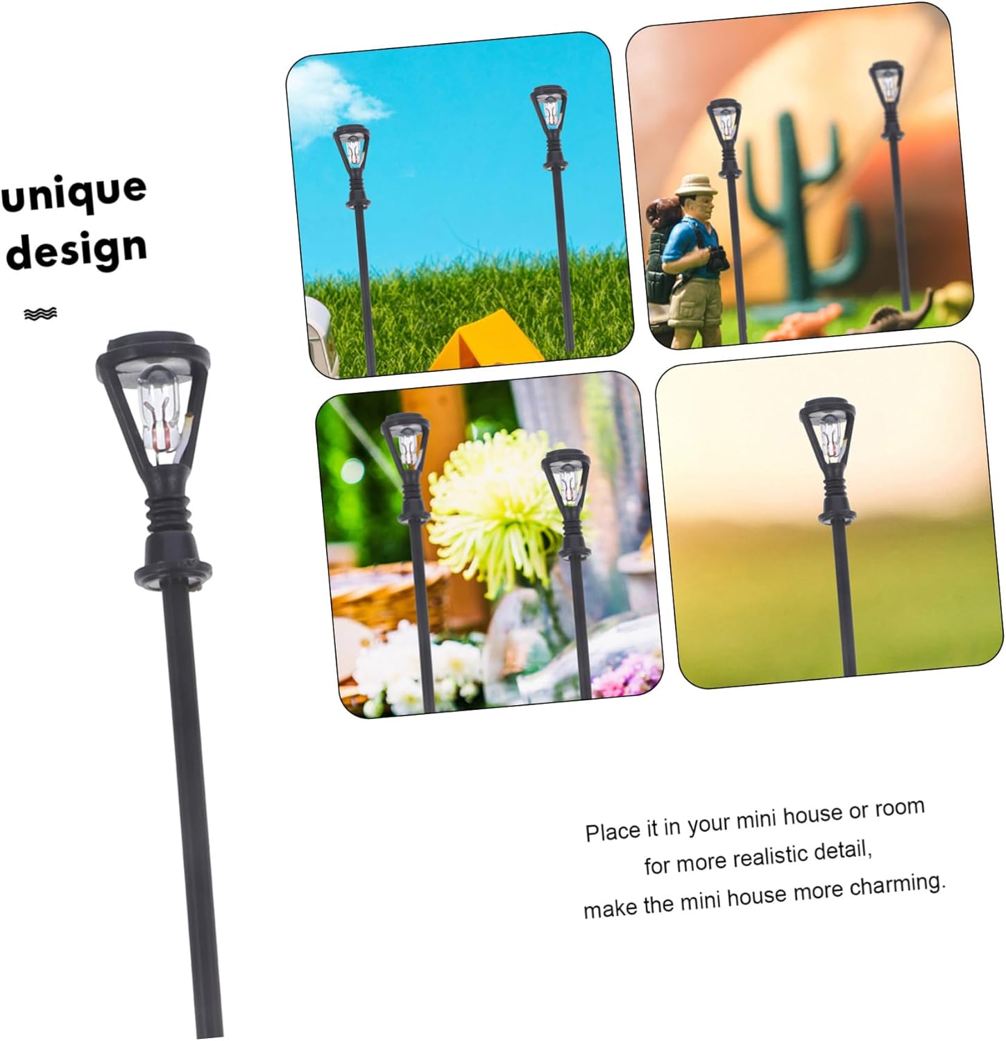 Decorazione del modello di lampada: posizionala nella tua mini casa o stanza per dettagli più realistici, rendi la mini casa più affascinante, miniature di giocattoli per bambini Mini modello di lampione: questo mini modello di lampione può essere l'ornamento decorativo per il tuo modello di mini casa, l'arredamento di un piccolo giardino Decorazione paesaggistica: questa mini lampada è ben progettata per il tuo tavolo di sabbia per avere la migliore decorazione del percorso del mini giardino, modello di lampada Modello di lampione: questo modello di lampione è fantastico per i tuoi amici o familiari che amano i mini mestieri, il modello di mini lampada Lampioni in miniatura: la pregevole fattura garantisce dettagli e aspetto realistici, decorazioni da giardino in miniatura facili da usare