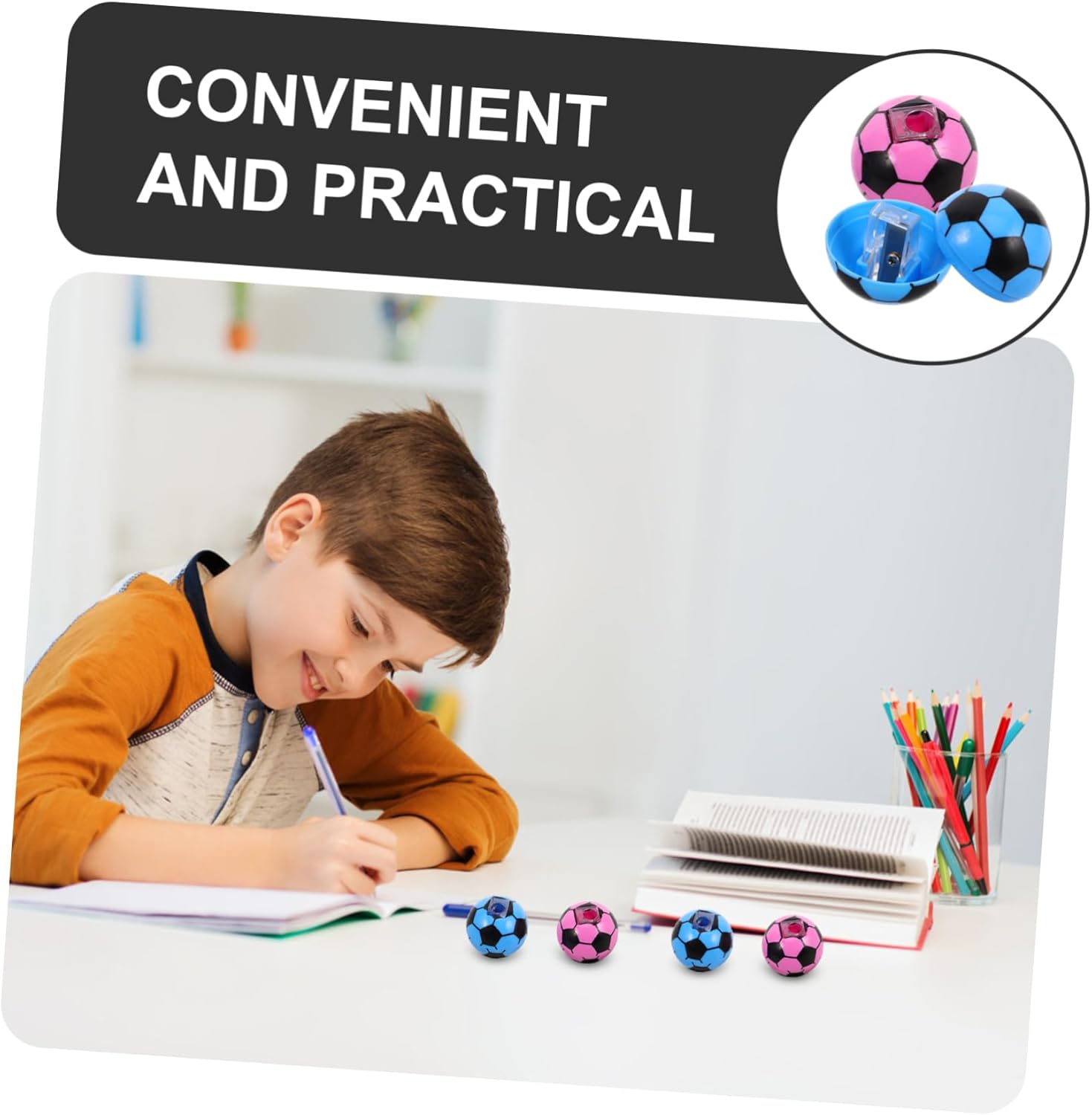 Forma innovativa a forma di pallone da calcio: il design a forma di pallone da calcio aggiunge un tocco creativo al tuo temperamatite, rendendolo uno strumento divertente per gli studenti. Affilatura senza sforzo: tempera le matite in modo rapido ed efficiente, assicurandoti di avere sempre una punta affilata per scrivere o disegnare. Versatilità del foro singolo: il design a foro singolo adatta a matite di varie dimensioni, offrendo una soluzione pratica per tutti gli utenti. Design portatile: leggero e facile da trasportare, questo temperamatite è per l'uso in movimento. Adatto a molteplici usi: ideale per aule, uffici e uso domestico, soddisfacendo le esigenze di diversi utenti
