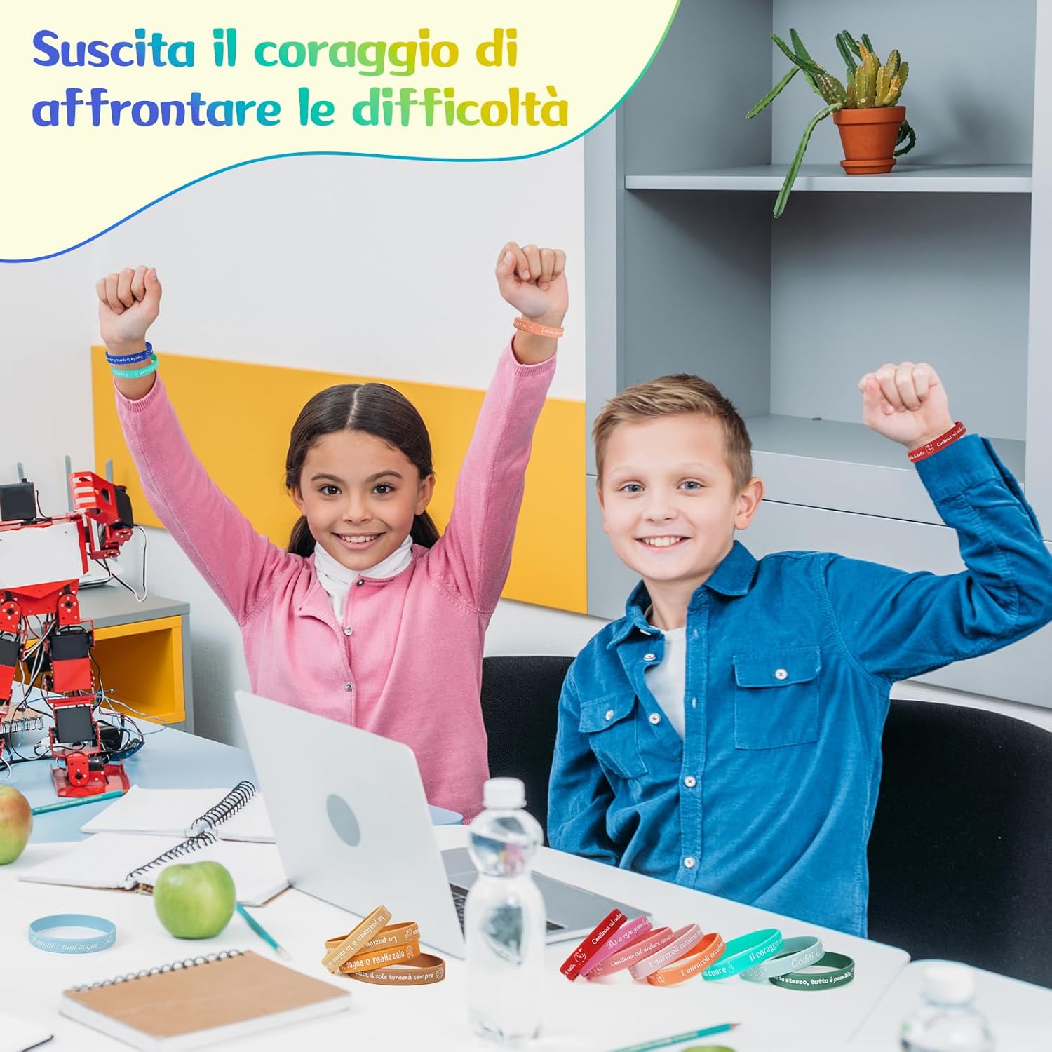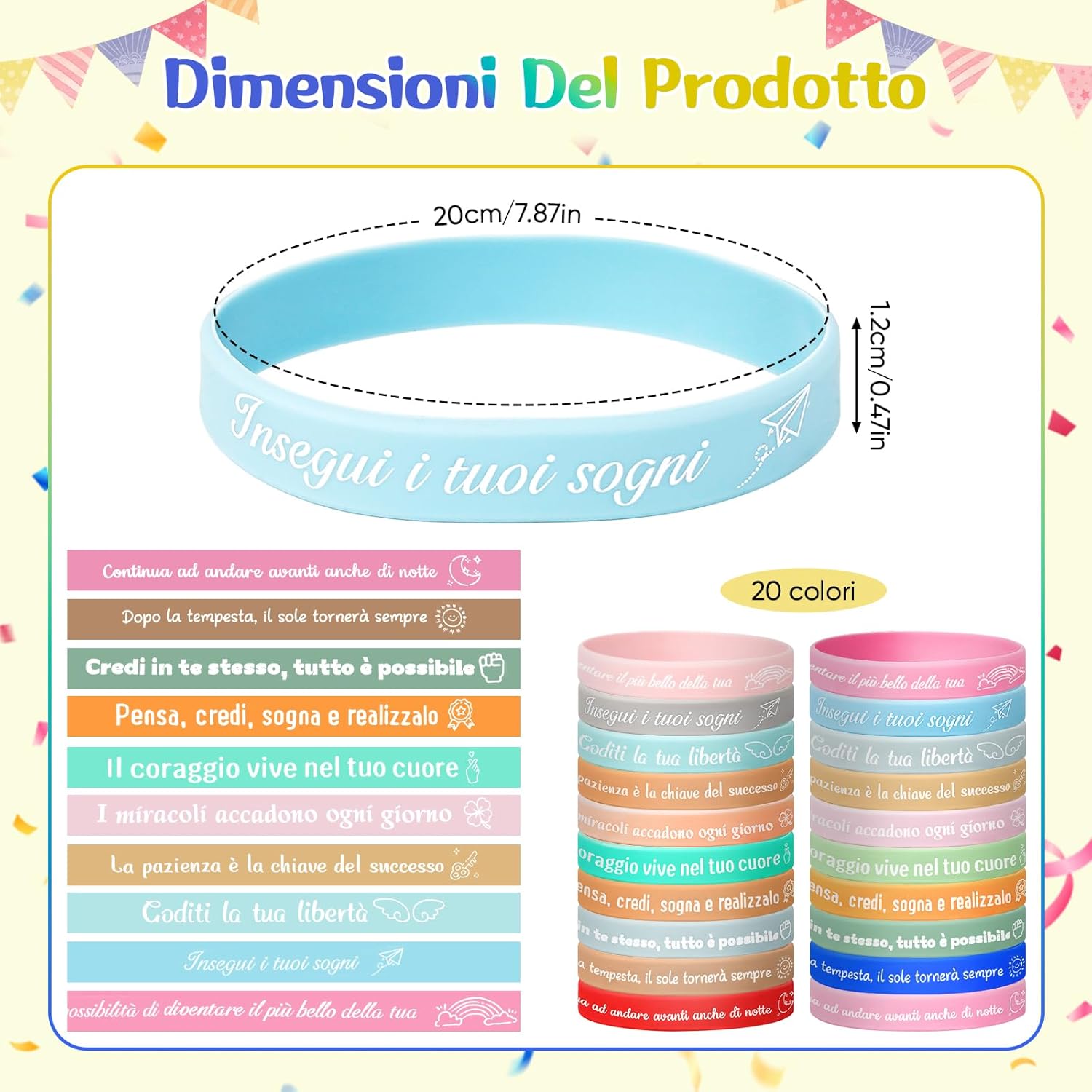 20pz Braccialetti Silicone con Frasi Motivazionali Italiano Questo gadget per feste è ideale per la fine festa compleanno,laurea e natale, è anche un regalo per i amici, i bambini e i studenti Specifiche: Materiale: silicone Colori: varietà di colori vivaci Dimensioni: 20,2 x 1,2 cm Il pacchetto include: 20 braccialetti motivazionali in lingua italiana (2 pezzi di ogni stile) Note: 1. Si prega di verificare attentamente le dimensioni del prodotto prima dell'acquisto. 2. A causa della misurazione manuale, potrebbero esserci errori nelle dimensioni del prodotto. 3. A causa delle differenze di contrasto cromatico tra i diversi monitor, i colori delle immagini potrebbero differire leggermente da quelli reali. Si prega di fare riferimento al prodotto reale.