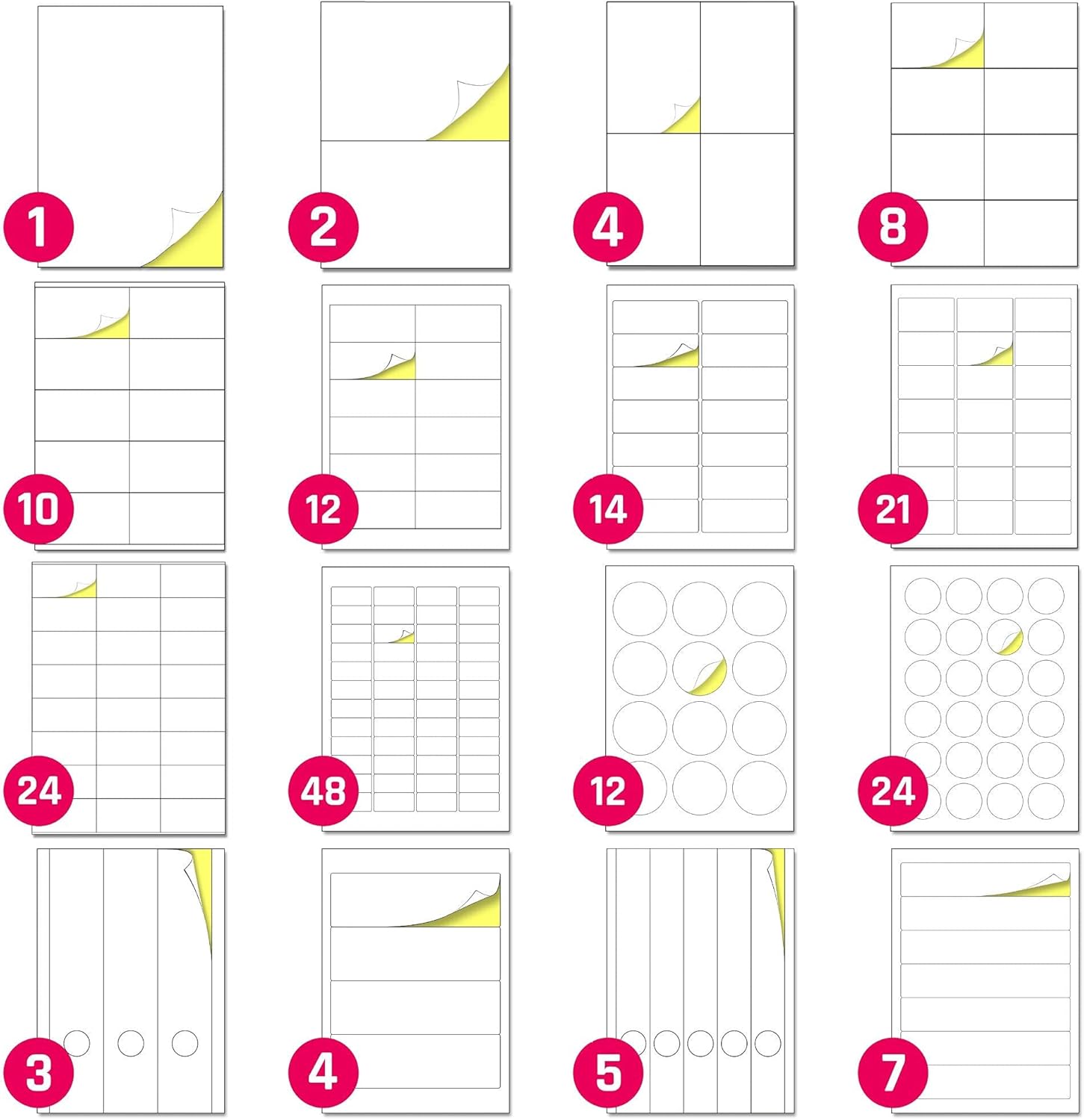 Superficie opaca bianca. Facile da scrivere con penne, matite e pennarelli. Perfetto per la stampa con stampanti a getto d'inchiostro e laser. Formato A4 (297 x 210 mm). 1 adesivo per foglio Modelli di stampa PDF e Microsoft Word forniti. 25 fogli. 25 etichette.
