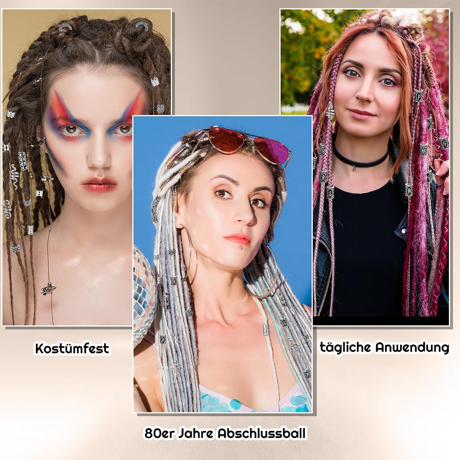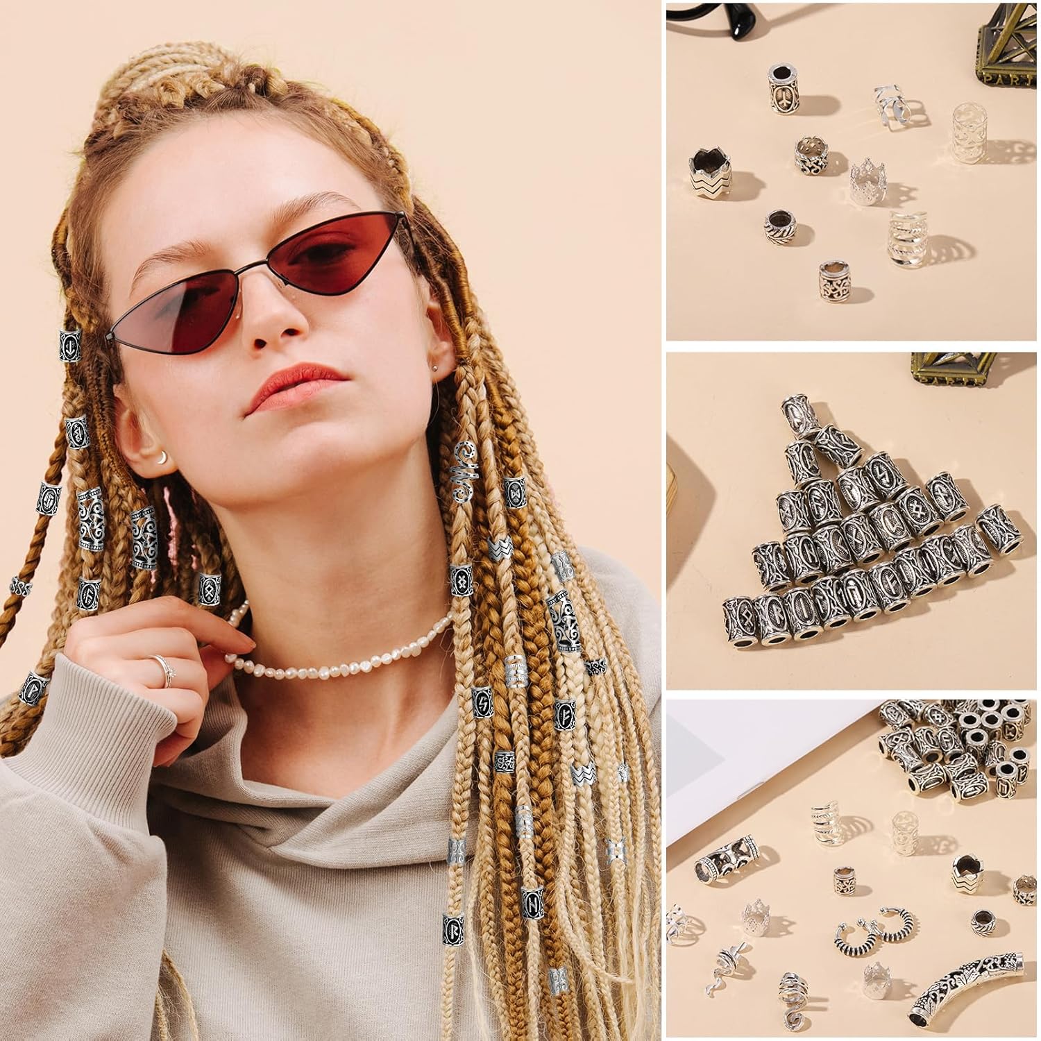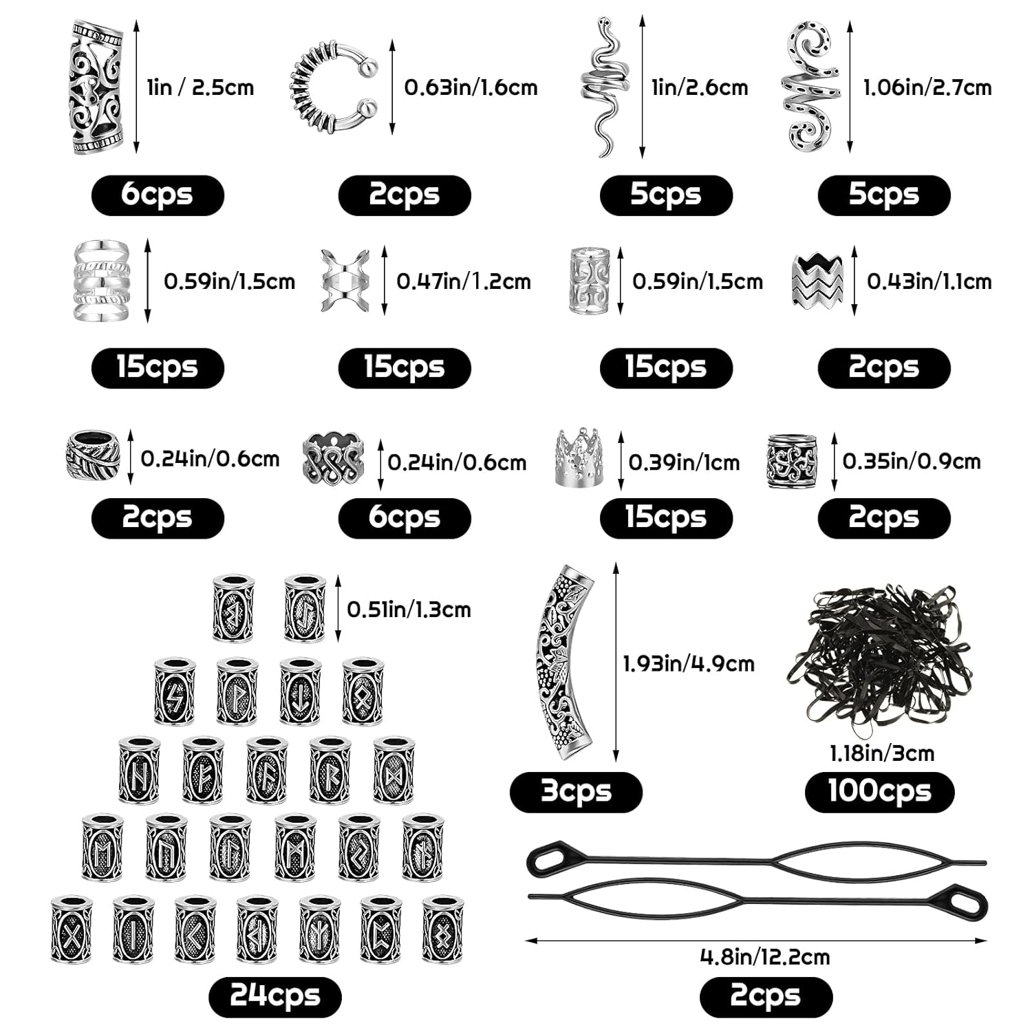 【Incluso】Riceverai 107 pezzi di accessori per capelli in argento, 100 elastici, 2 infila capelli, confezionati in una scatola trasparente per riporli in modo comodo e veloce. Progettato per un design brillante, classico e bello, questo accessorio per capelli color oro si abbina bene con extension e trecce per capelli, donandoti il look chic perfetto. 【Materiale】 Questo accessorio per capelli color argento è più resistente dei normali pezzi in alluminio. I gioielli intrecciati sono realizzati con materiali in lega di alta qualità e tecnologia galvanica. Dopo la galvanizzazione ha una buona duttilità e durezza, non arrugginisce, non sbiadisce, è morbido ed elastico e non danneggia i capelli. Le perle per capelli nordici presentano una superficie in metallo bronzato su ciascun lato e un simbolo nordico al centro per un 【Facile da usare】 Gli accessori per capelli color argento possono essere attaccati a trecce di diversi spessori e stili. Basta intrecciare i capelli nello stile desiderato, quindi aprire gli accessori per capelli argento, posizionarli nella posizione desiderata sulla treccia o sulla barba e premerli completamente e saldamente.,Design regolabile: gli accessori per capelli argento hanno una buona flessibilità ed estensibilità ed sono regolabili. Puoi controllare la tenuta secondo necessità per soddisfare le tue diverse esigenze di accessori per capelli.,Ampia applicazione: puoi utilizzare perline per capelli Viking per trecce, barbe, code di cavallo, trecce e altri stili, alla moda e alla moda. Può essere utilizzato per l'uso quotidiano e in varie occasioni come feste, sfilate di moda, concerti, balli, ecc. È adatto anche come regalo per amanti, famiglia, amici e colleghi