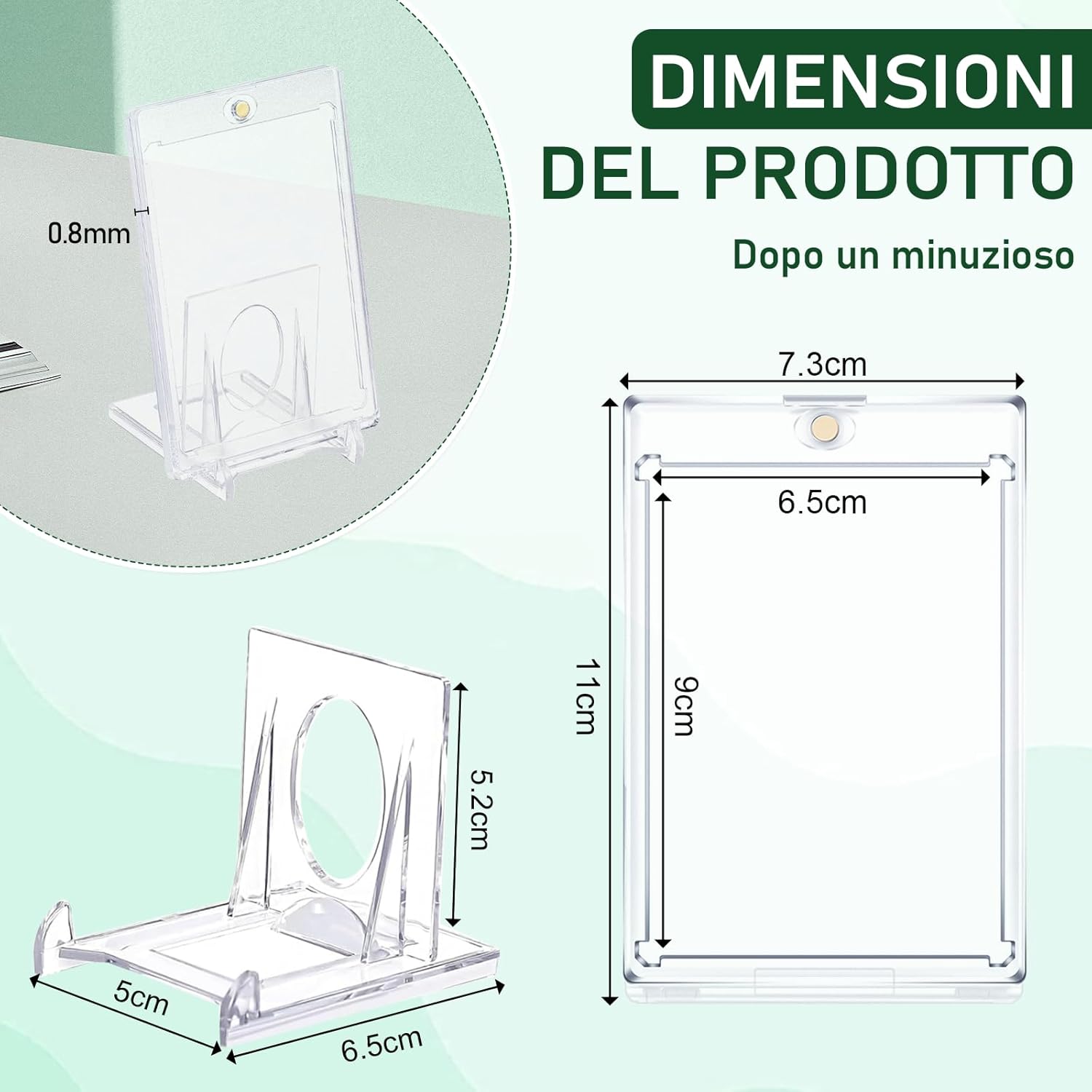 💖【Contenuto del Set】contiene 10 pezzi 11 x 7,3 x 0,75 cm 35pt magnetic card holder, 10 piedini di supporto, 1 sacchetto di stoccaggio, 1 paio di guanti e la fessura per le carte è dimensionata per ospitare carte standard.Questo cornici acriliche magnetiche carte soddisfa le esigenze di un unico contenitore di carte per creare facilmente aree espositive esclusive per la collezione. 💖【Apertura e Chiusura Magnetica】35pt magnetic trading card holder è progettato con una chiusura magnetica rotonda sulla parte superiore per una facile apertura e chiusura.Forte scheda fissa magnetica robusta, buona tenuta magnetic card holder, impedisce la caduta della scheda, è facile da trasportare, può sempre proteggere la scheda in sicurezza, l'esperienza di utilizzo è facile e tranquilla. 💖【Materiale Trasparente】Cornici magnetiche carte è realizzato in acrilico trasparente su entrambi i lati, trasmettendo chiaramente la luce. Non c'è bisogno di estrarre la carta, è possibile vedere i dettagli in tutte le direzioni, con i biglietti di codice possono anche essere scansionati direttamente, in modo che la preziosa carta come un'opera d'arte perfettamente presentata, effetto di visualizzazione eccezionale. 💖【Resistente All'umidità e Alla Sporcizia】Magnetic card holder Resiste efficacemente all'umidità, alla sporcizia, alle impronte digitali, ai graffi e ad altri danni, per una protezione a tutto tondo, per mantenere la carta in uno stato nuovo di zecca per lungo tempo e per salvaguardare il valore della collezione. 💖【Ampiamente Utilizzato】Portacarte magnetico per carte da collezione è adatto a tutti i tipi di carte come TCG, MTG, ecc. e può essere utilizzato anche per conservare foto e autografi. Card holder 35pt Design trasparente su entrambi i lati, sia per la conservazione che per la visualizzazione, sia per la collezione personale che per i regali, è una scelta di alta qualità con praticità ed estetica.