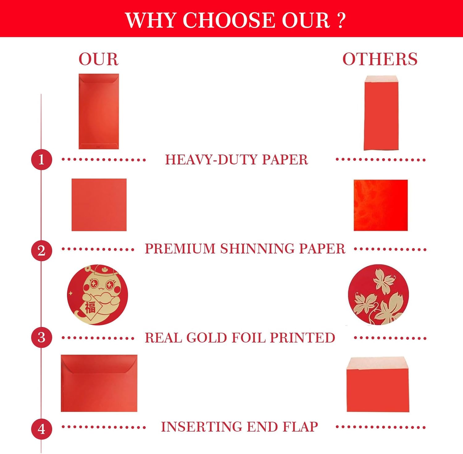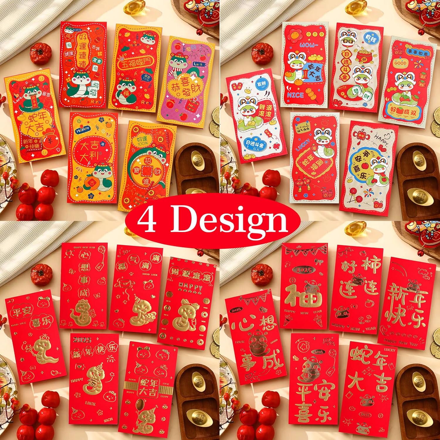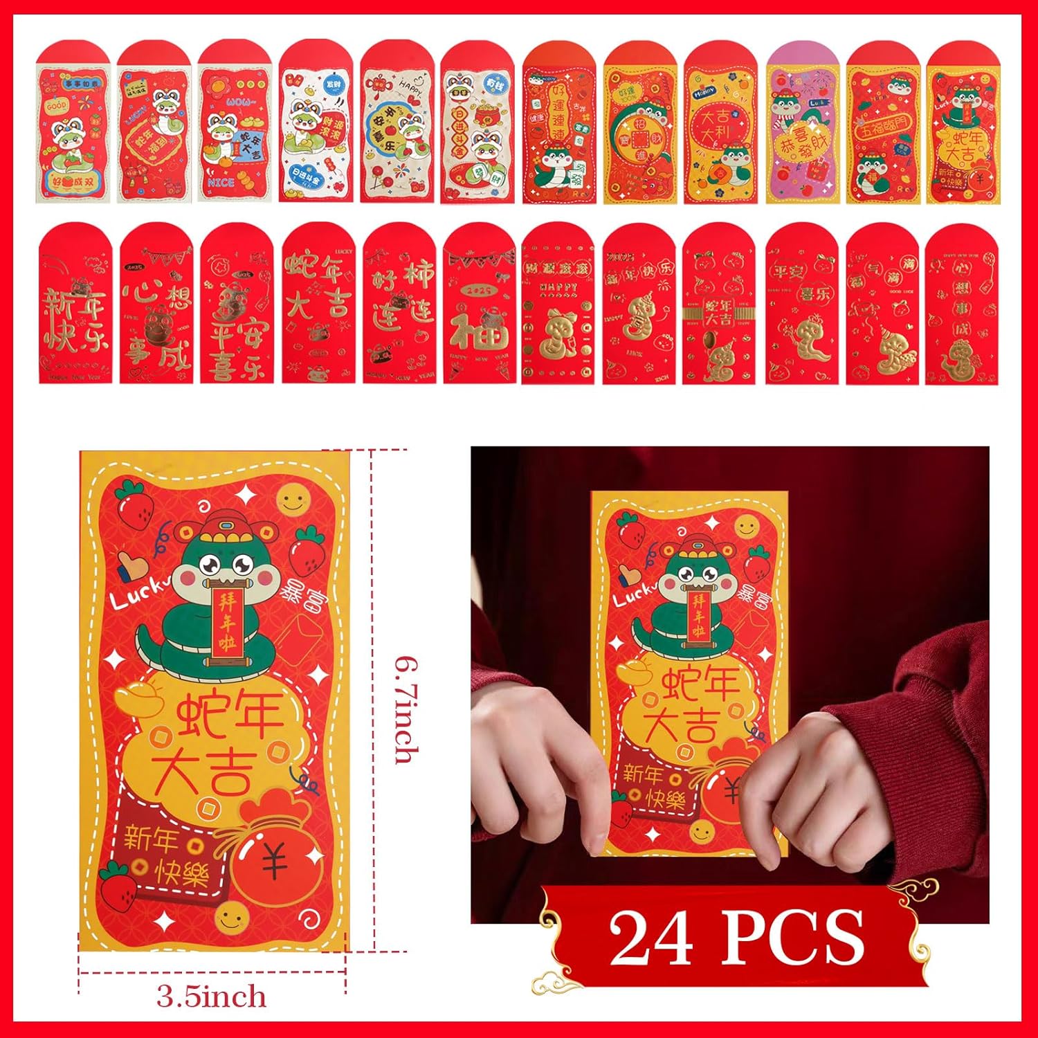 Contenuto della confezione: ci sono 24 buste rosse cinesi in 4 disegni e ogni design ha 6 pezzi, sufficienti per soddisfare le vostre varie esigenze per diverse occasioni. Ogni busta misura 3,5 x 6,7 pollici che si adatta $100 banconote piatte. Design unico: design classico con diversi motivi stampati in lamina d'oro. Ogni modello presenta sentimenti cinesi che desiderano buona fortuna e buona benedizione. Il retro è vuoto per includere i tuoi messaggi personali e personalizzati. Grande capacità: le buste rosse da matrimonio sono di 17 x 9 cm, quindi la capacità è abbastanza grande da contenere molte banconote o altri regali per esprimere i tuoi sinceri desideri. Realizzato in materiale di alta qualità: realizzato in carta scintillante rossa resistente di alta qualità e sigilla inserendo il lembo terminale nello slot. Adatto per diverse occasioni: ideale per Capodanno cinese, Capodanno lunare, compleanno, matrimoni, compleanni, baby shower e altri vari eventi speciali.