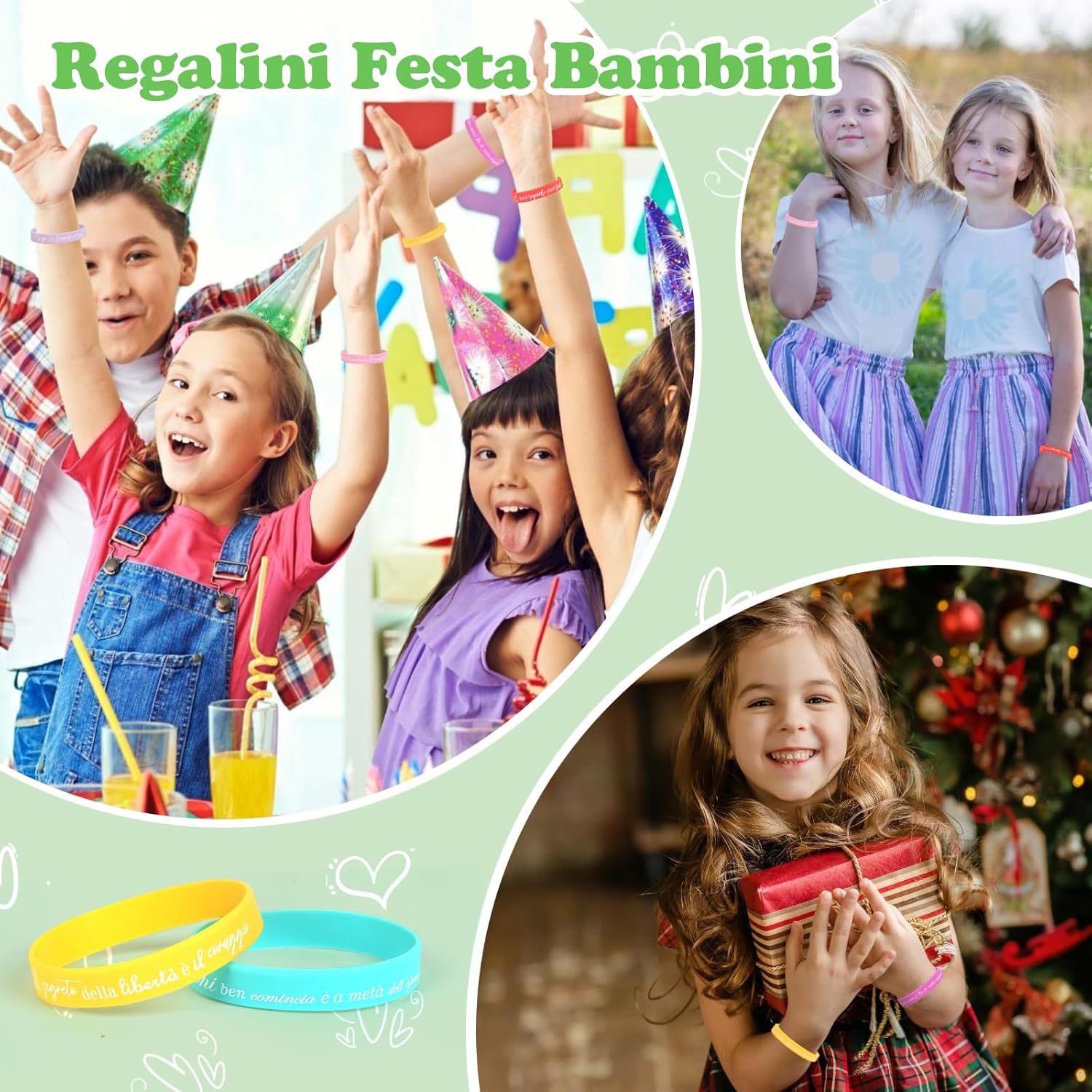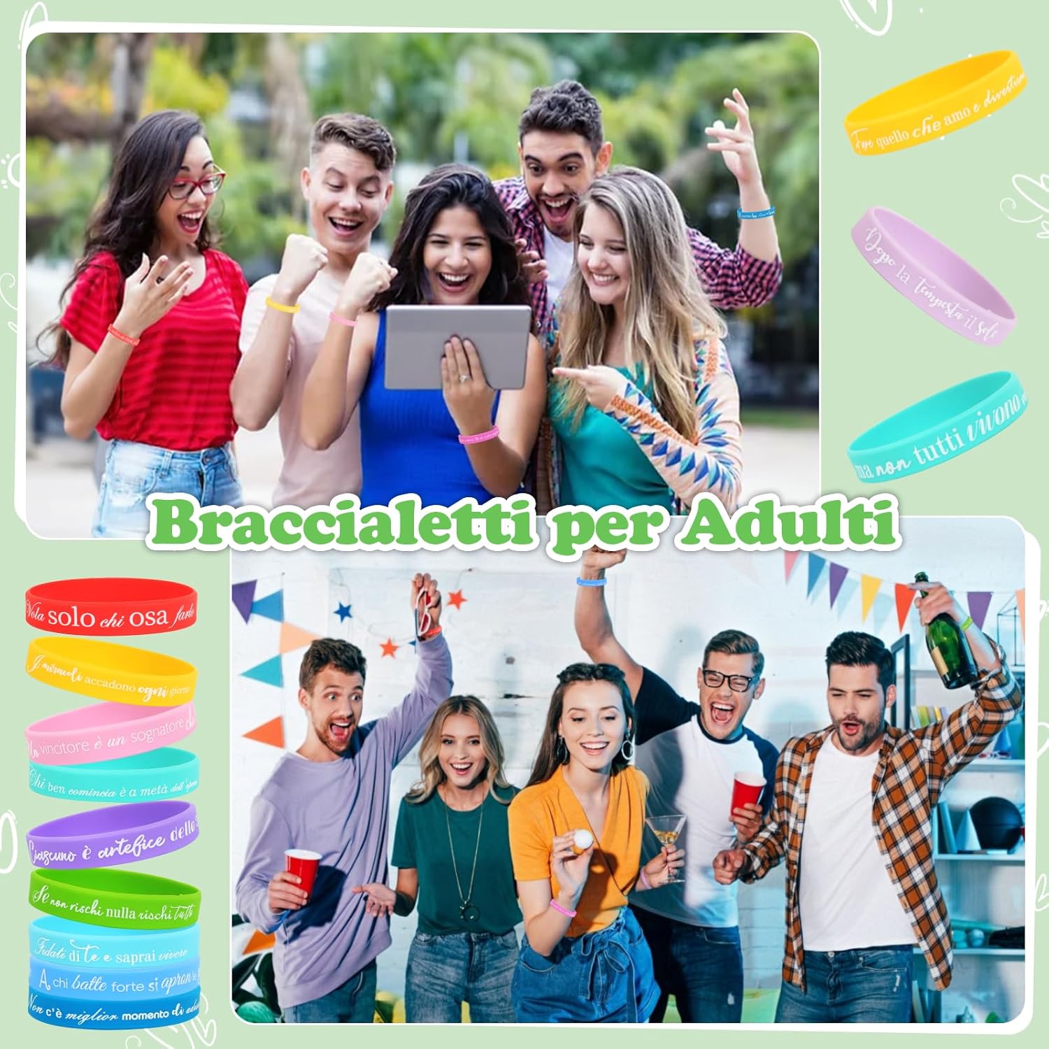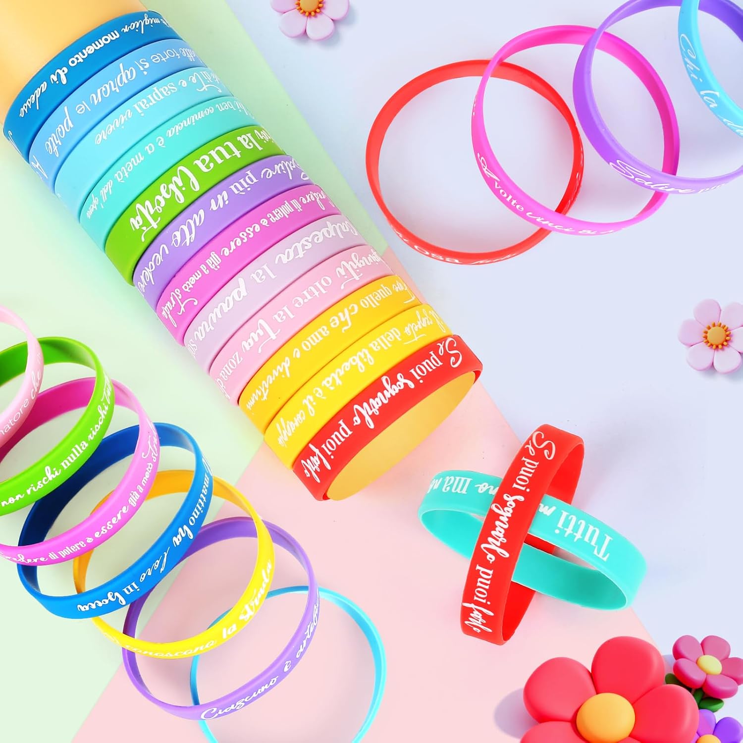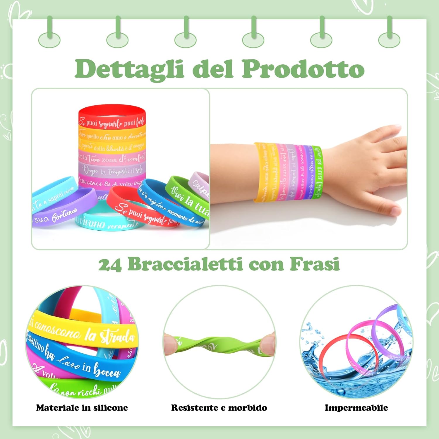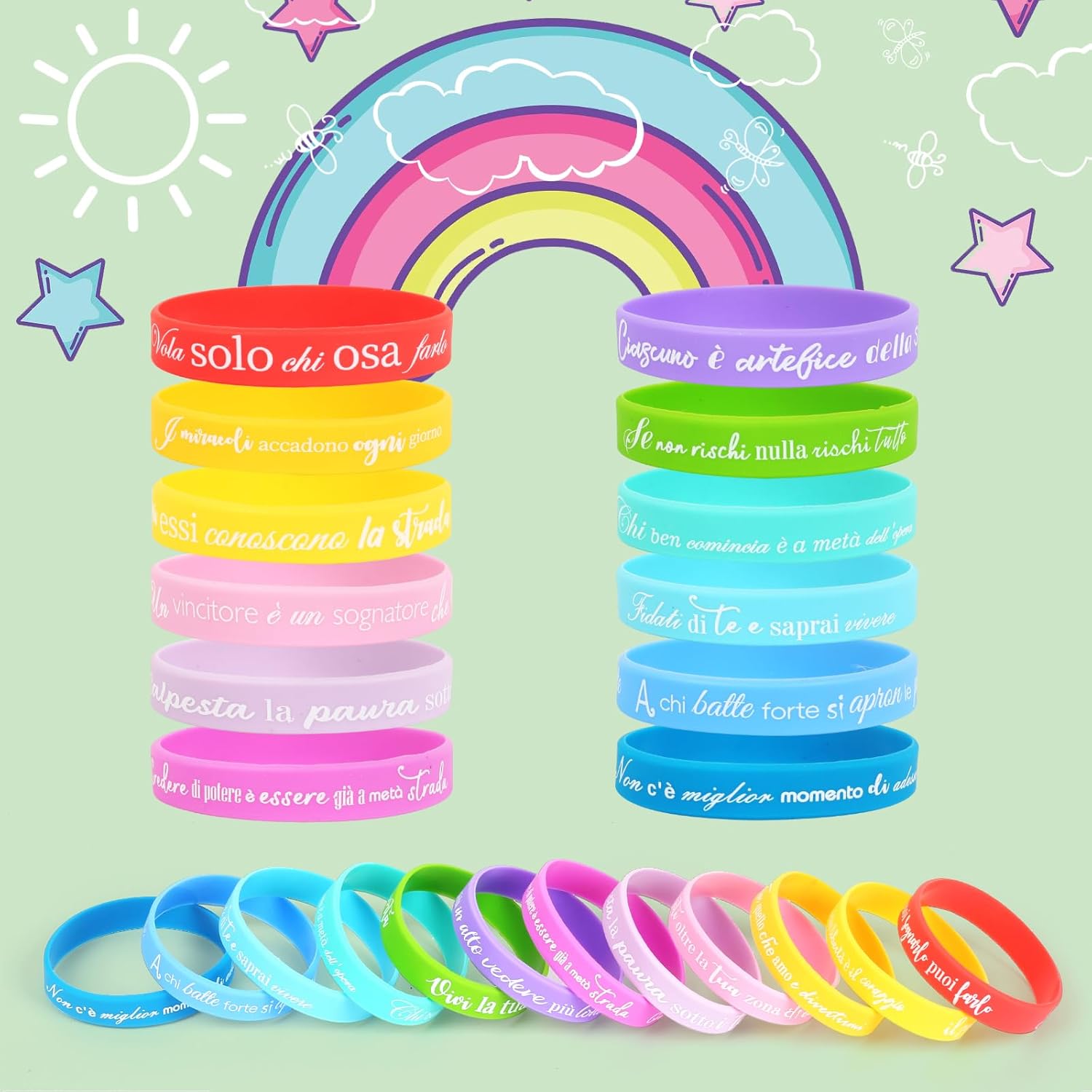 【24 Braccialetti diversi】:24 pezzi bracciale con frasi motivazioni in italiano. Il braccialetto sfoggia un arcobaleno di colori: rosso, viola, rosa, giallo, verde e blu. Adatto per bambini, bambina, adolescente e adulti. 【Regalo significativo】:Ideale come gadget compleanno bambini, regalini fine festa compleanno, regalini fine anno scolastico, regalo per i amici, gadget natale, ideali anche per eventi sportivi, feste a tema e lauree, creare un'atmosfera festiva. 【Braccialetti amicizia】:Frasi motivazionali e disegni vivaci sono perfetti da condividere con amici, compagni di classe e compagni di squadra, per rafforzare i legami e mantenere rapporti amichevoli. 【Dimensione e materiale】:Circonferenza: 18 cm, larghezza: 1,2 cm, adatto sia per i polsi dei bambini che per quelli degli adulti. Braccialetti in silicone, impermeabile, durevole e morbidi. 【Frasi motivazioni】:ogni braccialetto contiene testo in lingua italiana, regalo di incoraggiamento per studenti, colleghi, appassionati di sport o membri della squadra. Trasmettere una visione positiva della vita, ispirando se stessi e gli altri a vivere in modo più bello.