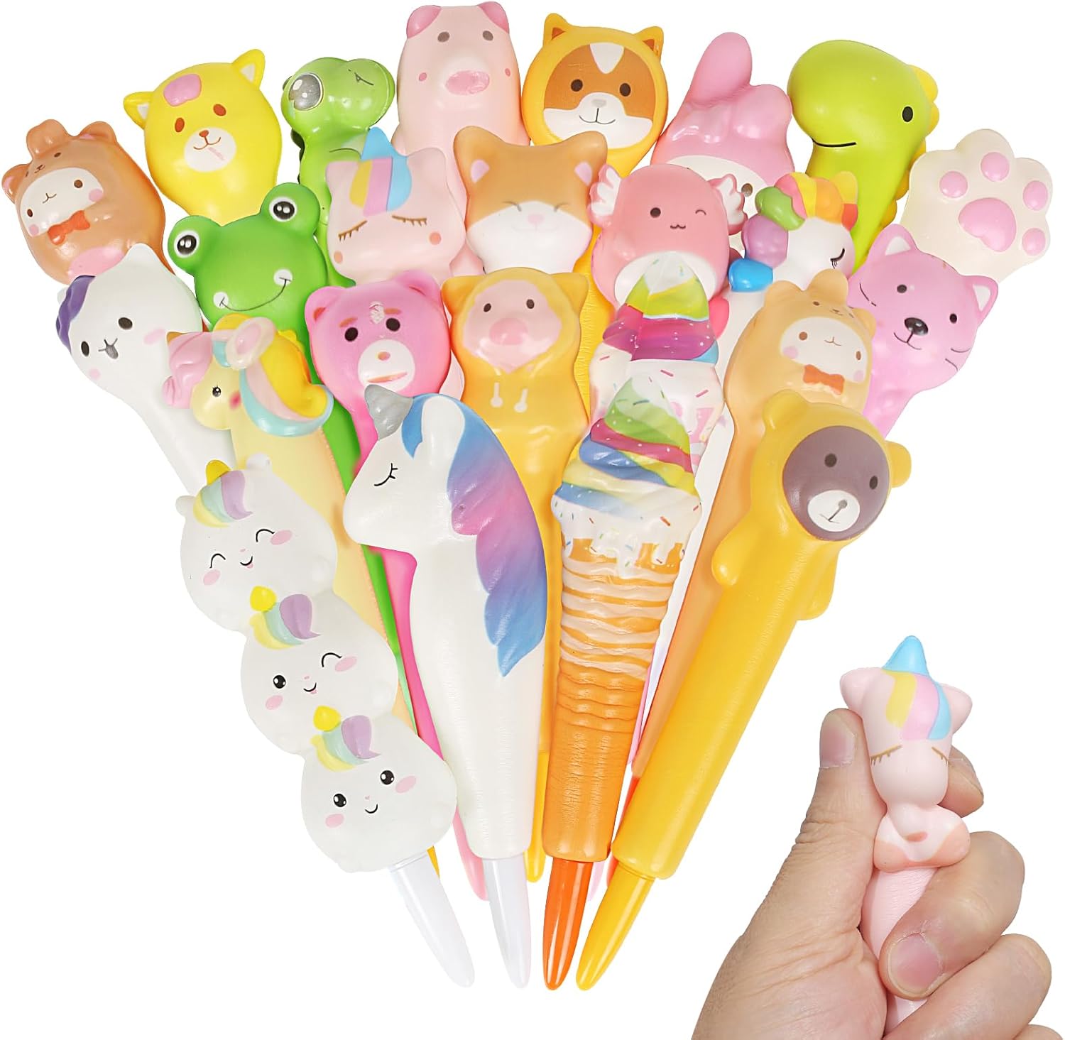 【Gadget compleanno bambini】: 24 pezzi penne squeezies per gadget compleanno bambini. Vari motivi: dinosauri, gattini, orsi, rane, maialini, conigli e altro ancora. 【Penne Gel Squeezies】: La penna è realizzata in spugna e si deforma quando la si stringe, consentendo di scaricare lo stress e di rilassarsi in un'atmosfera di studio stressante. 【Regalini fine festa compleanno】: Costituiscono un buon incentivo ad amare la scuola, ma, soprattutto, per divertirsi scrivendo. Un'idea fantastica per regalarli come gadget alle feste, come piccoli doni ai bimbi a scuola. 【Materiale di sicurezza】: Penne animali bambini realizzato con inchiostro di alta qualità, plastica inodore, senza piombo, non tossico, innocuo per il corpo umano. Design carino con una scrittura fluente. 【Dimensione】: Punta: 0,5mm. Penne lunga circa 17 cm, si prega di misurare la dimensione richiesta prima di acquistare.