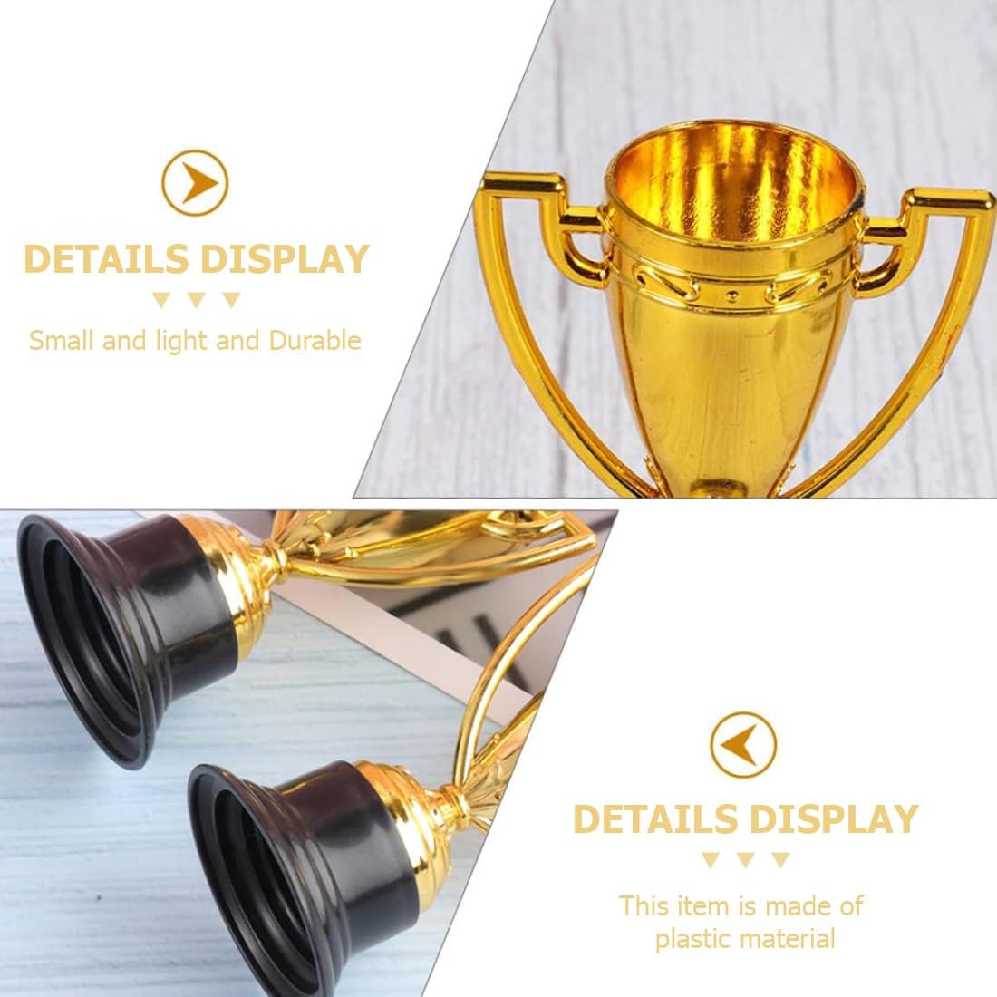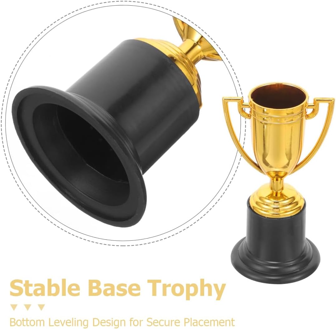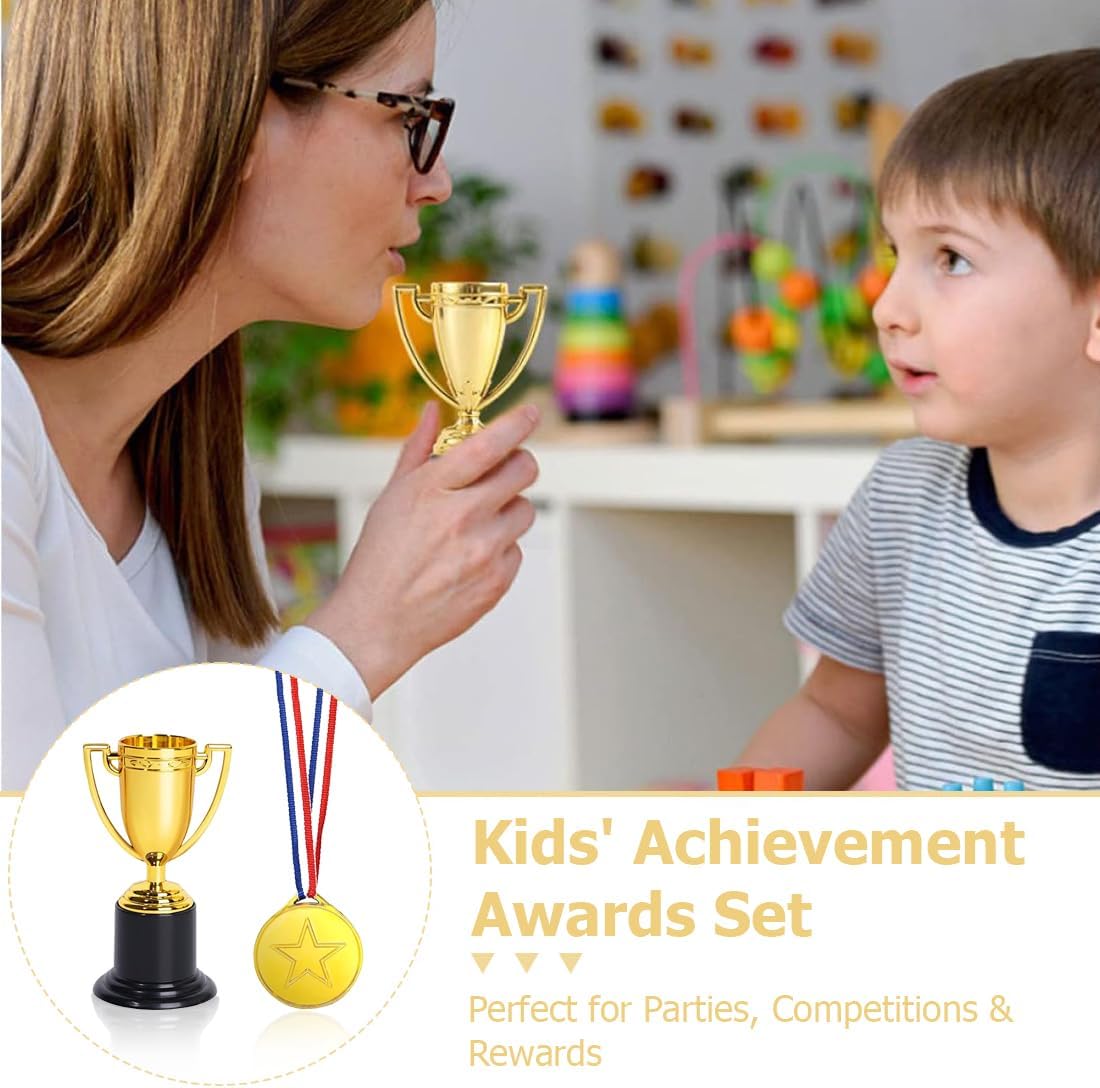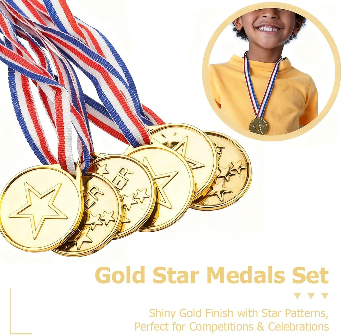 Set assortito: composto da sei trofei dorati e sei medaglie a forma di stella, le medaglie presentano un design semplice a forma di stella o la scritta “WINNER”, abbinate a nastri rossi, bianchi e blu. Adatto a varie competizioni per bambini, riconoscimenti durante feste o premi quotidiani, questo set soddisfa molteplici esigenze di premiazione. Lavorazione artigianale raffinata: i trofei presentano una finitura dorata lucida su una solida base nera con fondo piatto e antiscivolo. Le medaglie sono realizzate con tecniche di placcatura in oro metallico e presentano motivi a stella tridimensionali ben definiti. I nastri resistenti e antiabrasione completano il look autentico, immergendo i bambini in un'atmosfera cerimoniale. Dimensioni compatte: il trofeo è alto 9,5 cm, piccolo e facile da impugnare. La medaglia misura circa 4,3 cm di diametro con un nastro di 75 cm, perfettamente dimensionato per i bambini. Comodo da indossare o da esporre, funge sia da simbolo d'onore che da affascinante oggetto decorativo, favorendo il senso di realizzazione. Materiali di alta qualità: realizzati in plastica robusta che resiste alla deformazione e allo sbiadimento, sopportando l'uso quotidiano da parte dei bambini. La base presenta un design antiscivolo per un posizionamento stabile, mentre il nastro della medaglia è cucito saldamente per mantenere condizioni perfette nel tempo. Applicazioni versatili: perfetto per competizioni scolastiche, giornate sportive, giochi in famiglia, feste di compleanno o come ricompensa quotidiana per il comportamento. Questo set di premi motiva efficacemente i bambini a eccellere, commemorando ogni traguardo del loro sviluppo.