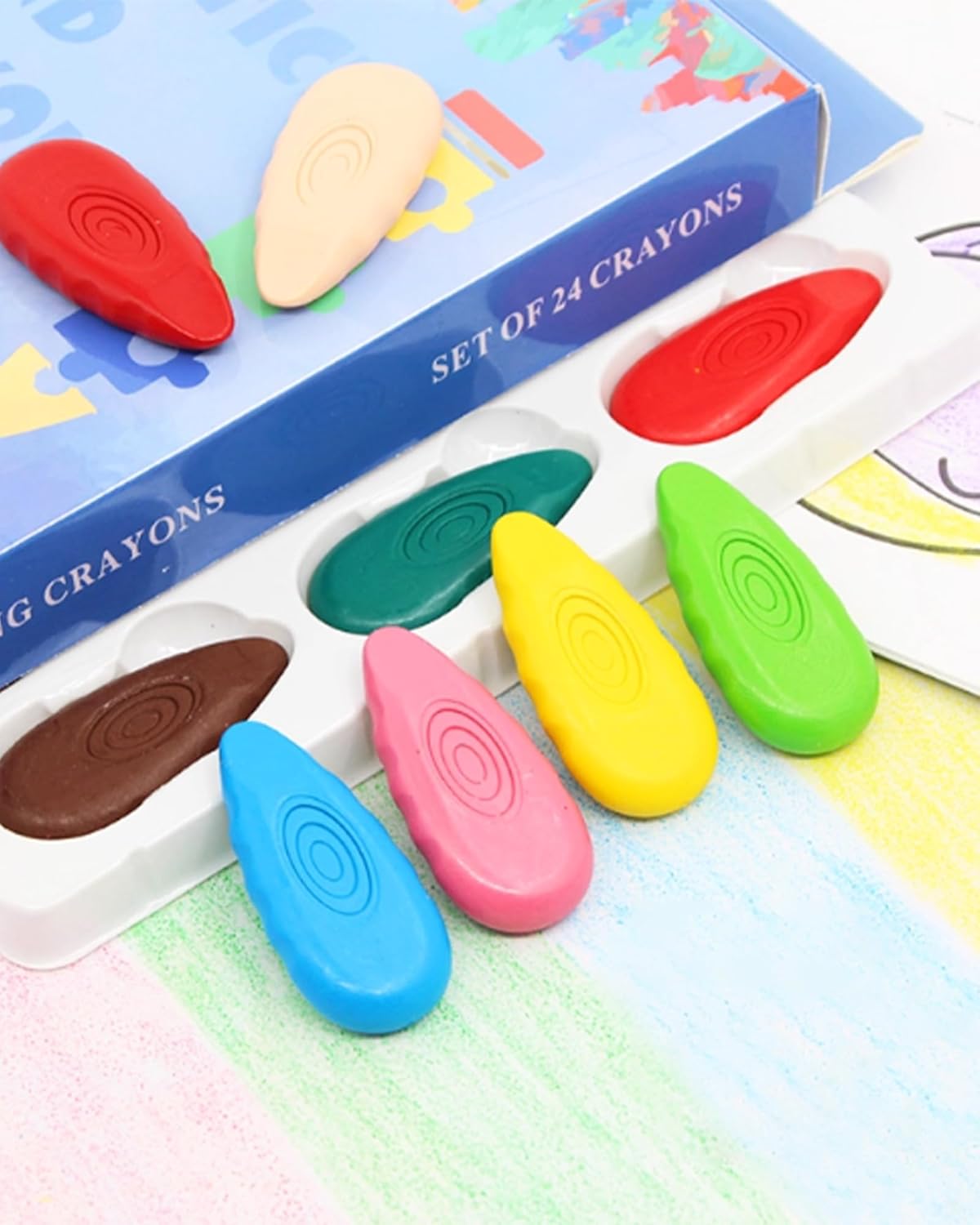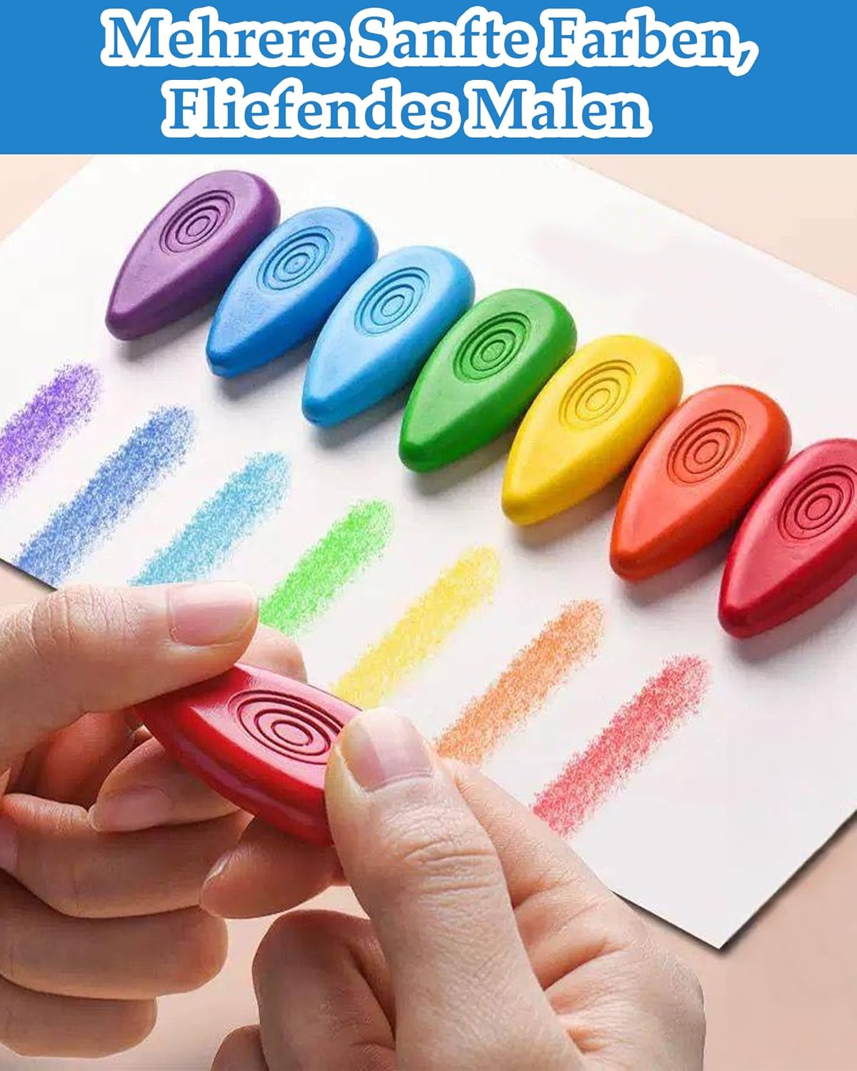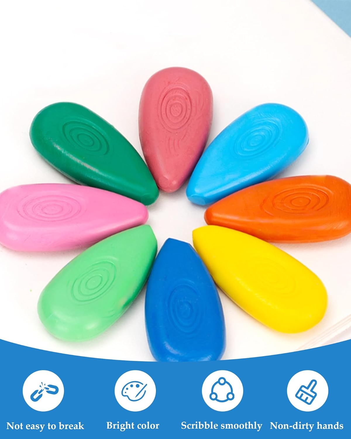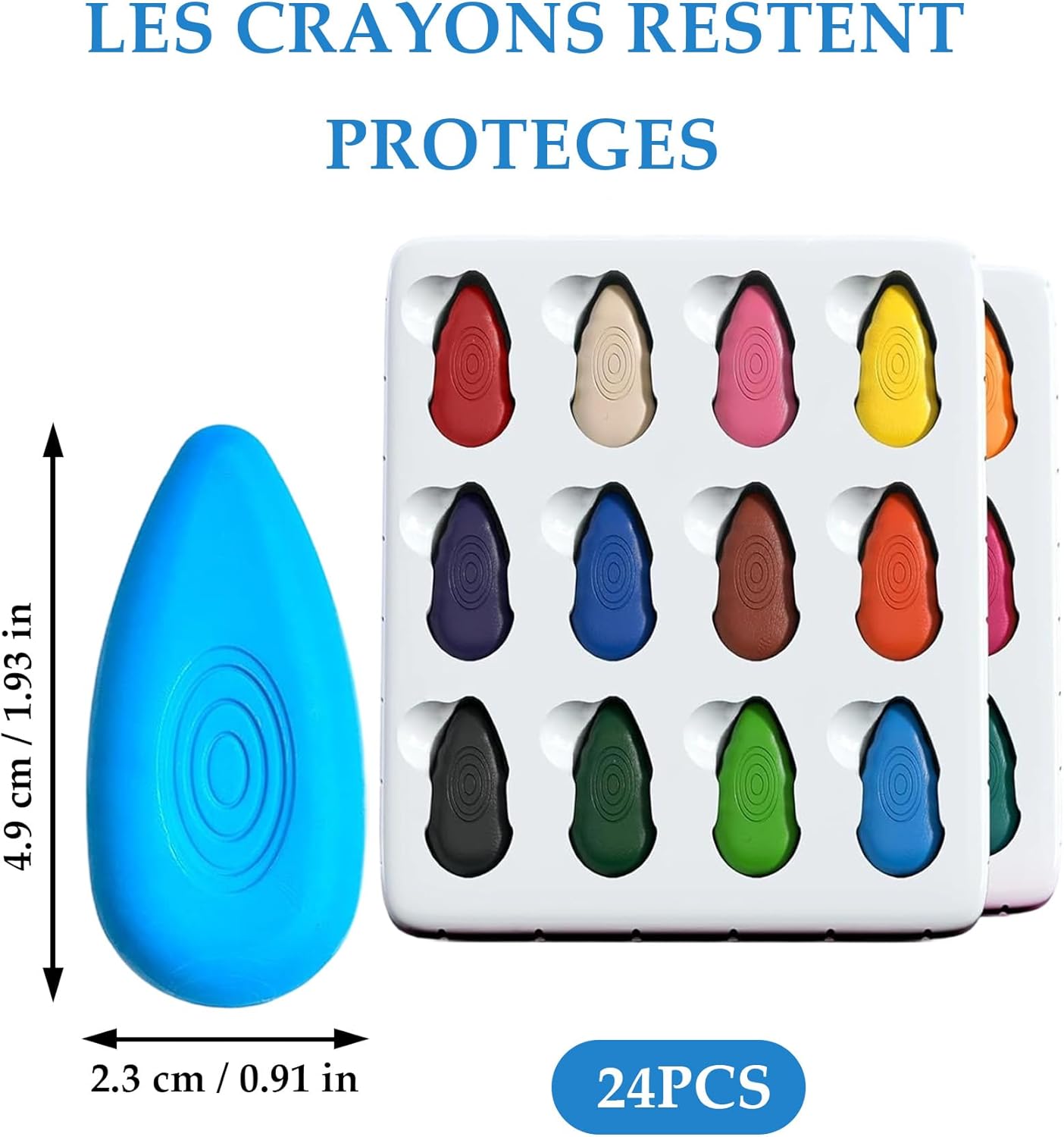 Pastelli a cera atossici per bambini: i nostri pastelli a cera sono realizzati con cera naturale e sono privi di amianto, piombo e ftalati, il che li rende delicati sulla pelle dei bambini. Questi pastelli sono adatti ai bambini e sicuri, permettendo loro di divertirsi a disegnare senza preoccupazioni. I bambini di età inferiore ai 3 anni devono sempre essere sorvegliati. Facili da impugnare: il design a forma di lacrima rende questi colori per bambini 1 anno facili da impugnare, anche per i bambini che non sono ancora abituati a tenere una matita. Misurando 5 x 2,5 cm, sono perfetti per le manine dei più piccoli. Il design triangolare impedisce inoltre alle matite di rotolare e rompersi. Resistente: i nostri colori a cera sono realizzati con uno speciale processo di sintesi per una maggiore durata. Il design a forma di lacrima aumenta l'area di contatto in caso di caduta, riducendo il rischio di rottura. 24 colori: questo set di 24 pastelli colorati offre un'esperienza di disegno unica in ogni colore! I colori per bambini promuovono la percezione del colore, la coordinazione occhio-mano e le capacità artistiche, ispirando al contempo l'immaginazione e la creatività. Lavabile: il nostro colori bambini 2 anni si lava facilmente da pelle, vestiti e pareti con acqua tiepida e sapone delicato, senza lasciare macchie ostinate.