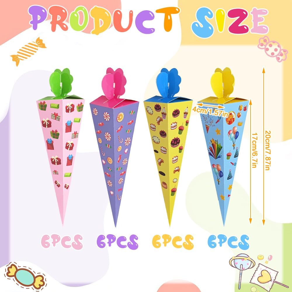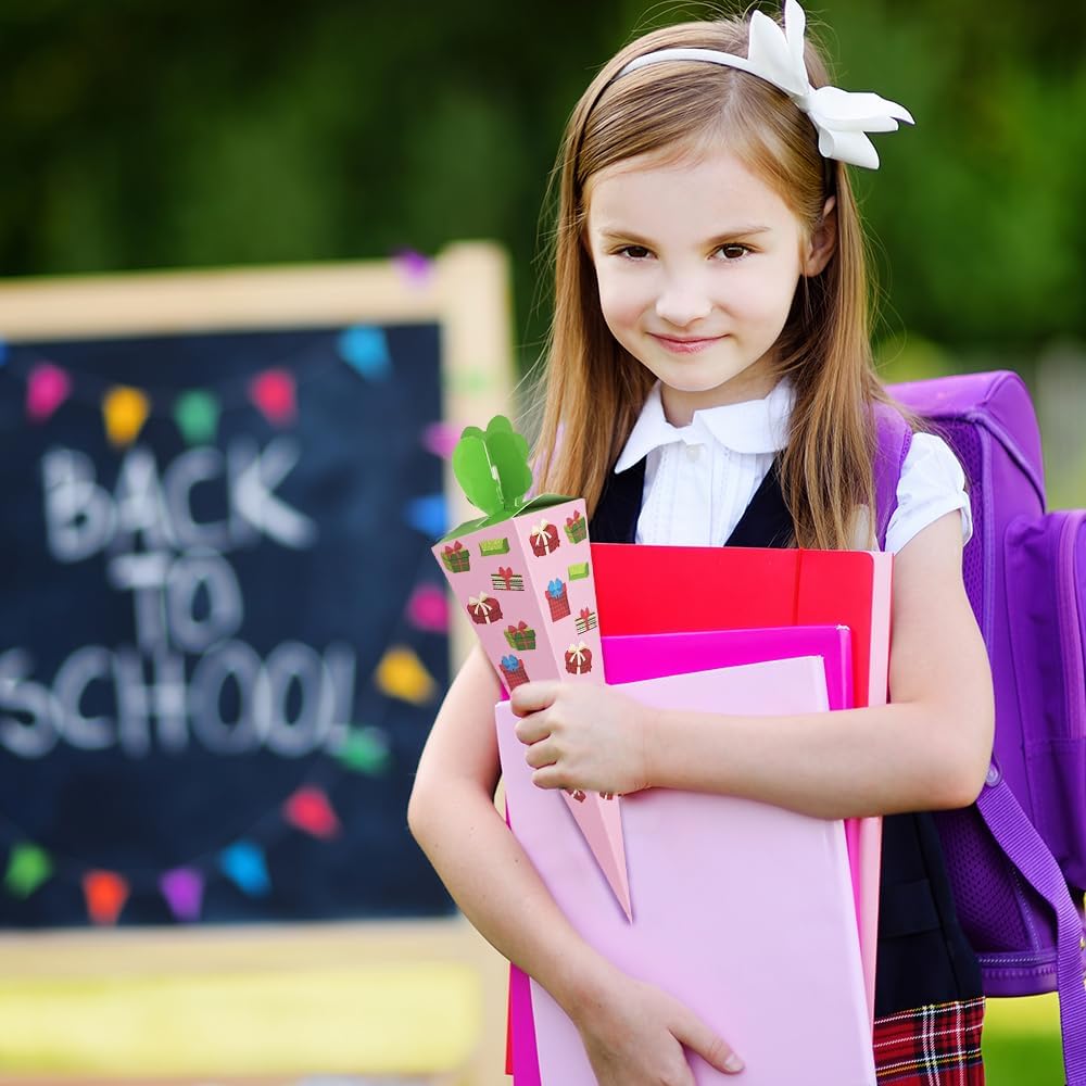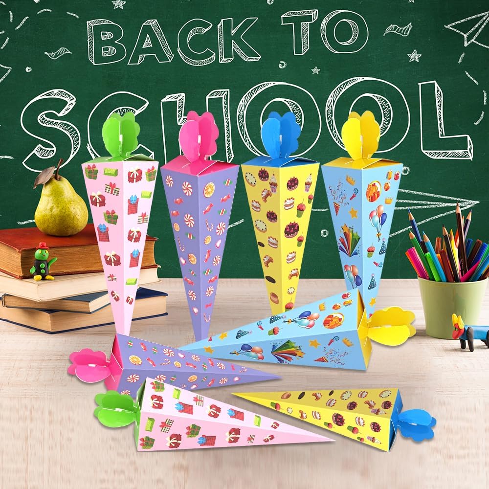 【Piccolo cono scolastico per l'iscrizione a scuola】Riceverai 24 piccoli coni scolastici per fratelli. La composizione cromatica colorata soddisfa ogni desiderio ed è ideale sia per bambine che per bambini. Quantità sufficiente per soddisfare le tue esigenze quotidiane di utilizzo e condivisione 【Facile da montare】Il piccolo cono scolastico è fornito in una confezione piatta, è facile da montare, sicuro e atossico e può essere facilmente piegato per i bambini. Basta piegare la scatola lungo le linee pre-piegate, riempirla con piccoli dolci e snack, così tu e i tuoi bambini potrete creare insieme dei bellissimi coni per la scuola. 【Carta ecologica di alta qualità】Il piccolo cono scolastico in cartone artigianale misura circa 20 cm ed è realizzato in cartone robusto, il che lo rende resistente e durevole. La superficie è liscia, sicura ed ecologica, non si screpola né sbiadisce facilmente. I giunti pieghevoli rendono la punta del cono più forte e stabile 【Dimensioni perfette】Grazie alle dimensioni compatte, i nostri piccoli coni scolastici stanno in qualsiasi borsa e sono ideali per l'asilo o la scuola elementare. Sono perfetti per piccoli regali che addolciscono l'inizio della scuola e sono ideali come zaino scolastico per ragazzi e ragazze. 【Ampiamente utilizzato】Il piccolo cono scolastico è adatto per le forniture per le feste per il primo giorno di scuola per ragazzi e ragazze, regali scolastici, accessori per confezioni regalo e può essere utilizzato come piccoli regali scolastici, piccoli souvenir per gli amici di scuola o come confezione regalo per l'asilo e regali di addio alla luce del giorno