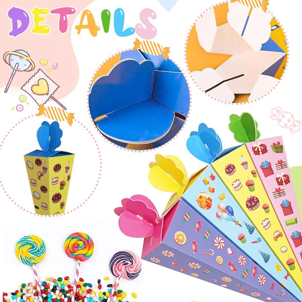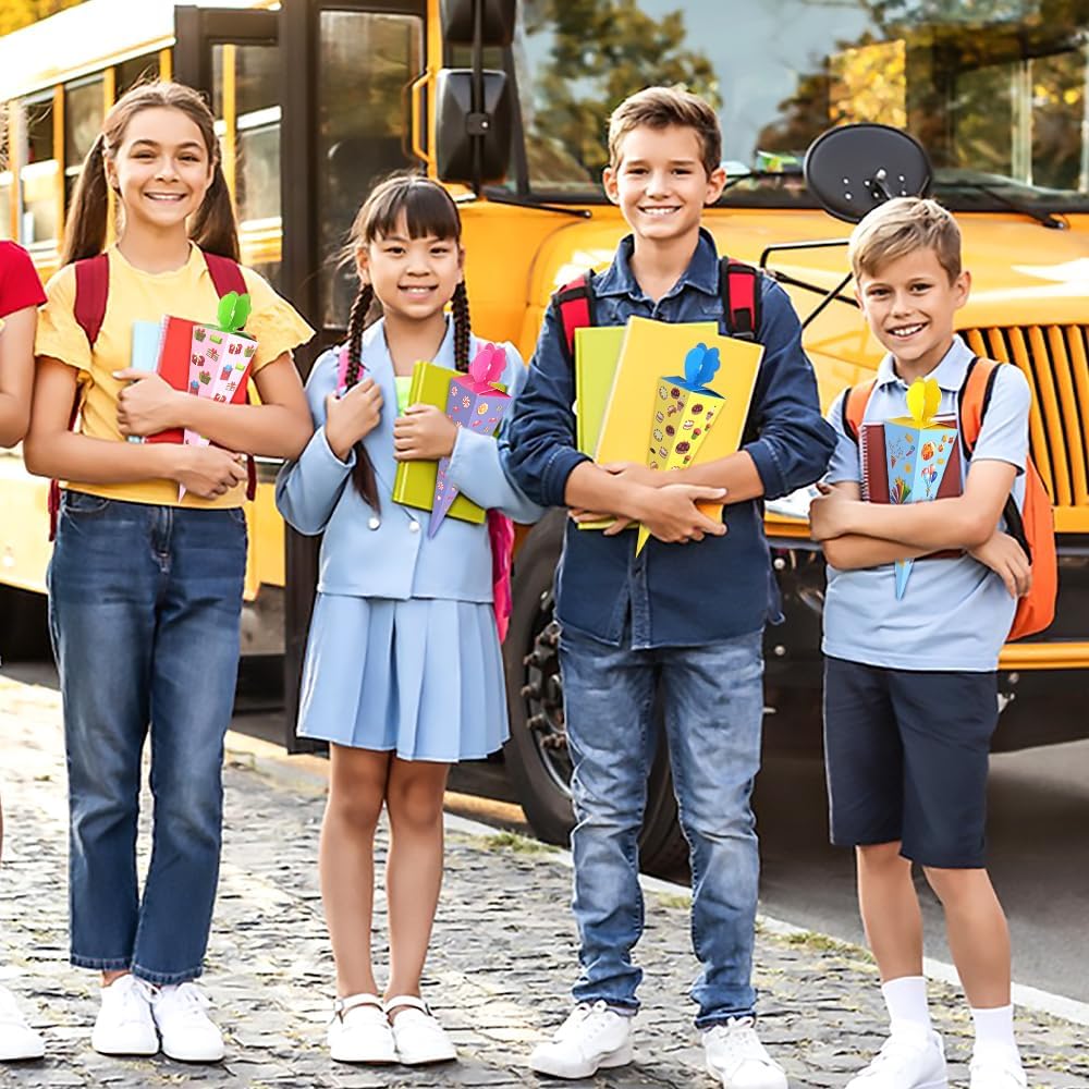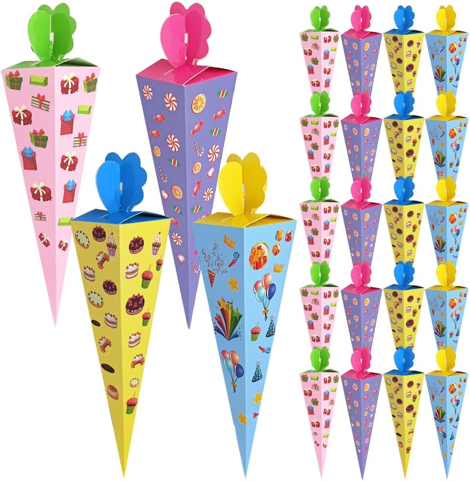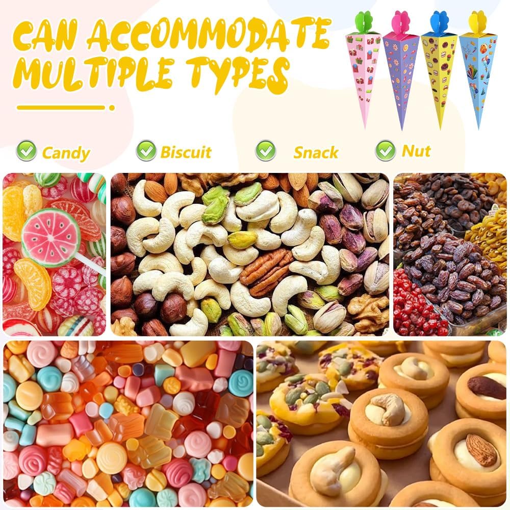 【Piccolo cono scolastico per l'iscrizione a scuola】Riceverai 24 piccoli coni scolastici per fratelli. La composizione cromatica colorata soddisfa ogni desiderio ed è ideale sia per bambine che per bambini. Quantità sufficiente per soddisfare le tue esigenze quotidiane di utilizzo e condivisione 【Facile da montare】Il piccolo cono scolastico è fornito in una confezione piatta, è facile da montare, sicuro e atossico e può essere facilmente piegato per i bambini. Basta piegare la scatola lungo le linee pre-piegate, riempirla con piccoli dolci e snack, così tu e i tuoi bambini potrete creare insieme dei bellissimi coni per la scuola. 【Carta ecologica di alta qualità】Il piccolo cono scolastico in cartone artigianale misura circa 20 cm ed è realizzato in cartone robusto, il che lo rende resistente e durevole. La superficie è liscia, sicura ed ecologica, non si screpola né sbiadisce facilmente. I giunti pieghevoli rendono la punta del cono più forte e stabile 【Dimensioni perfette】Grazie alle dimensioni compatte, i nostri piccoli coni scolastici stanno in qualsiasi borsa e sono ideali per l'asilo o la scuola elementare. Sono perfetti per piccoli regali che addolciscono l'inizio della scuola e sono ideali come zaino scolastico per ragazzi e ragazze. 【Ampiamente utilizzato】Il piccolo cono scolastico è adatto per le forniture per le feste per il primo giorno di scuola per ragazzi e ragazze, regali scolastici, accessori per confezioni regalo e può essere utilizzato come piccoli regali scolastici, piccoli souvenir per gli amici di scuola o come confezione regalo per l'asilo e regali di addio alla luce del giorno