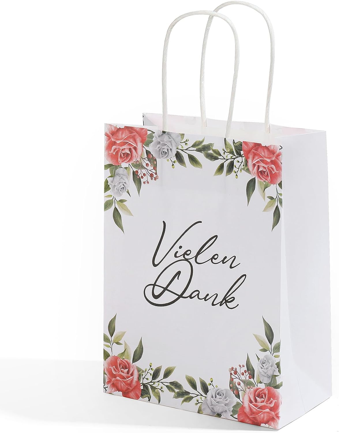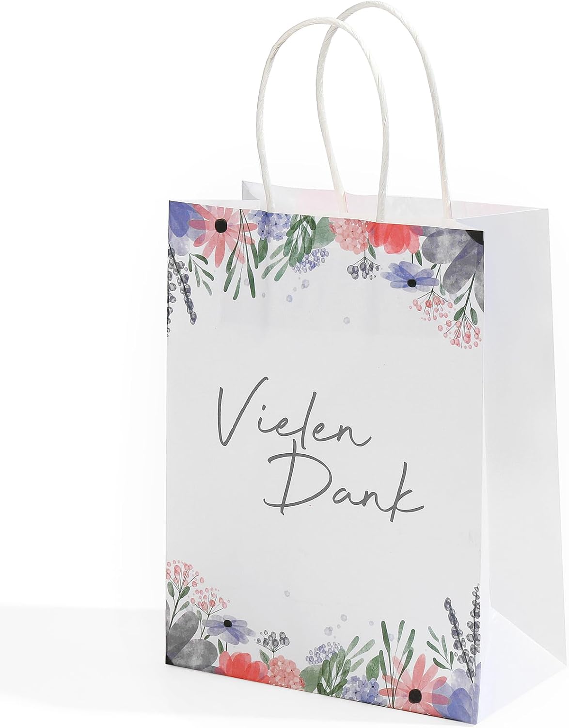 Contenuto della confezione: Di' "Grazie" in un modo molto speciale con il nostro set di 24 sacchetti regalo con manici. Materiale: i sacchetti sono realizzati in solida carta kraft bianca da 120 g/m², piacevole al tatto. Dimensioni: Le borse hanno una dimensione di 21 x 16 x 8 cm. Caratteristiche del prodotto: I sacchetti regalo sono stampati con quattro diversi motivi floreali. Le borse sono molto stabili e riutilizzabili. Utilizzo: questo set è adatto per Natale, compleanni, feste aziendali, matrimoni e molte altre occasioni. Puoi usarlo sia in ambienti privati che aziendali.