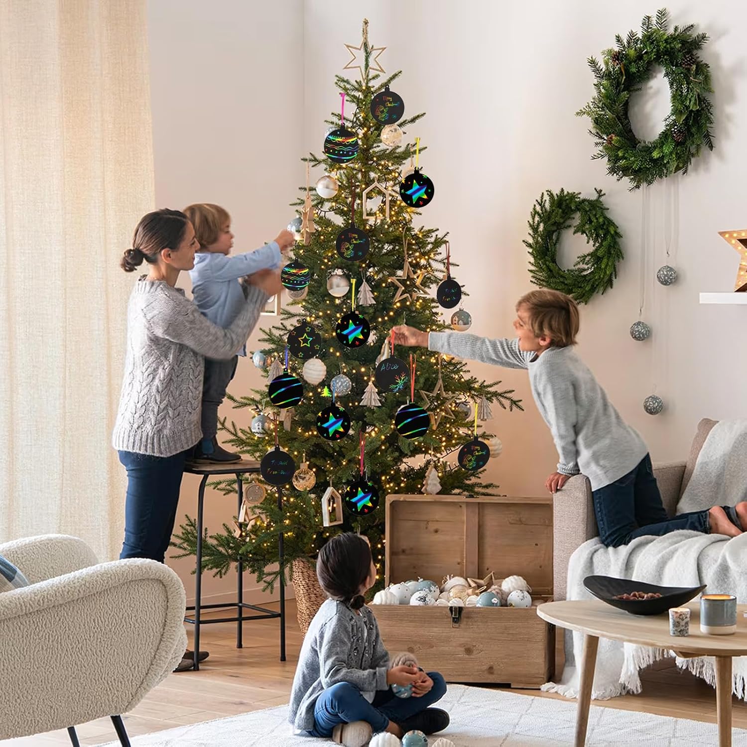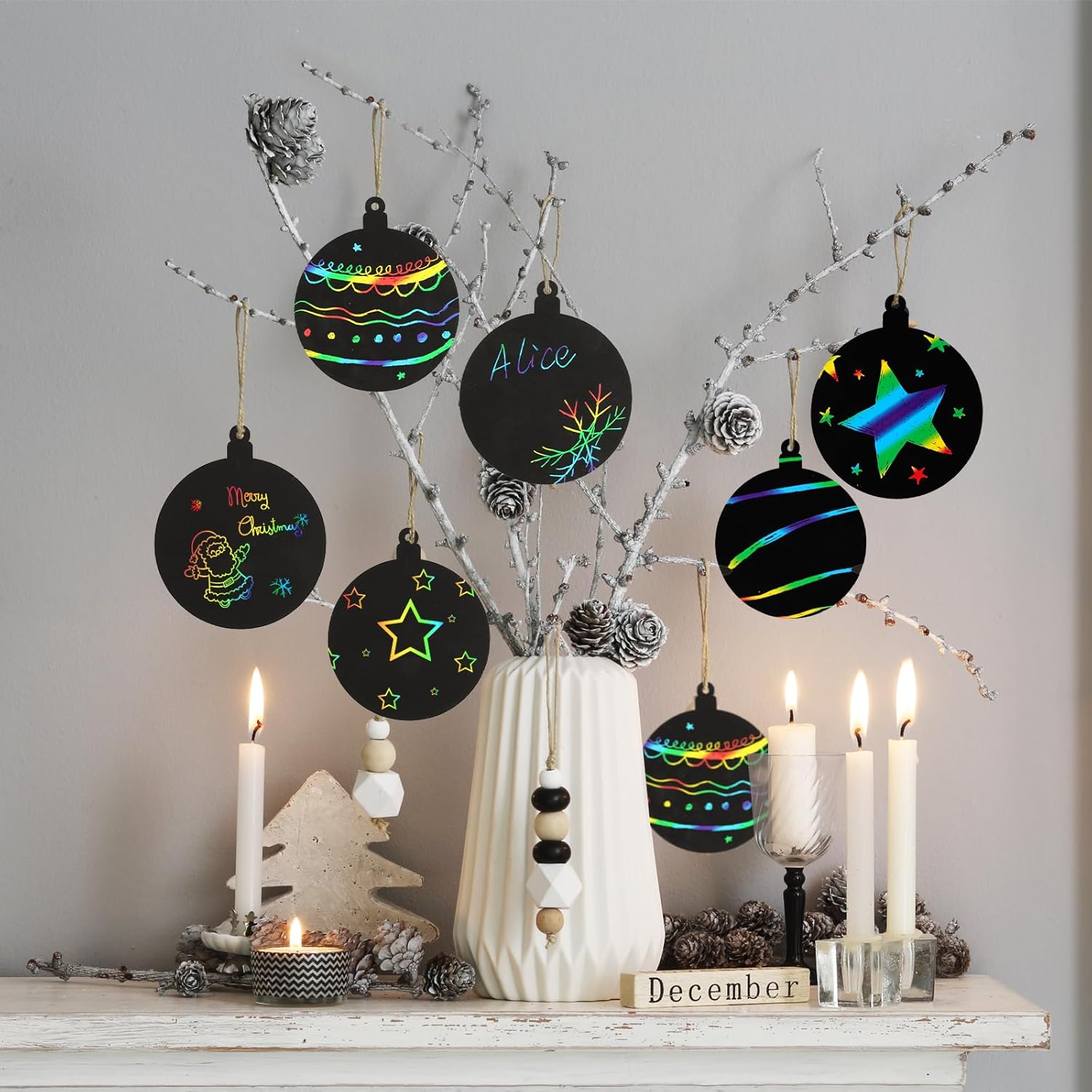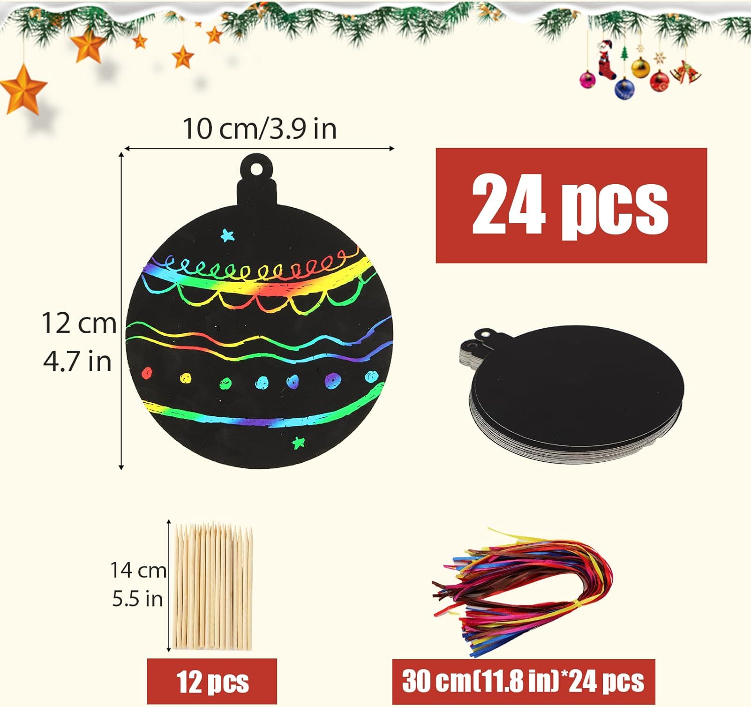 【Il pacchetto include:】24 pz di scratch art di Natale, 24 pz di nastro colorato e 12 pz di stilo di bambù. 【Materiale:】Lo scratch art di Natale è realizzato in carta. Lo stilo è realizzato in bambù. 【Misura:】Lo scratch art di Natale è di circa 10 x 11.9cm. La lunghezza dello stilo di bambù è di circa 14cm. 【Design:】Lo scratch art di Natale è a forma di palline di Natale. Graffiare la superficie nera con lo stilo di bambù, rivelerà lo sfondo multicolore. Lo scratch art può essere usato con nastri come ciondoli o segnalibri. Usa la tua immaginazione ed ispirazione per raschiare i motivi che desideri! 【Ideale:】È un prodotto perfetto come premio, omaggio ed idee regalo per portare la sorpresa e la gioia ai bambini ed adulti. È adatto per Avvento, Natale, Capodanno, Carnevale, inverno, festa a tema, ecc.