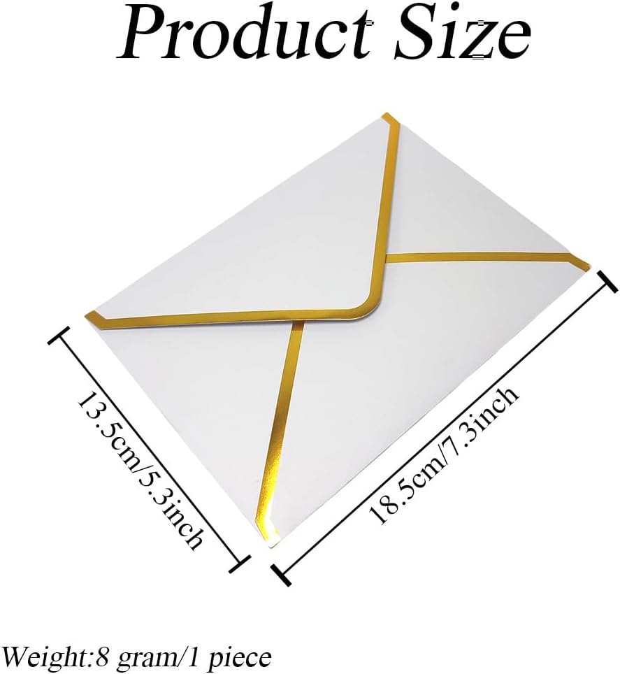 Colore: Bianco; Dimensioni: 13,5 x 18,5 cm (lunghezza x altezza); Peso: 8 grammi (1 pezzo); Materiale: carta Contenuto della confezione: riceverai 25 buste bianche da 12,7 x 17,8 cm con bordo dorato Materiale del prodotto: realizzate in carta spessa, queste buste sono eleganti e offrono una sensazione liscia e lussuosa. La carta assicura che il contenuto rimanga protetto durante la spedizione offrendo un aspetto professionale e raffinato Facile da usare: bagnare la colla con un po' d'acqua sull'area di tenuta della busta, quindi piegare il sigillante e tenerlo premuto per un po 'circa 60 secondi, la busta dell'invito sarà sigillata ermeticamente Ampia gamma di applicazioni: adatto per una vasta gamma di occasioni, tra cui matrimoni, lauree, corrispondenza aziendale e inviti di compleanno. Con una dimensione di 13,5 x 18,5 cm, si adattano alla maggior parte dei biglietti standard da 13,5 x 7, rendendoli una scelta ideale per spedire inviti, note di ringraziamento