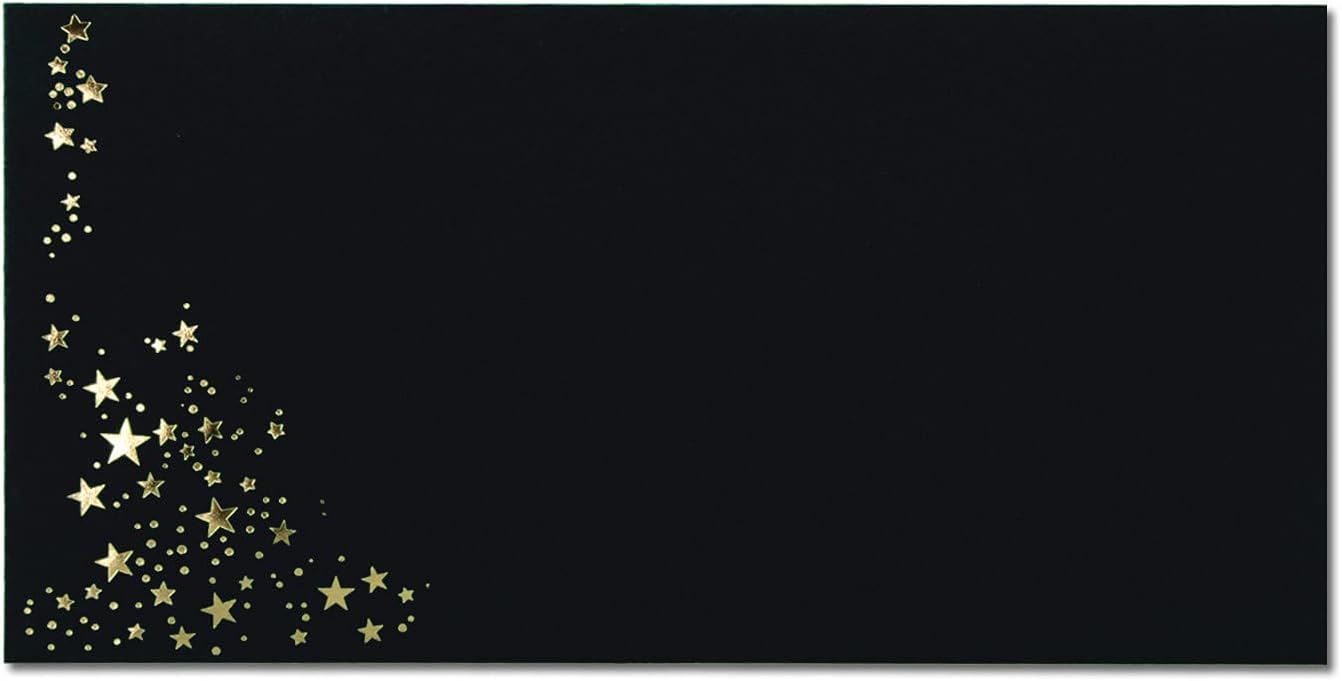 Scegli tra il colore della busta e il colore delle stelle metallizzate. Una busta ideale per occasioni festive, posta di Natale, inviti di matrimonio e molto altro ancora Colore copertina: nero - stelle metallizzate: oro Formato: DIN lungo – Dimensioni: 110 x 220 mm – Grammatura: 120 g/m² – con incollaggio a umido e lembo di chiusura appuntito Il colore opaco della busta in colore uniforme si armonizza splendidamente con le stelle goffrate in pellicola metallica, che brillano a seconda della luce. Questa busta risalta al primo sguardo e rende curiosità e gioia per il contenuto. Contenuto: 25 buste – Fabbricazione, spedizione e vendita dalla Germania. - Neuser: il professionista dei biglietti dal 1915