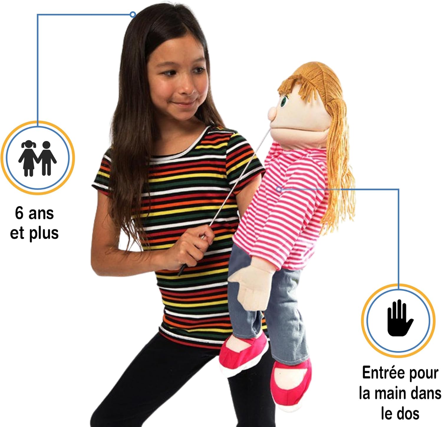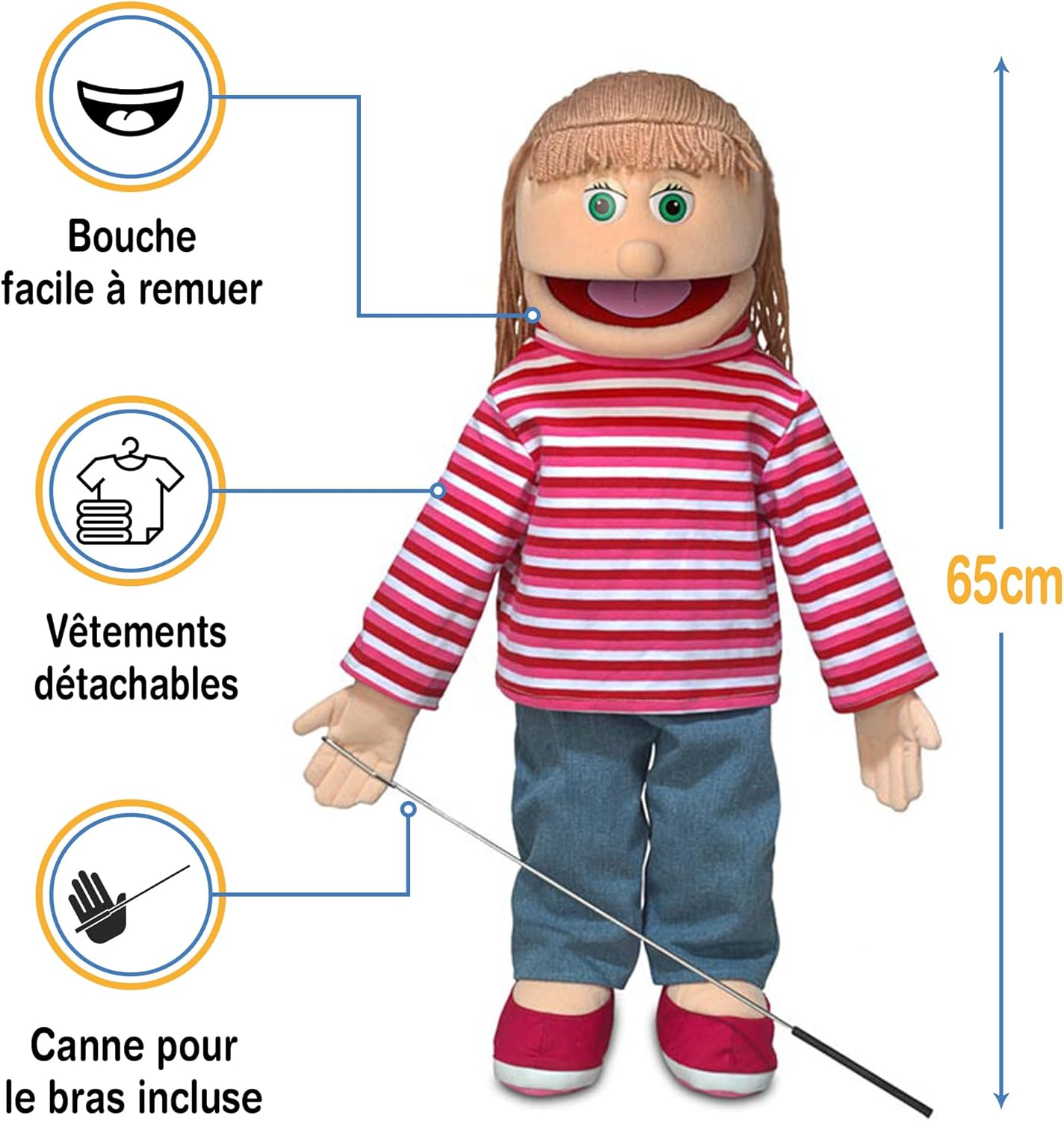 Burattino ventriloquo di alta qualità realizzato da Silly Pups. Bocca facile da muovere. Ingresso manuale dal retro del burattino. Include 1 asta di controllo del braccio che può essere agganciata a entrambe le mani per il movimento. Altezza: circa 65 cm. Peso leggero: ca. 500 g. Il pupazzo può essere vestito con abiti per bambini dai 18 mesi in su.